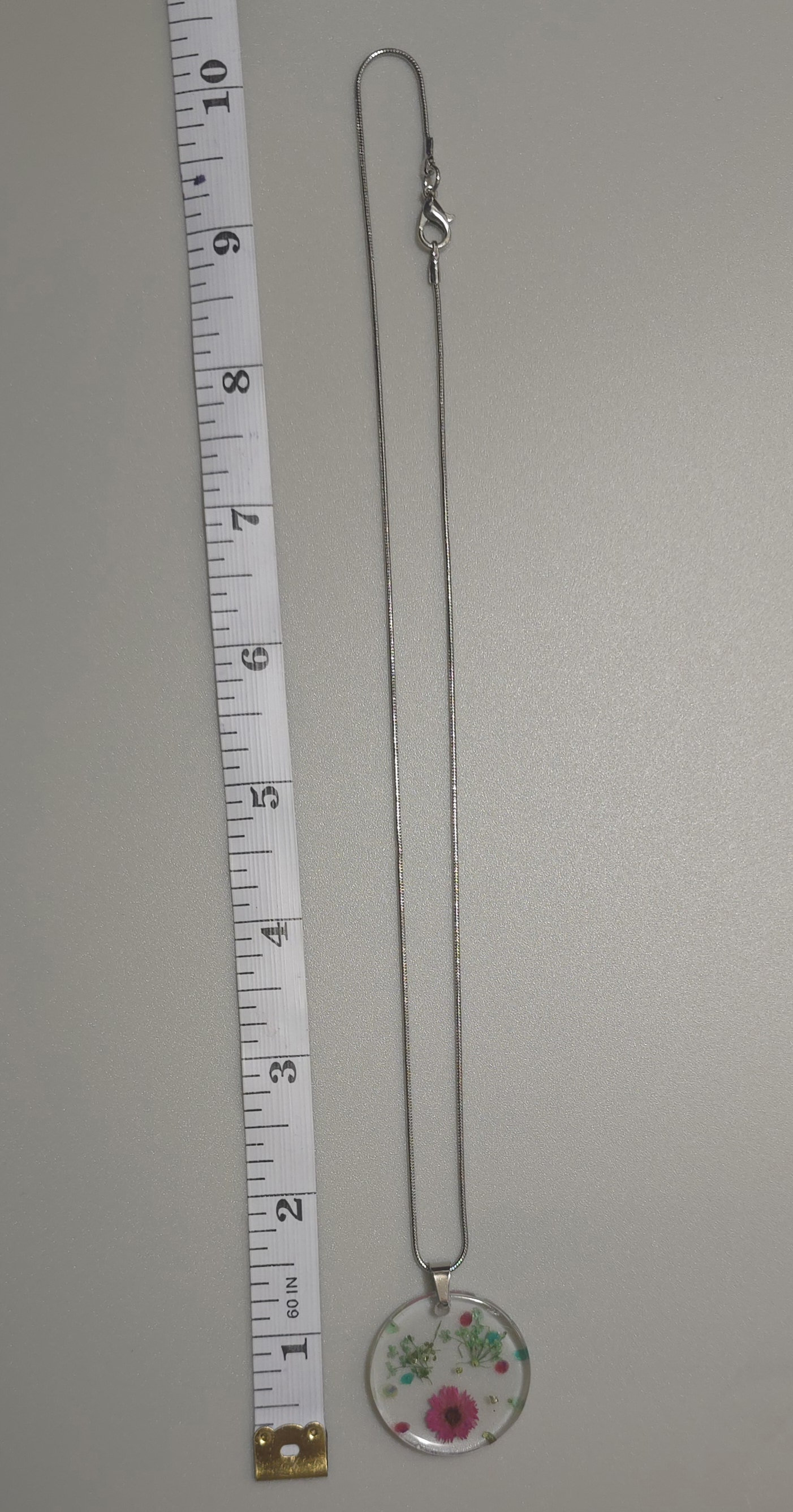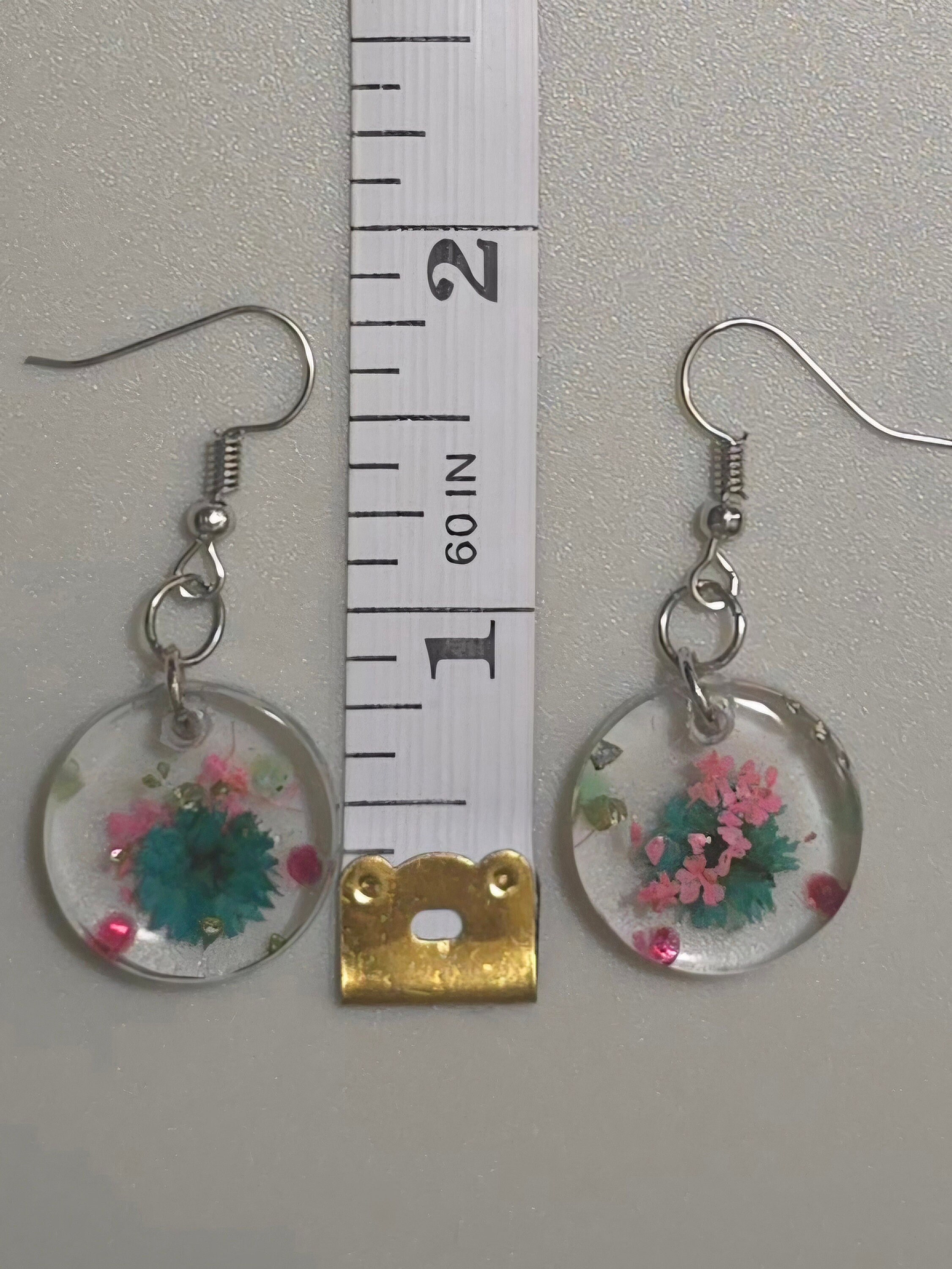 This gorgeous necklace and earring set features real dried flowers encased clear epxoy resin. Each pendant is circular in shape and has accents placed expertly in order to showcase the flowers inside. The earring showcase a single green flower, while the necklace pendant features a single pink flower encased in premium epoxy resin. Made with stainless steel hooks and jumperings. The necklace is a stainless steel snake chain with lobster clasp. The necklace in this set is 47cm long, with a drop length of 26.5cm (including the pendant). Necklace pendent is 3cm long by 3cm wide (at widest point of pendant). The earrings are 4cm long, with a drop length of 2.5cm. Resin pendants in this set are 2cm long by 2cm wide (at widest point of pendant).