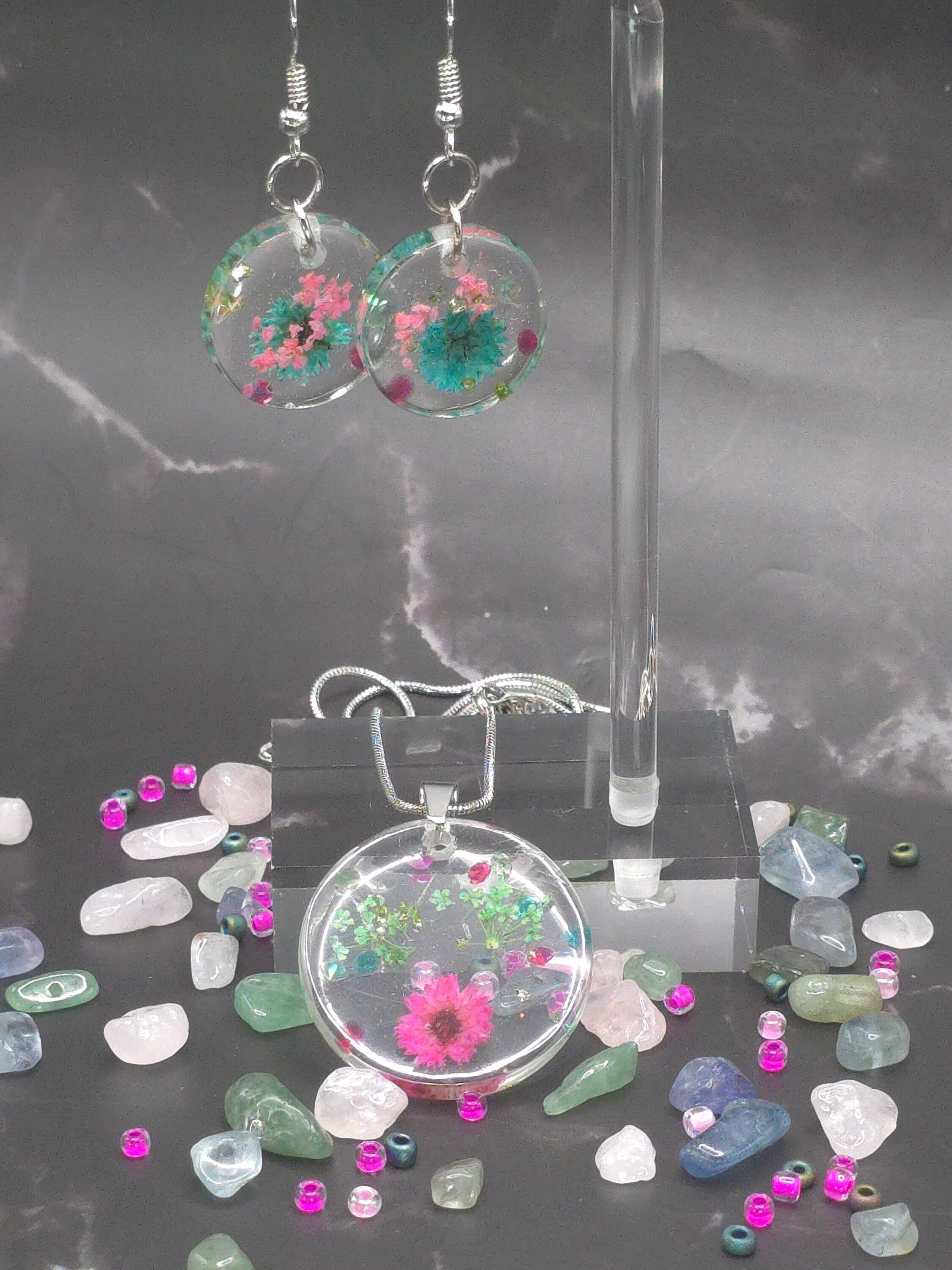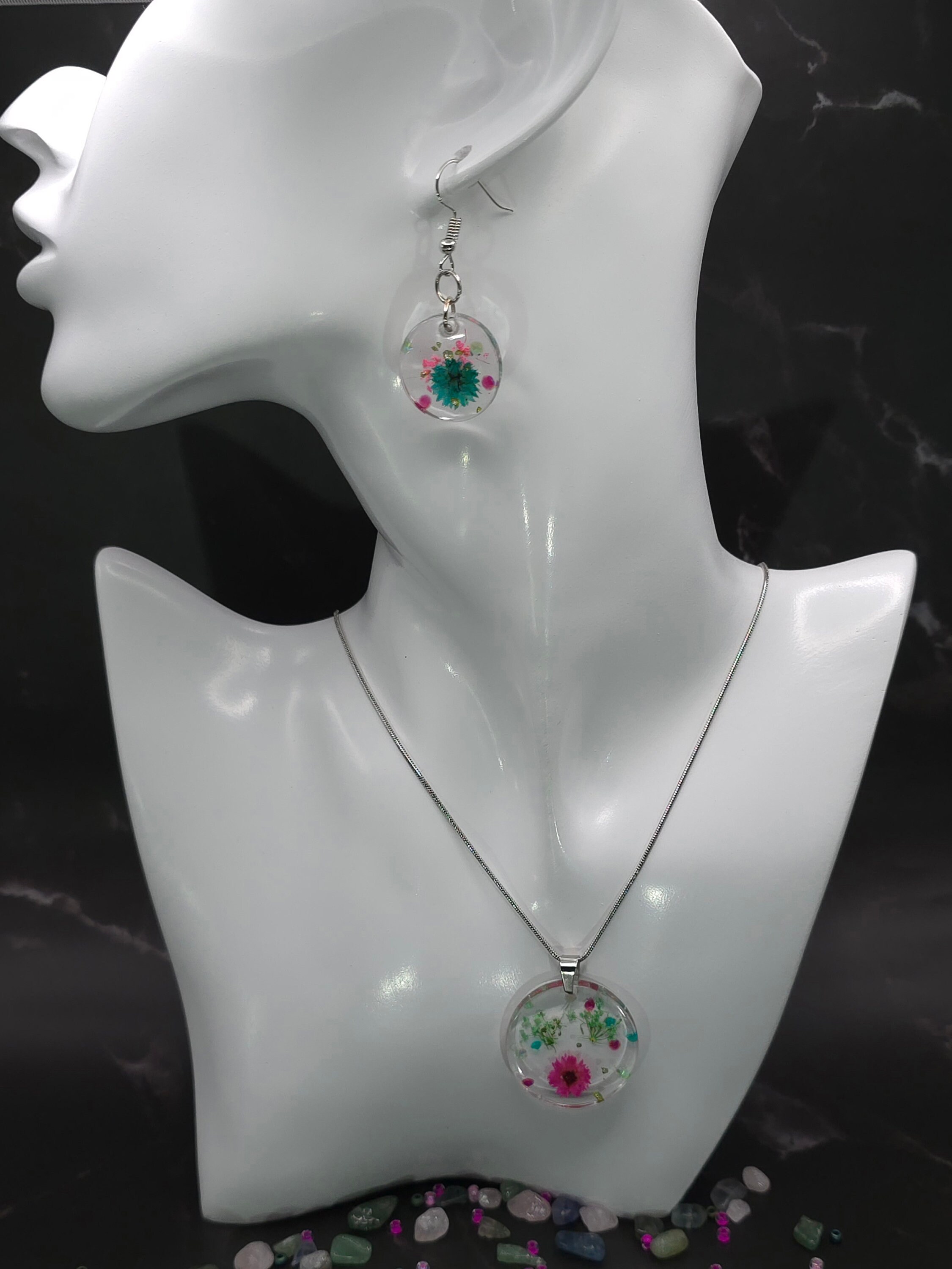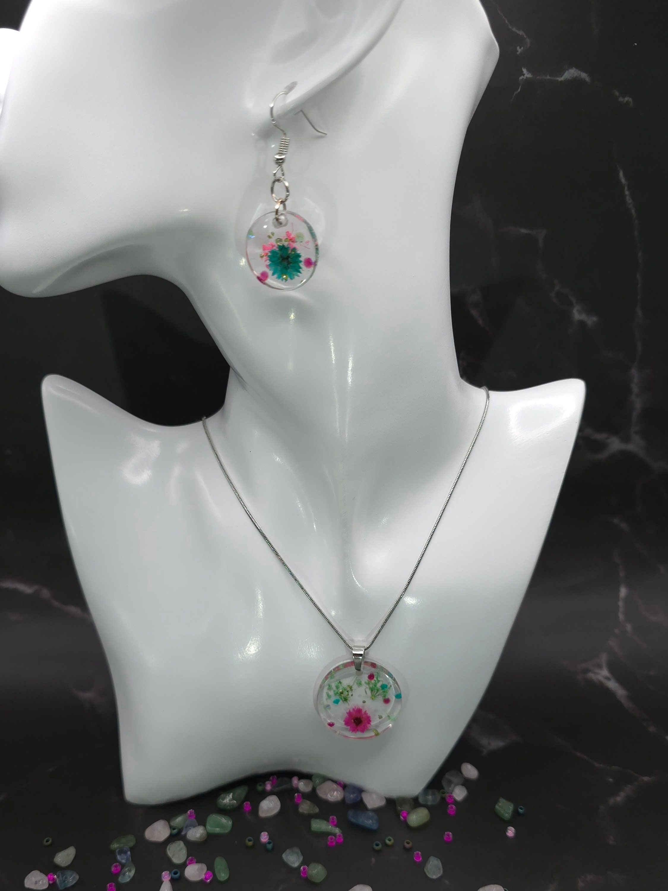 Dried Flower Resin Pendant Jewelry Set: Stainless Steel Necklace and Earring Set