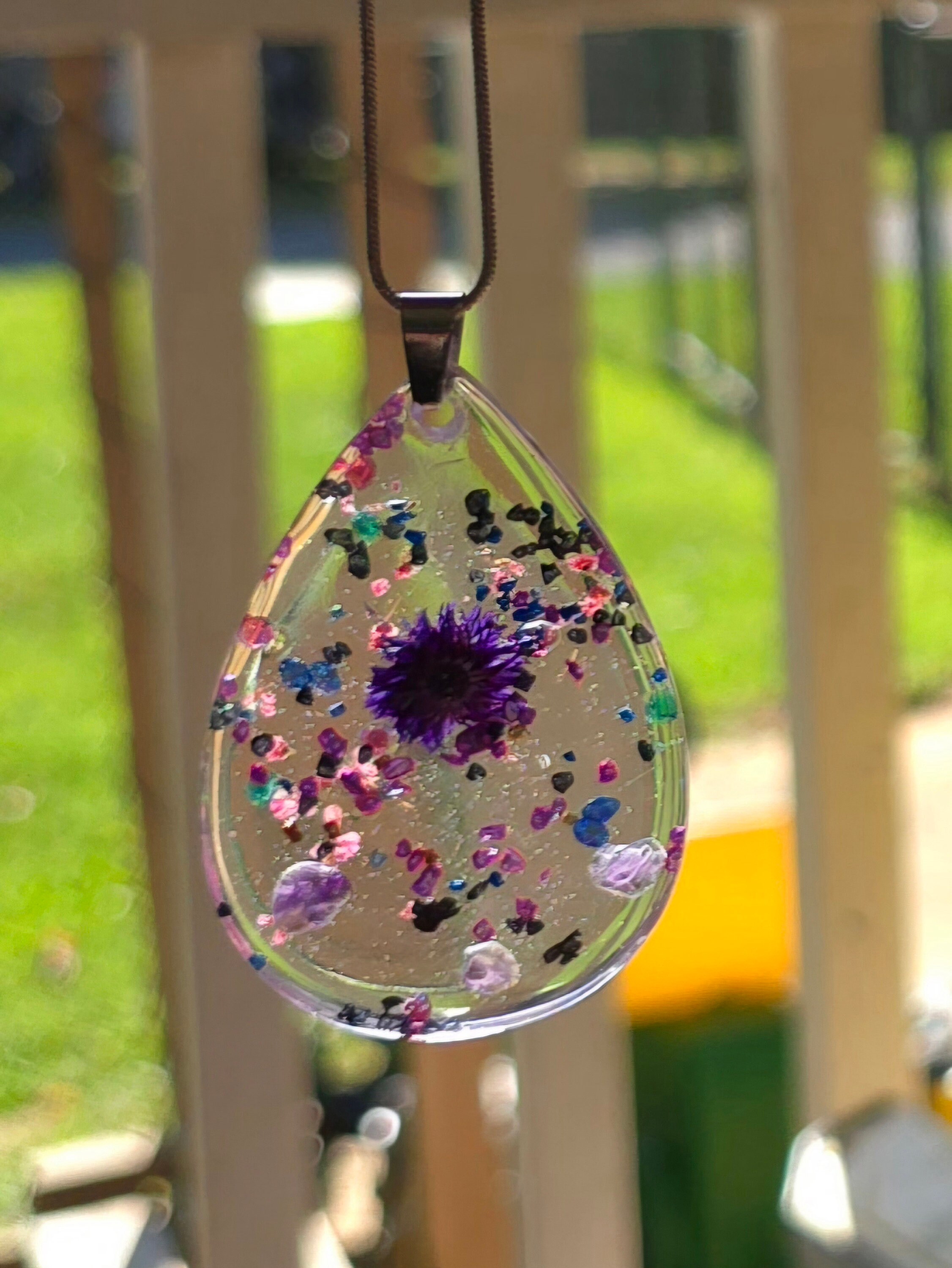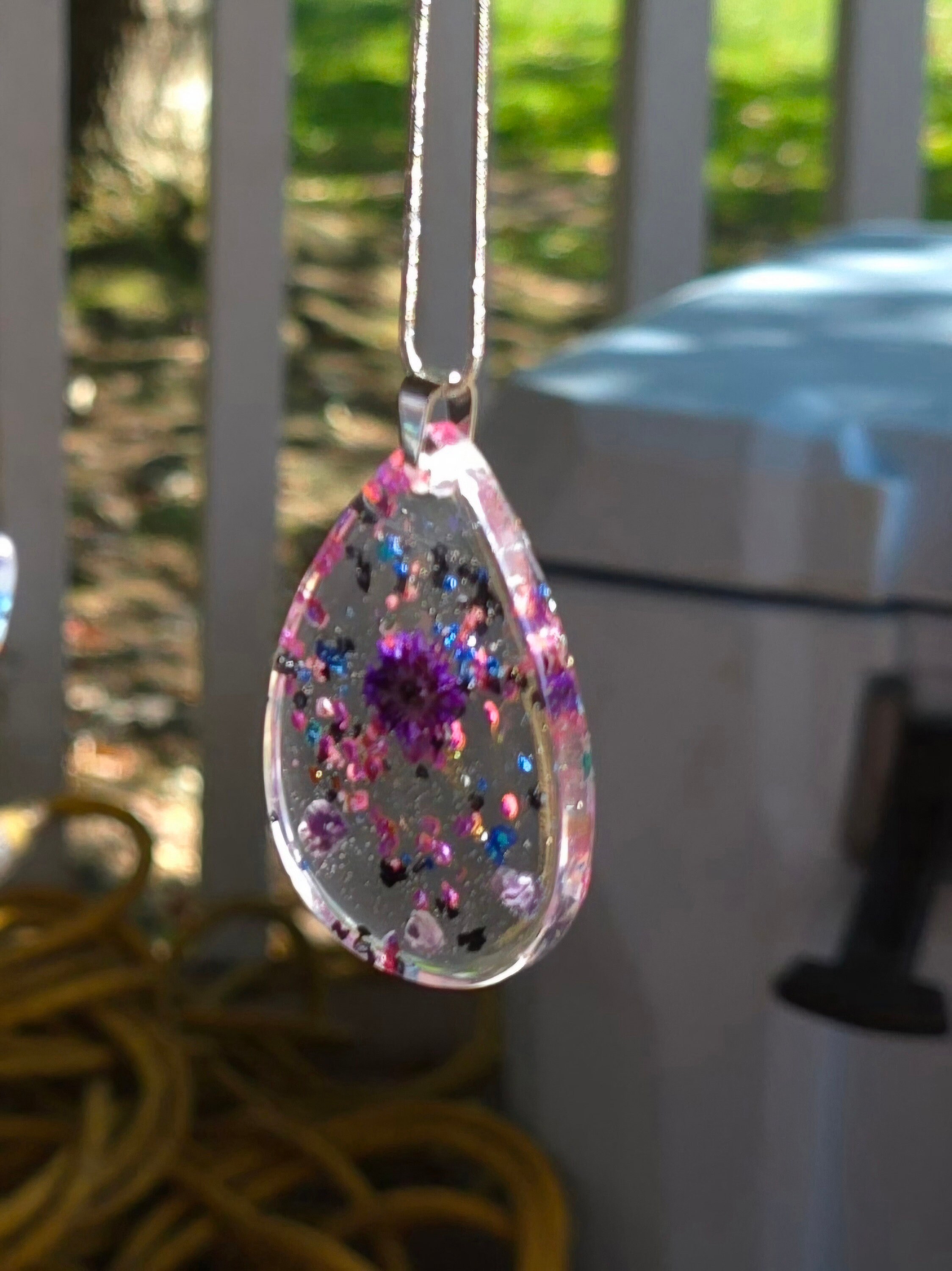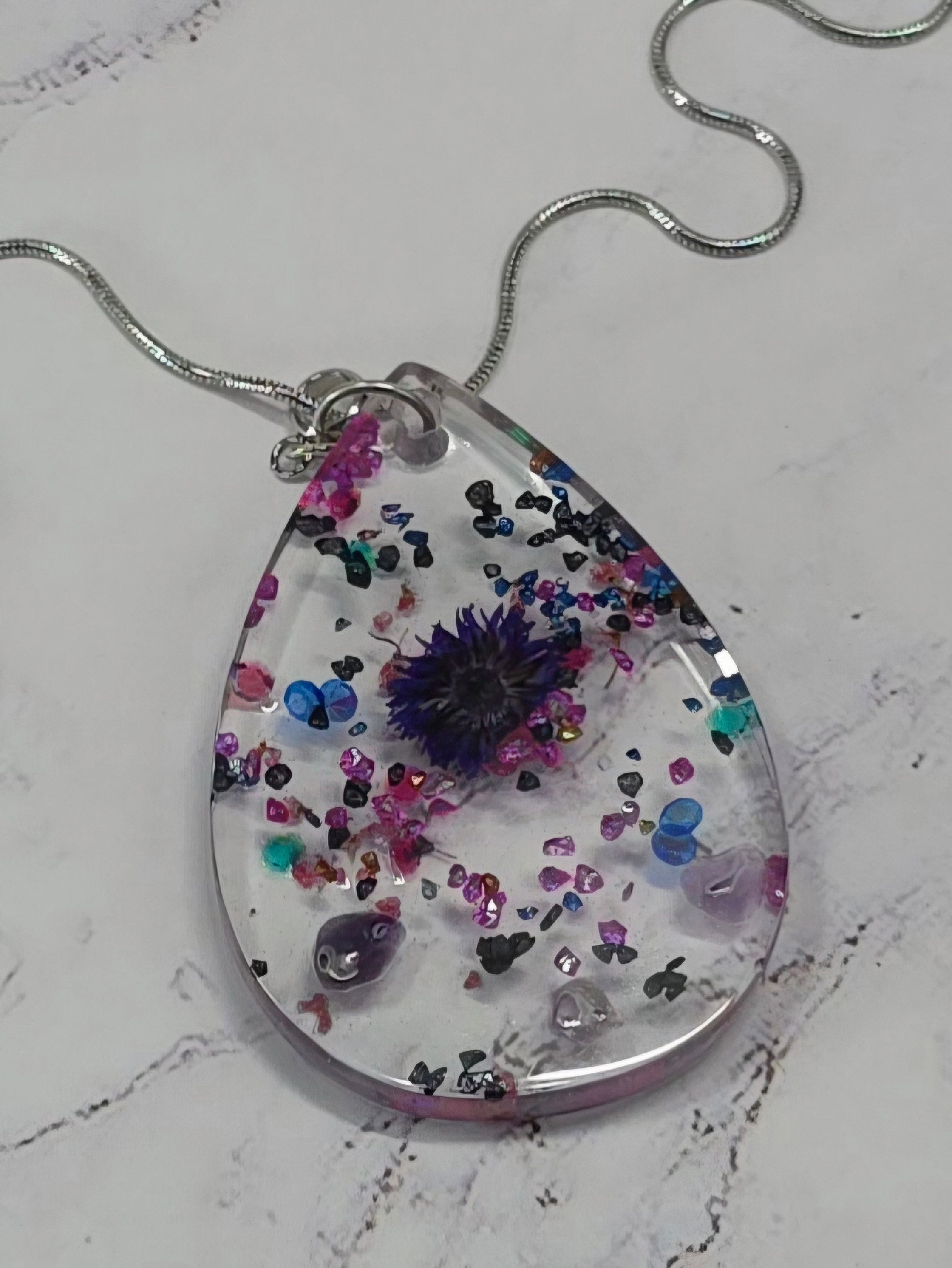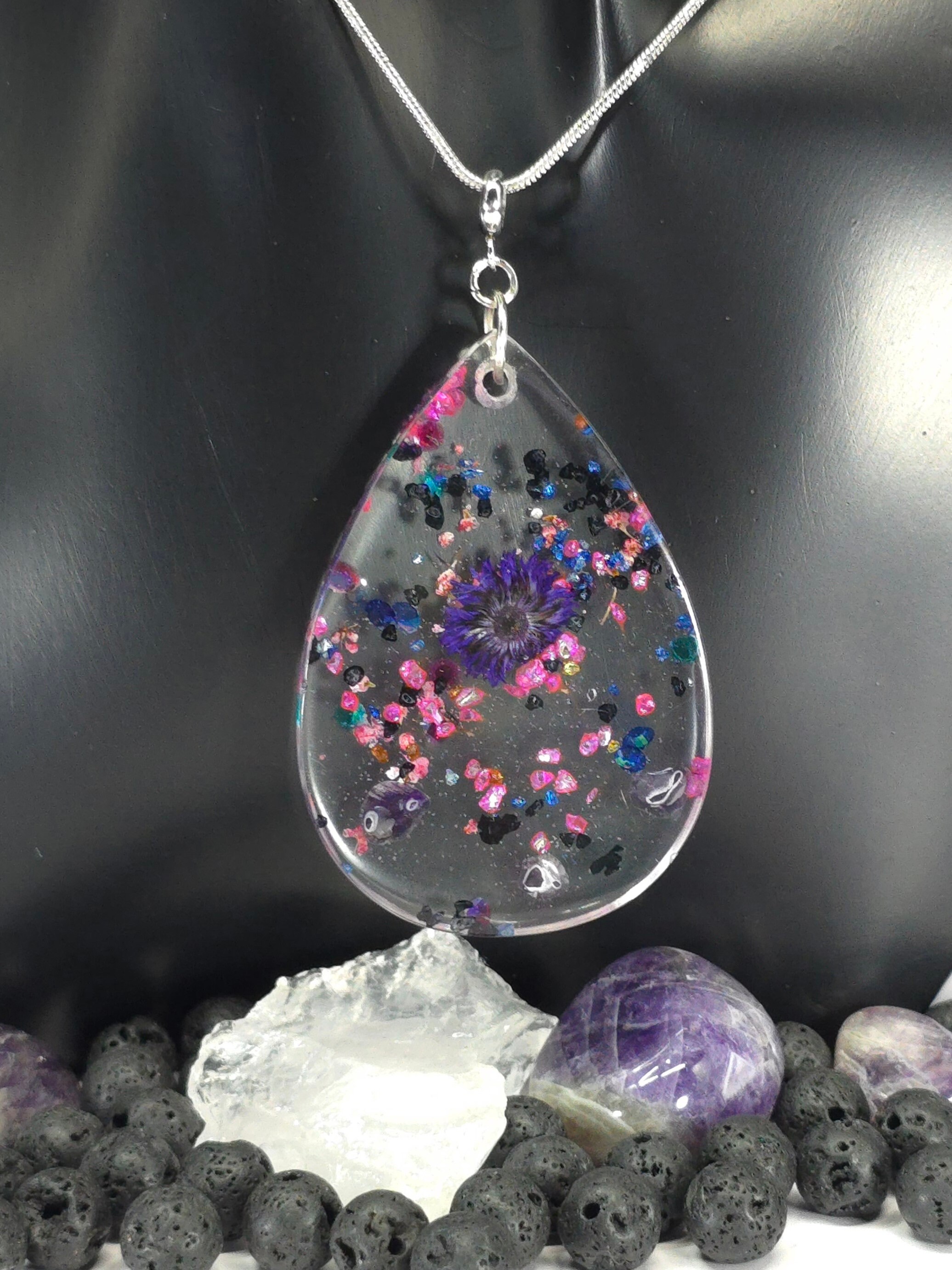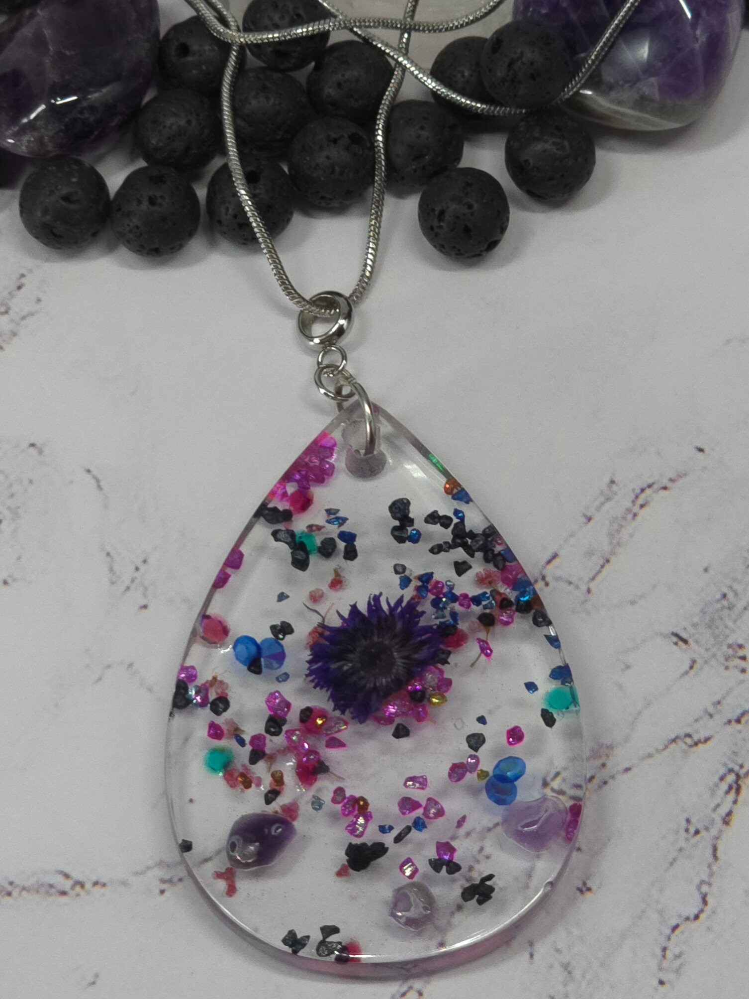 Purple Dried Flower Tear Drop Resin Pendant: Stainless Steel Snake Chain Necklace