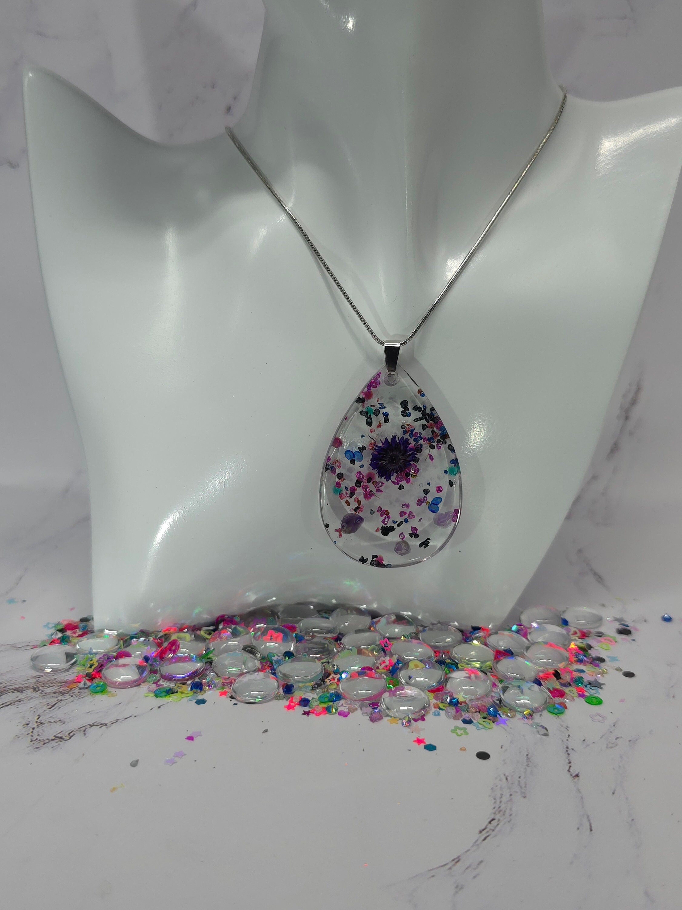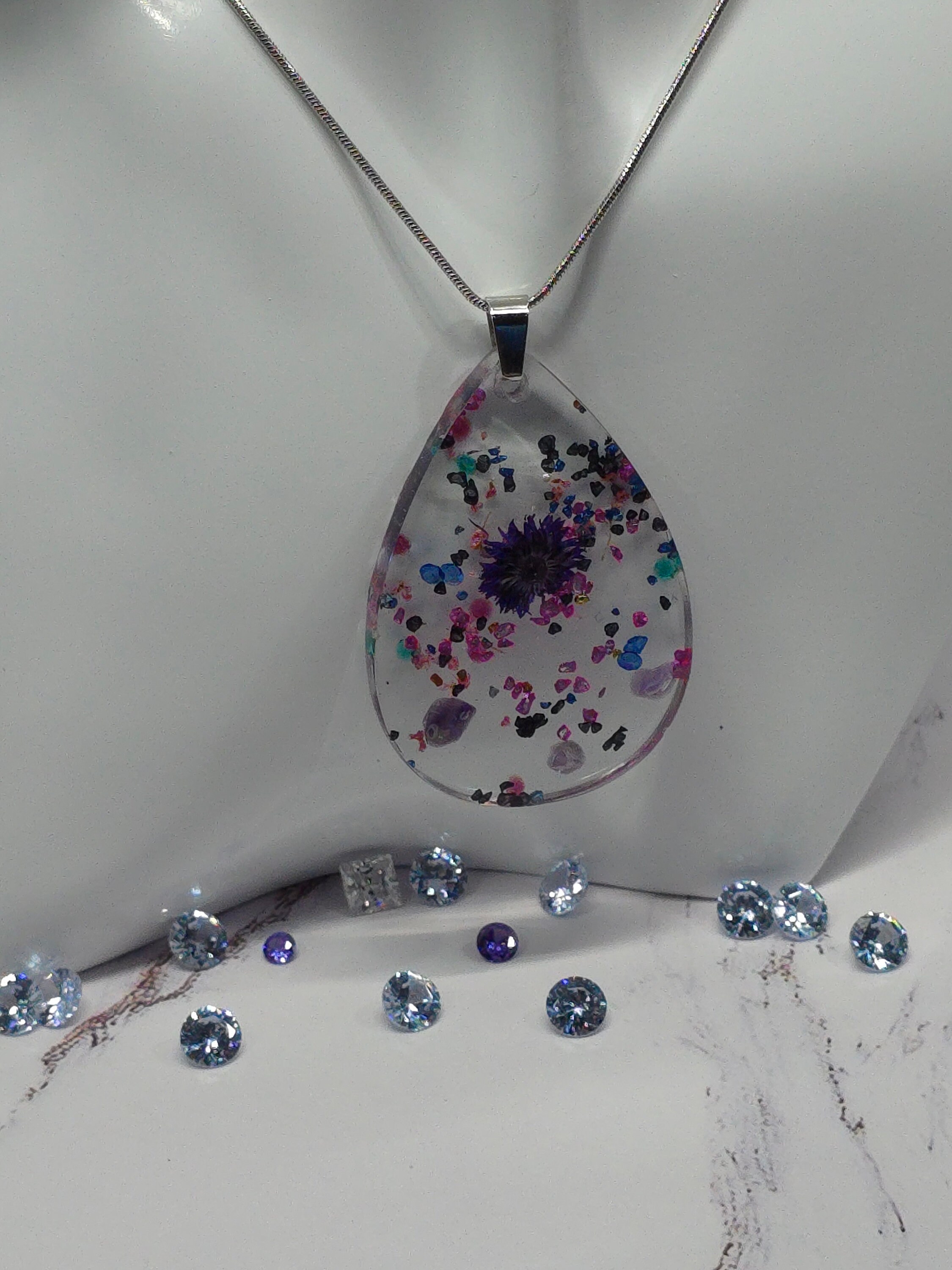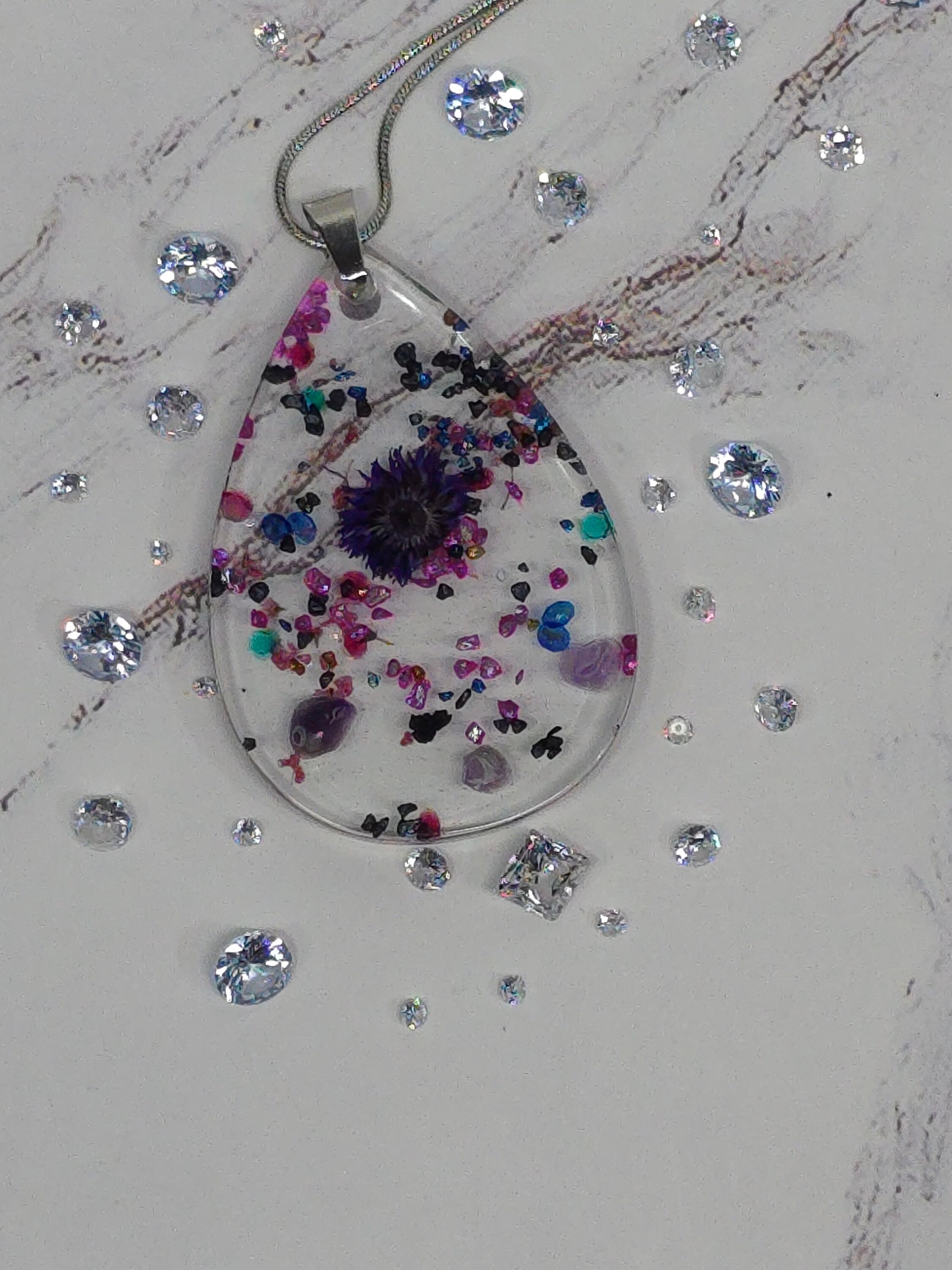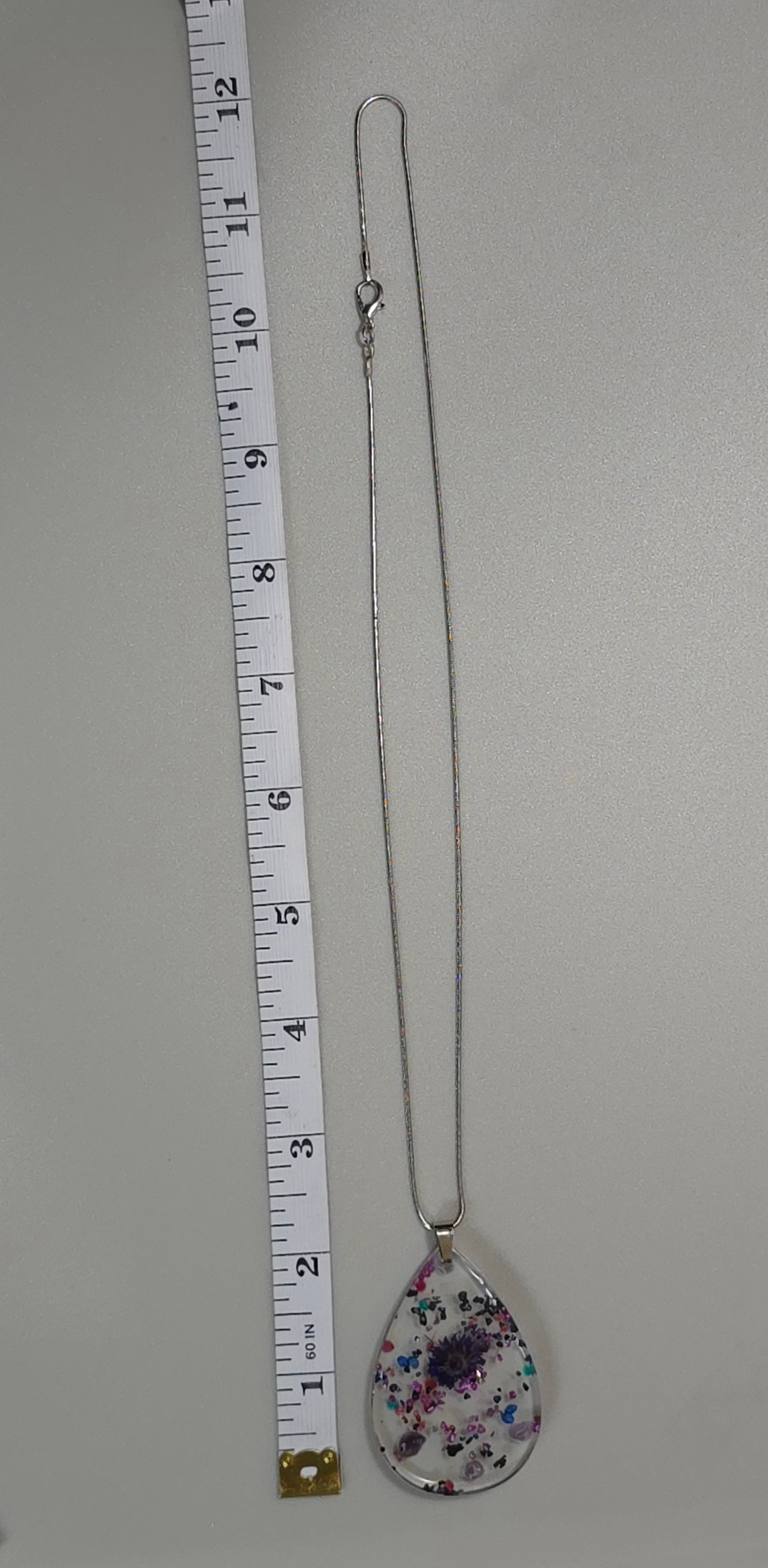 Show stopper piece! Made with a stainless steel snake chain necklace and lobster clasp. The teardrop pendant is made with clear epxoy resin. A beautiful real purple flower perfectly placed in the bottom center of pendant, and surrounded by purple, blue, and pink colored gems, stones and flakes. This necklace is 51cm long, with a drop length of 31cm (including teardrop pendants). Resin teardrop pendant is 5.5cm long by 3.5cm wide (at widest point of pendant).