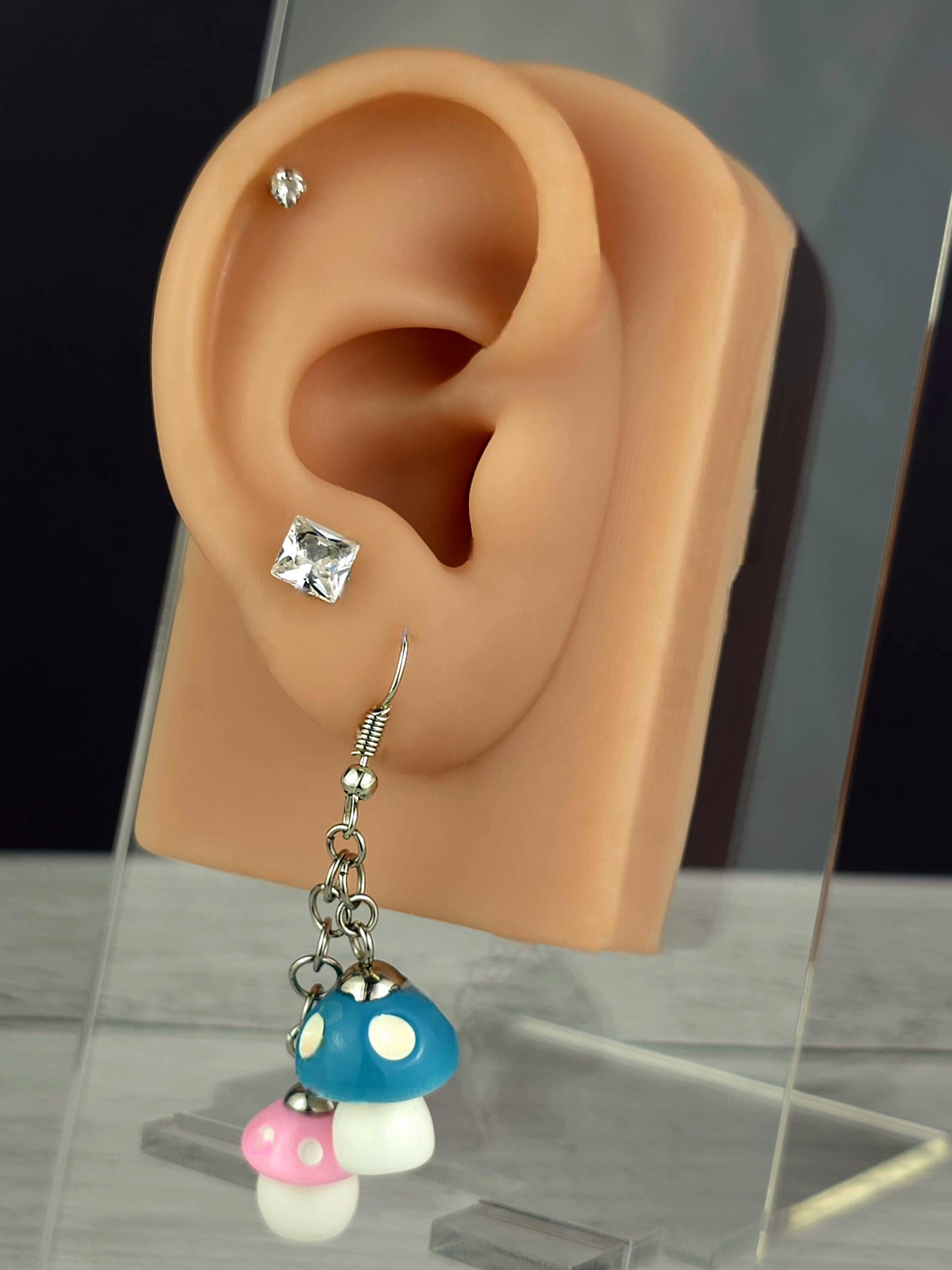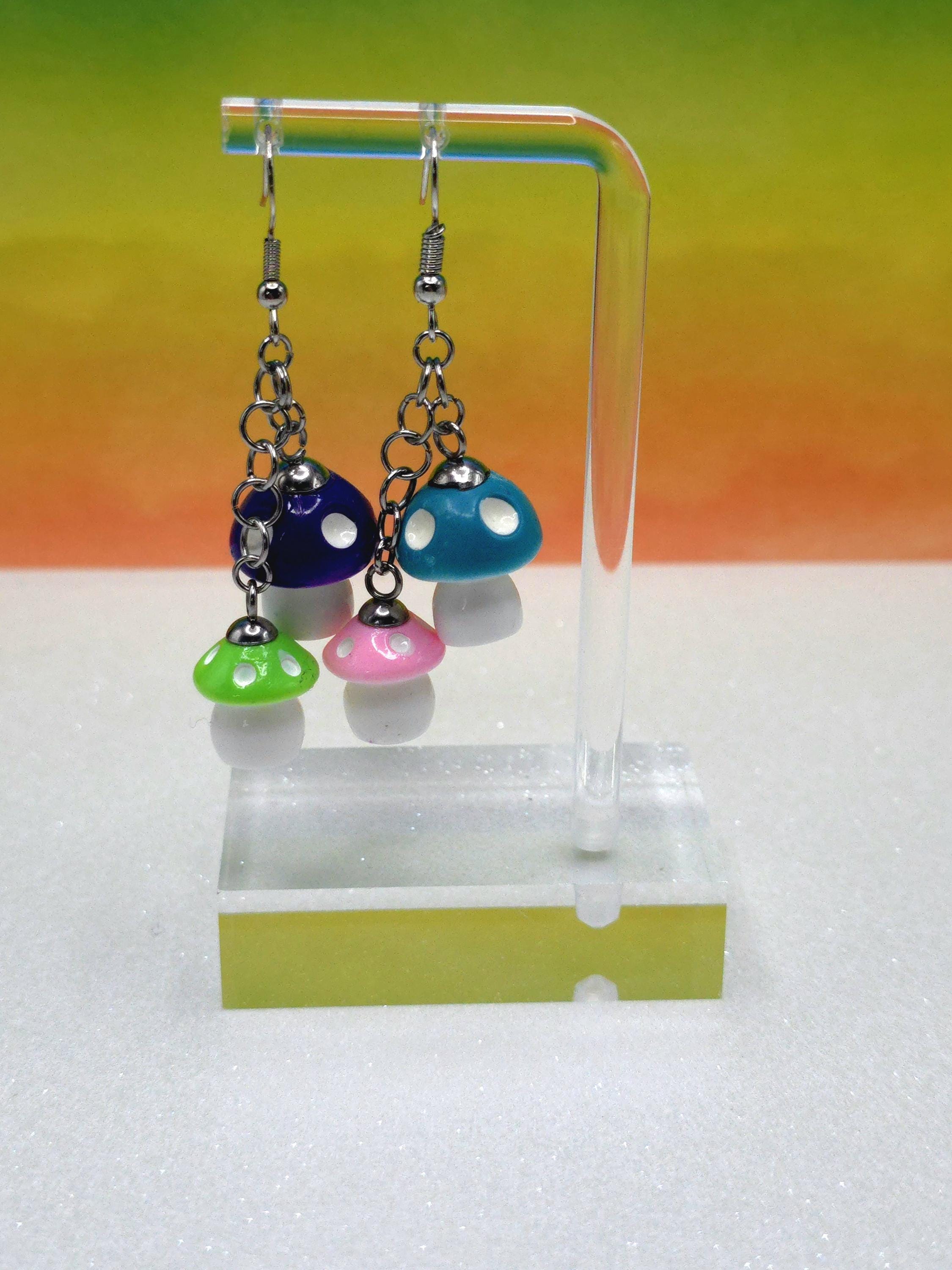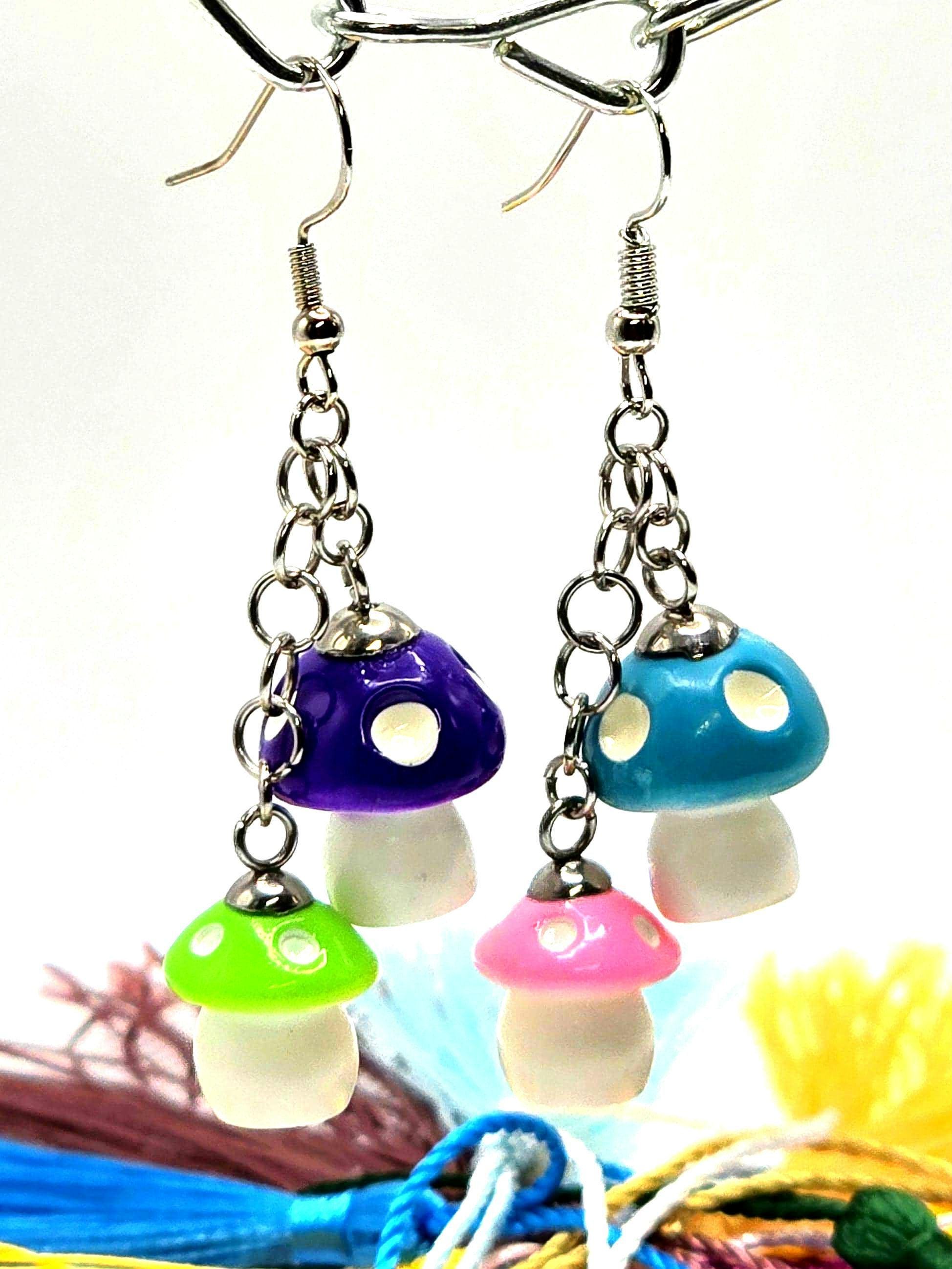 These stunning hook style earrings are crafted with high-quality stainless steel materials, ensuring durability and lasting shine. Each pair features one large mushroom and one small mushroom hanging from 2 layered stainless steel chains. These earrings feature a large blue and purple mushroom, and a small pink and green mushroom. These unique mismatch multicolor mushroom earrings feature a total length of 6cm, with a drop length of 4cm. The bigger charms are 1.5cm long by 1.5 wide (at the widest point of charm). The smaller charms are 1cm long by 1cm wide (at the widest point of charm). Add a touch of whimsy to your outfit with these unique and eye-catching earrings. Perfect for any occasion. A must have for all us mushroom lovers.