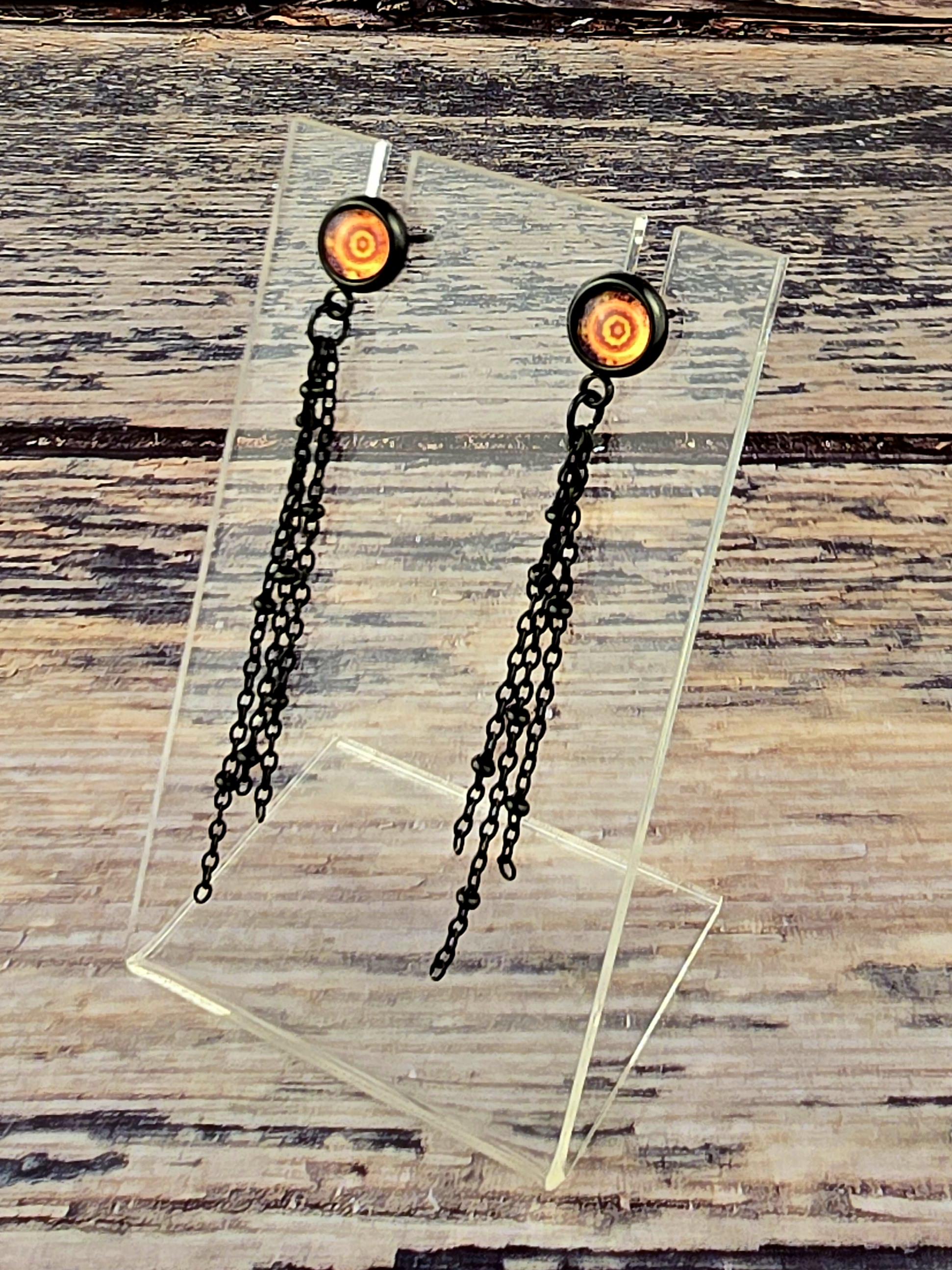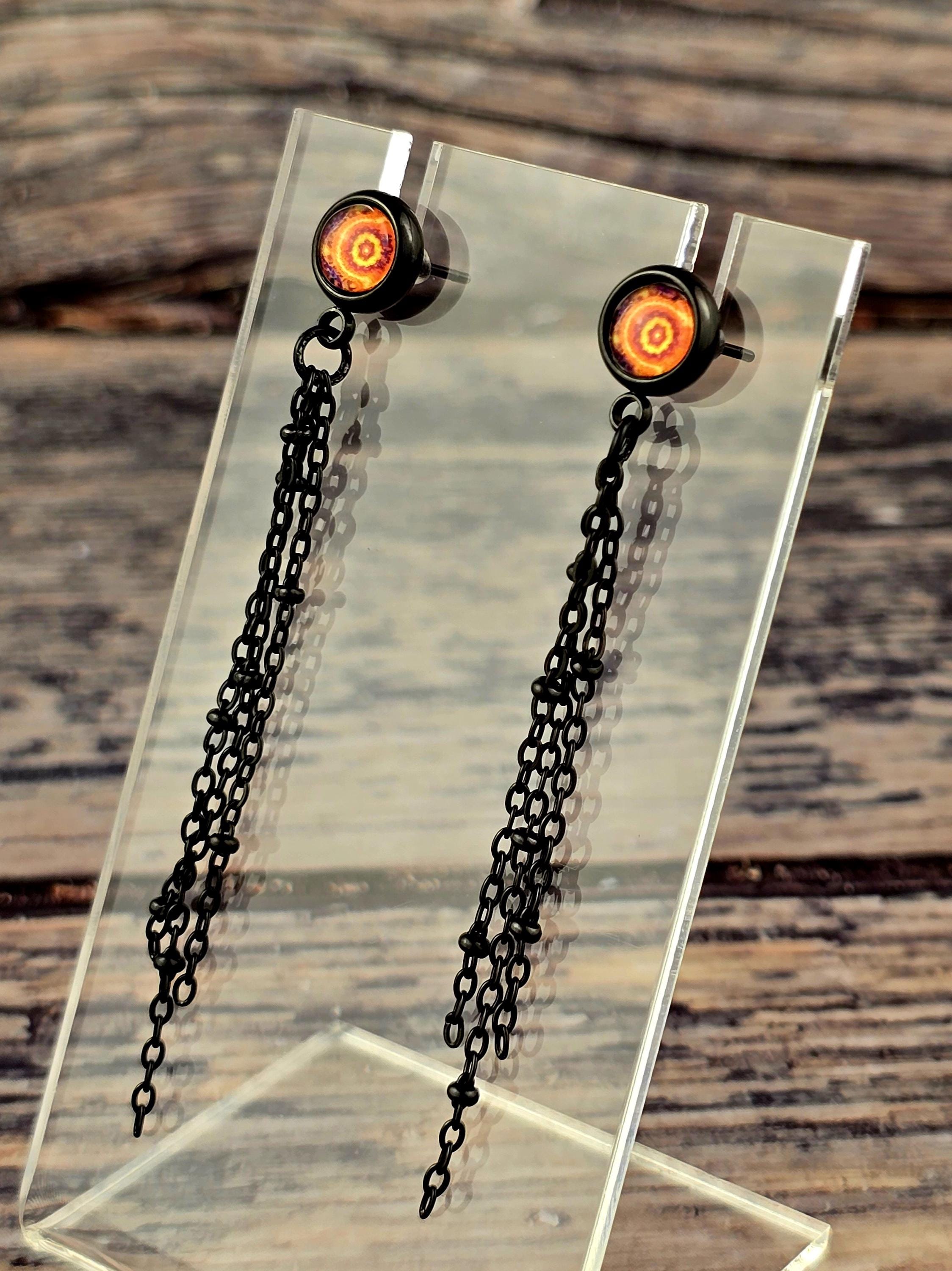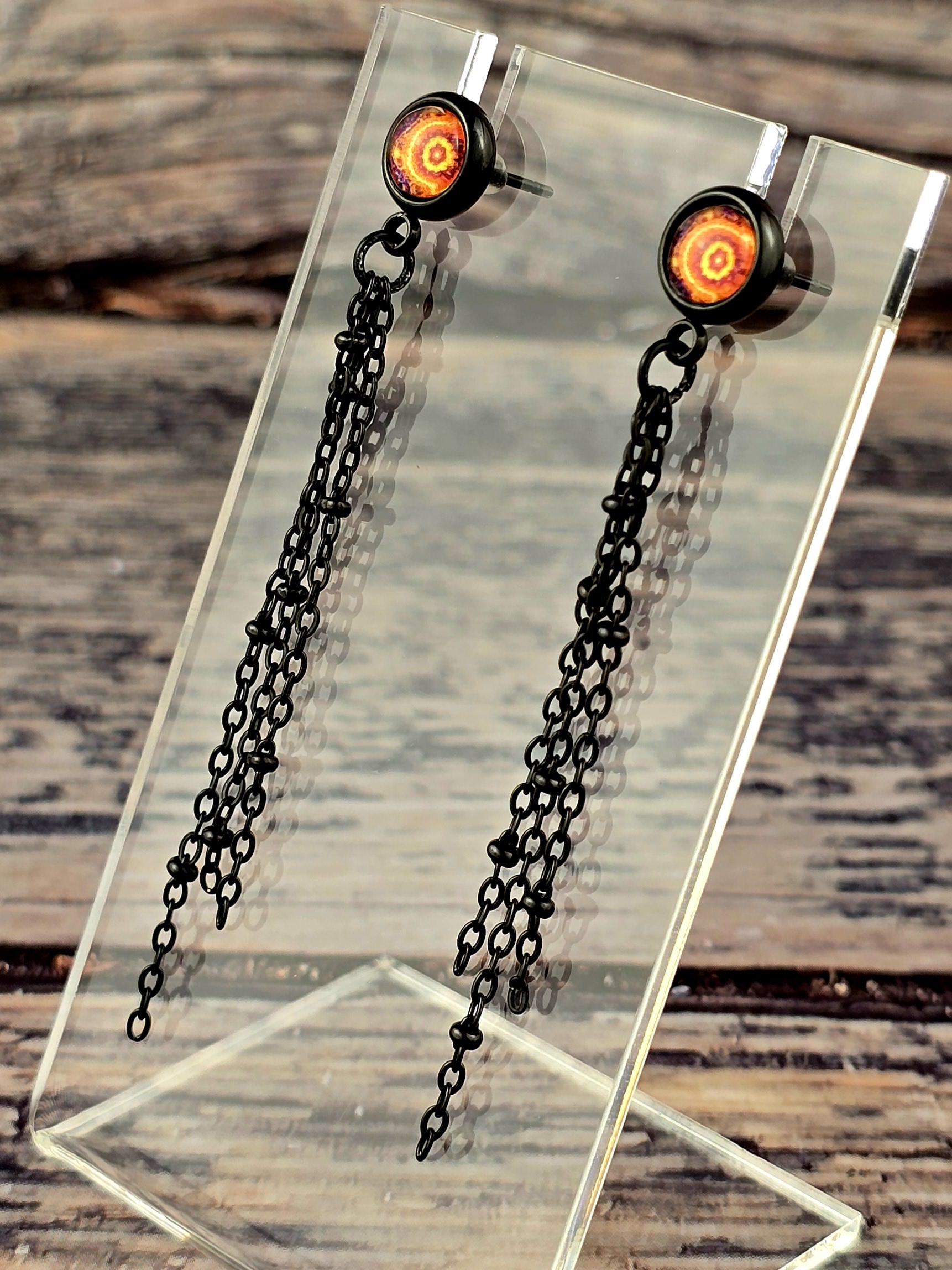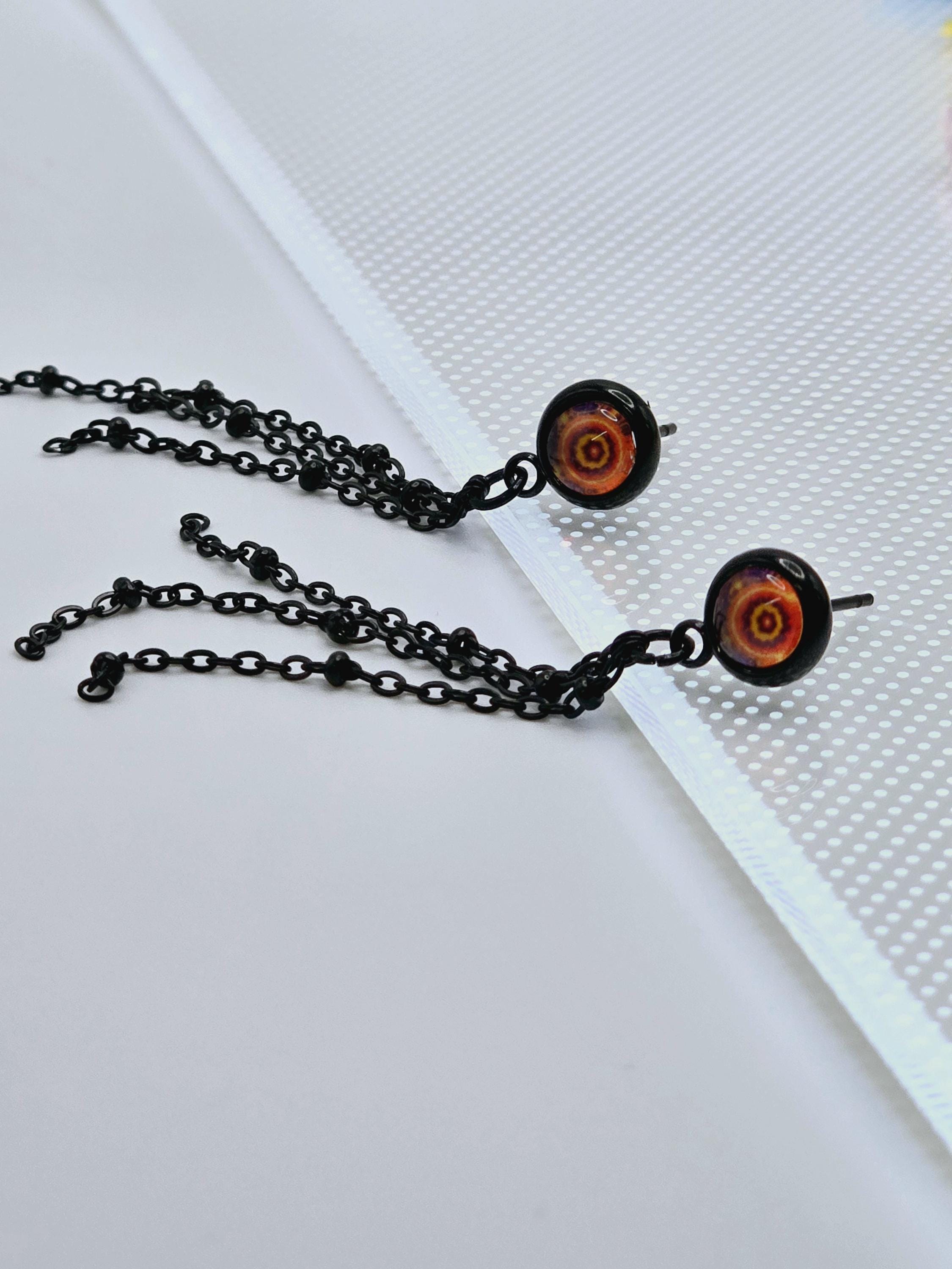 Add a touch of edgy sophistication to your look with these stunning dangle earrings. Made with black stainless steel stud earrings featuring a cabochon setting bezel and a loop for extra flair, these earrings are sure to make a statement. Each earring boasts 3-5cm black beaded stainless steel chains hanging from the bezel loop, adding movement and intrigue to the design. The focal point of these earrings is the vibrant glass orange kaleidoscope style spiral cabochon insert, which adds a pop of color and visual interest. Elevate your outfit with these unique and stylish earrings that are perfect for any occasion. These earrings are 5.5cm long, with a drop length of 5cm. Post studs are 8mm round cabochon trays with colorful glass dome.