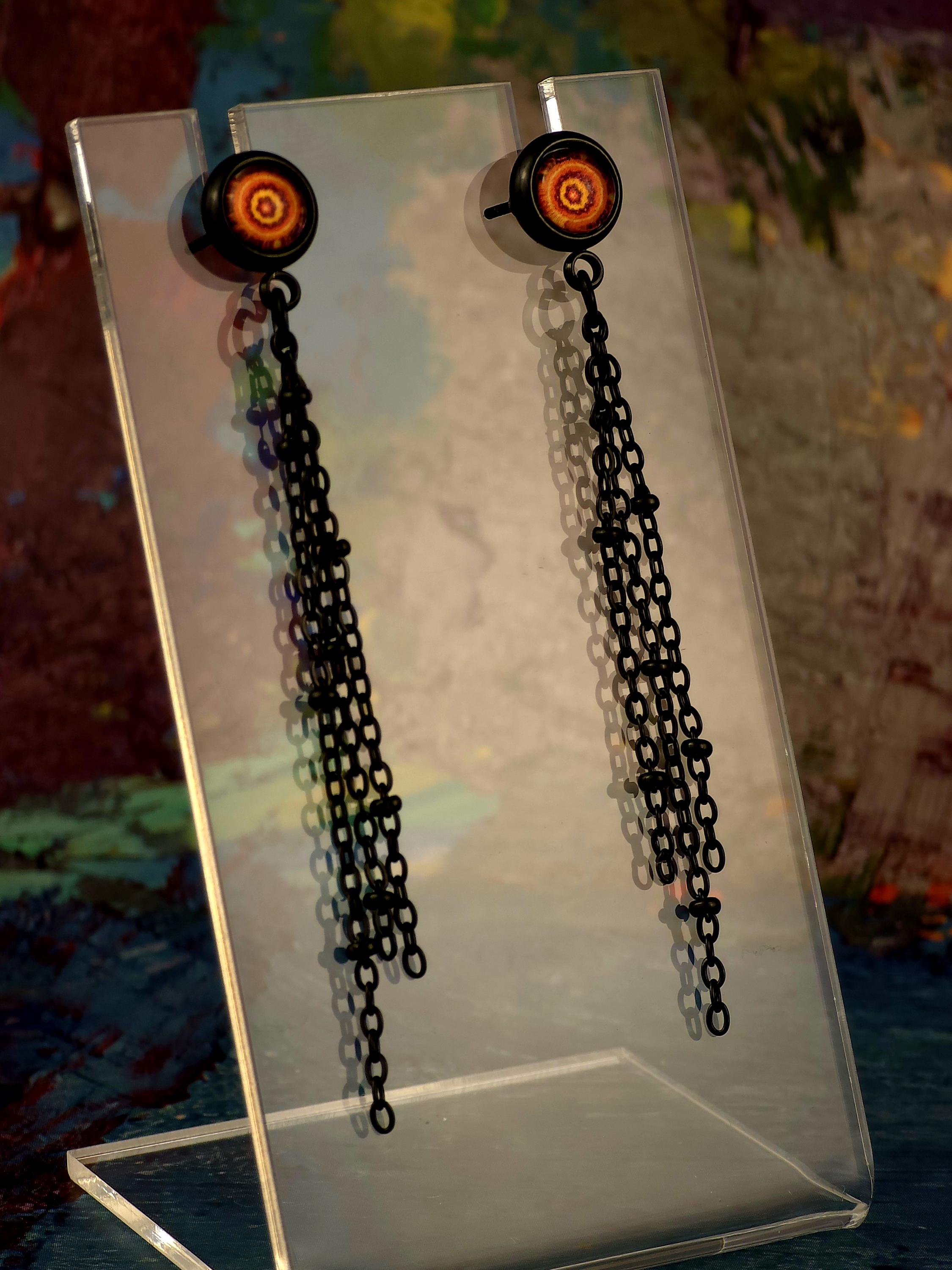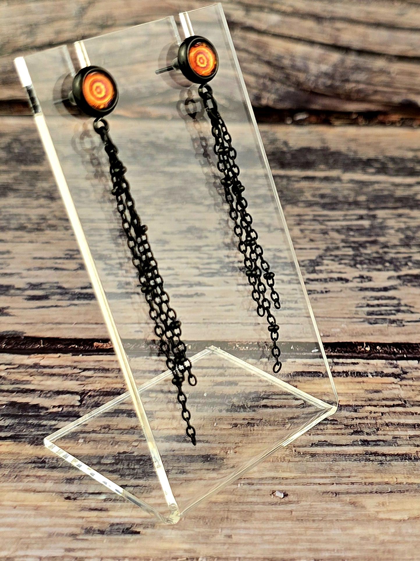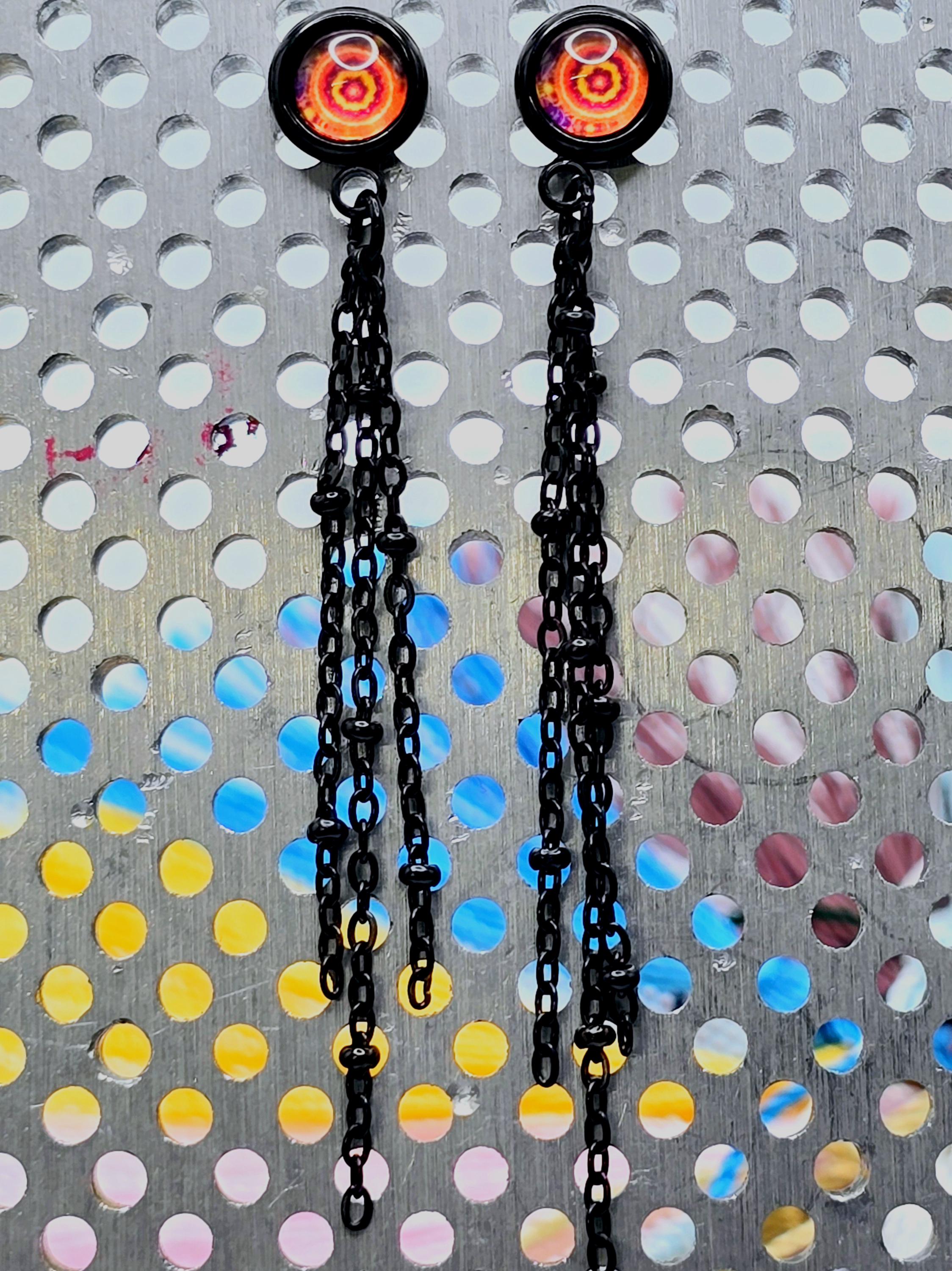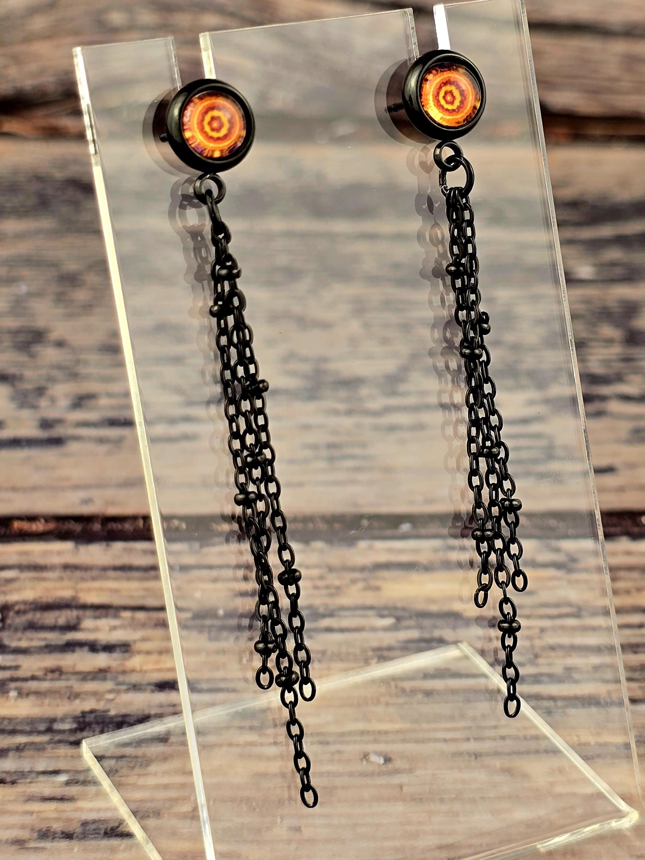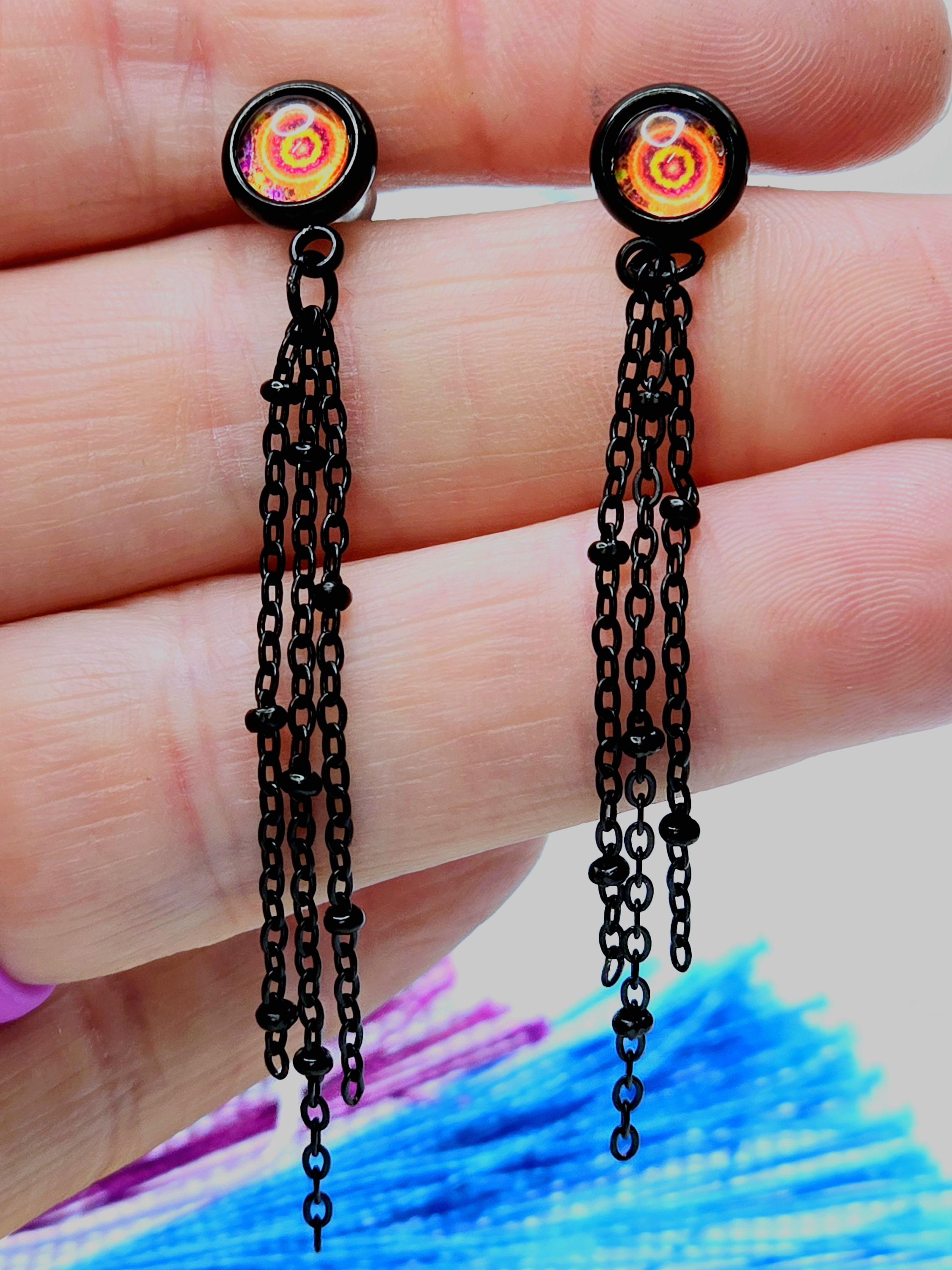 Add a touch of edgy sophistication to your look with these stunning dangle earrings. Made with black stainless steel stud earrings featuring a cabochon setting bezel and a loop for extra flair, these earrings are sure to make a statement. Each earring boasts 3-5cm black beaded stainless steel chains hanging from the bezel loop, adding movement and intrigue to the design. The focal point of these earrings is the vibrant glass orange kaleidoscope style spiral cabochon insert, which adds a pop of color and visual interest. Elevate your outfit with these unique and stylish earrings that are perfect for any occasion. These earrings are 5.5cm long, with a drop length of 5cm. Post studs are 8mm round cabochon trays with colorful glass dome.