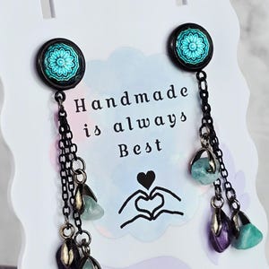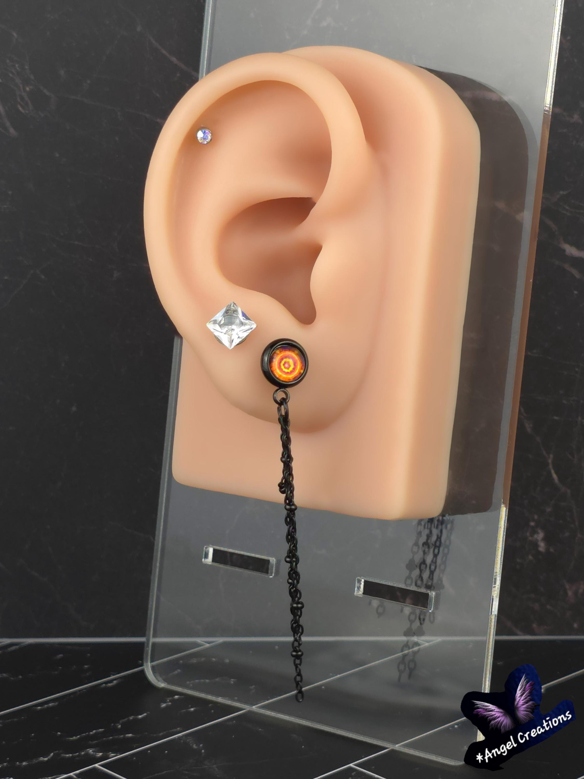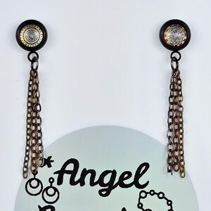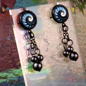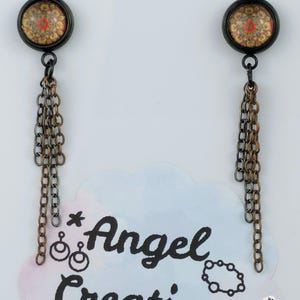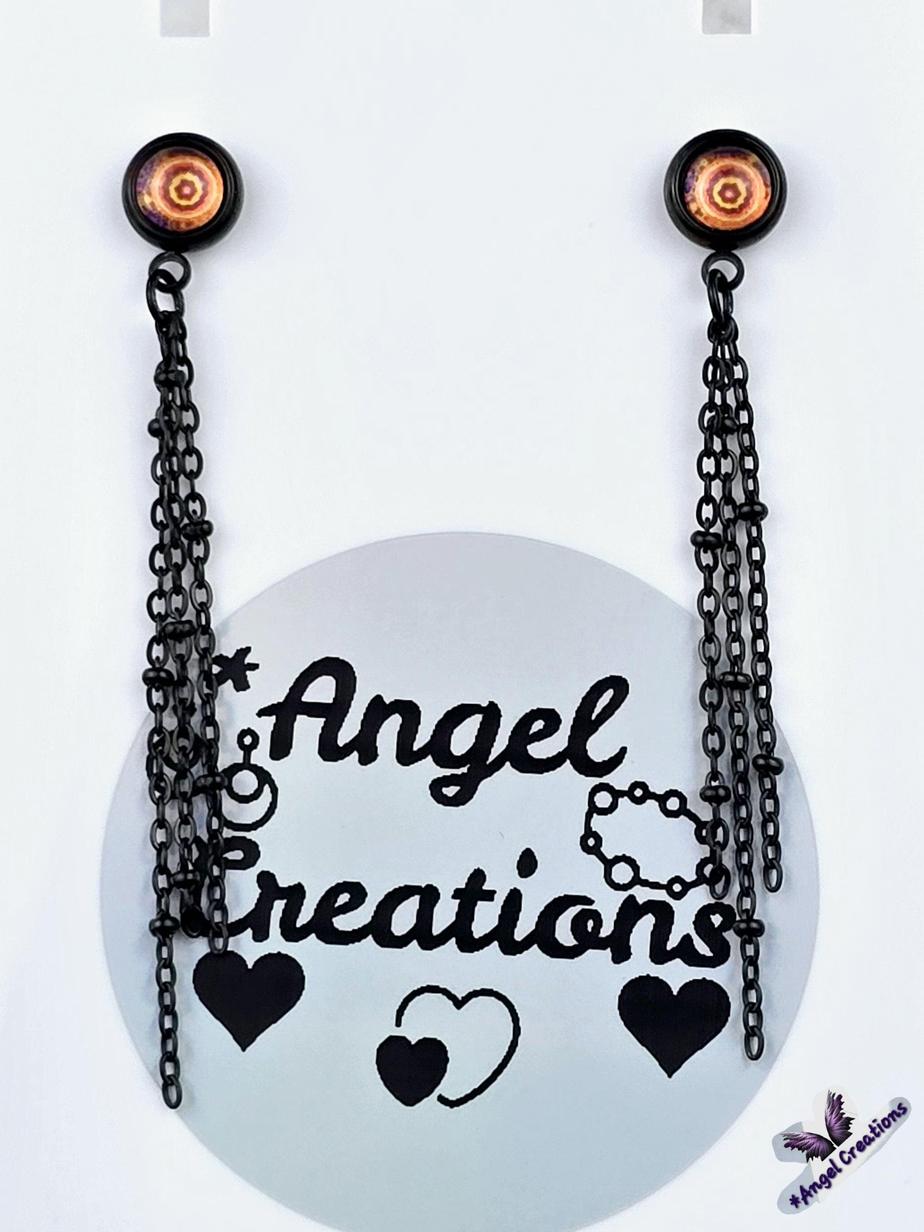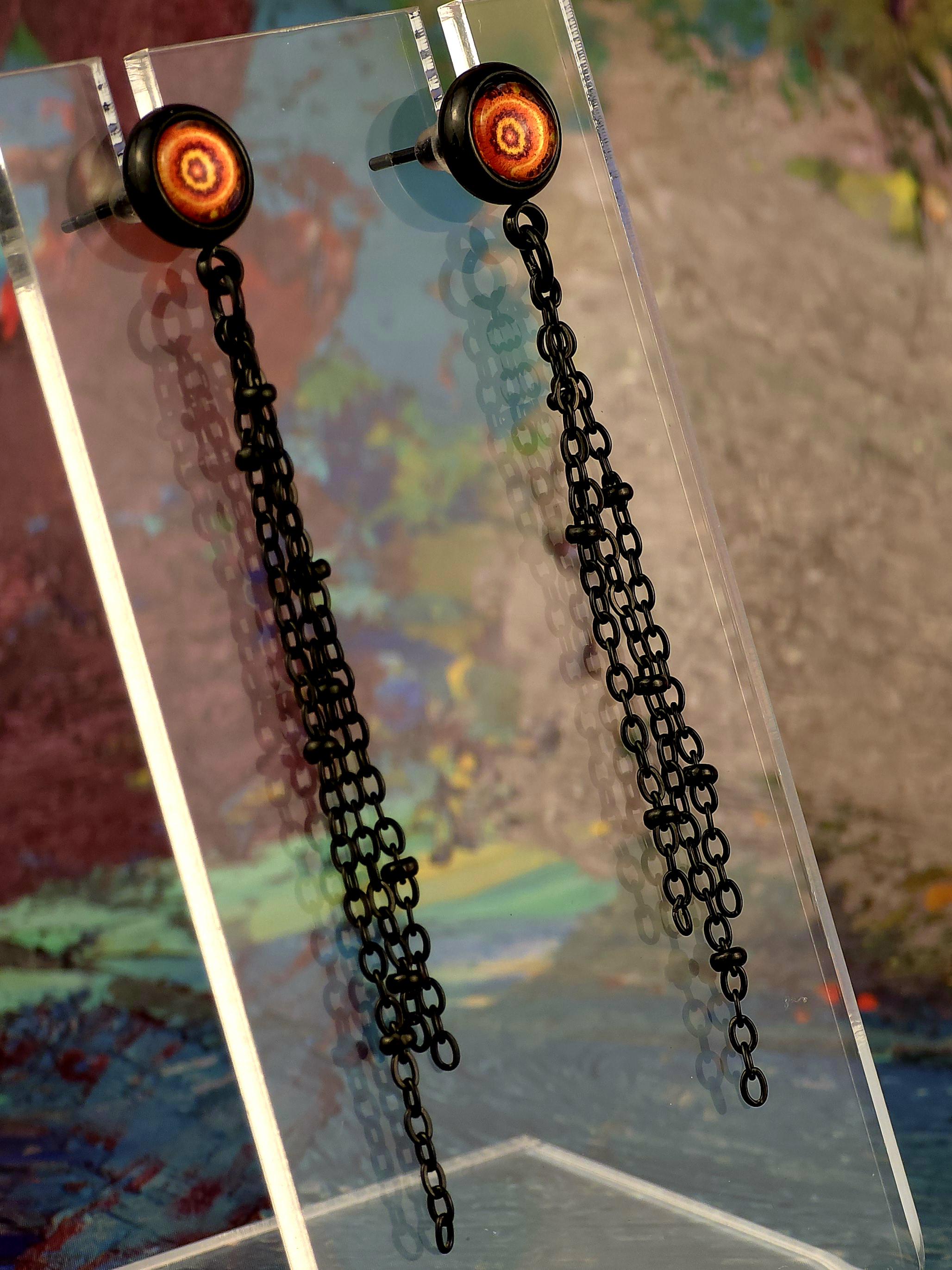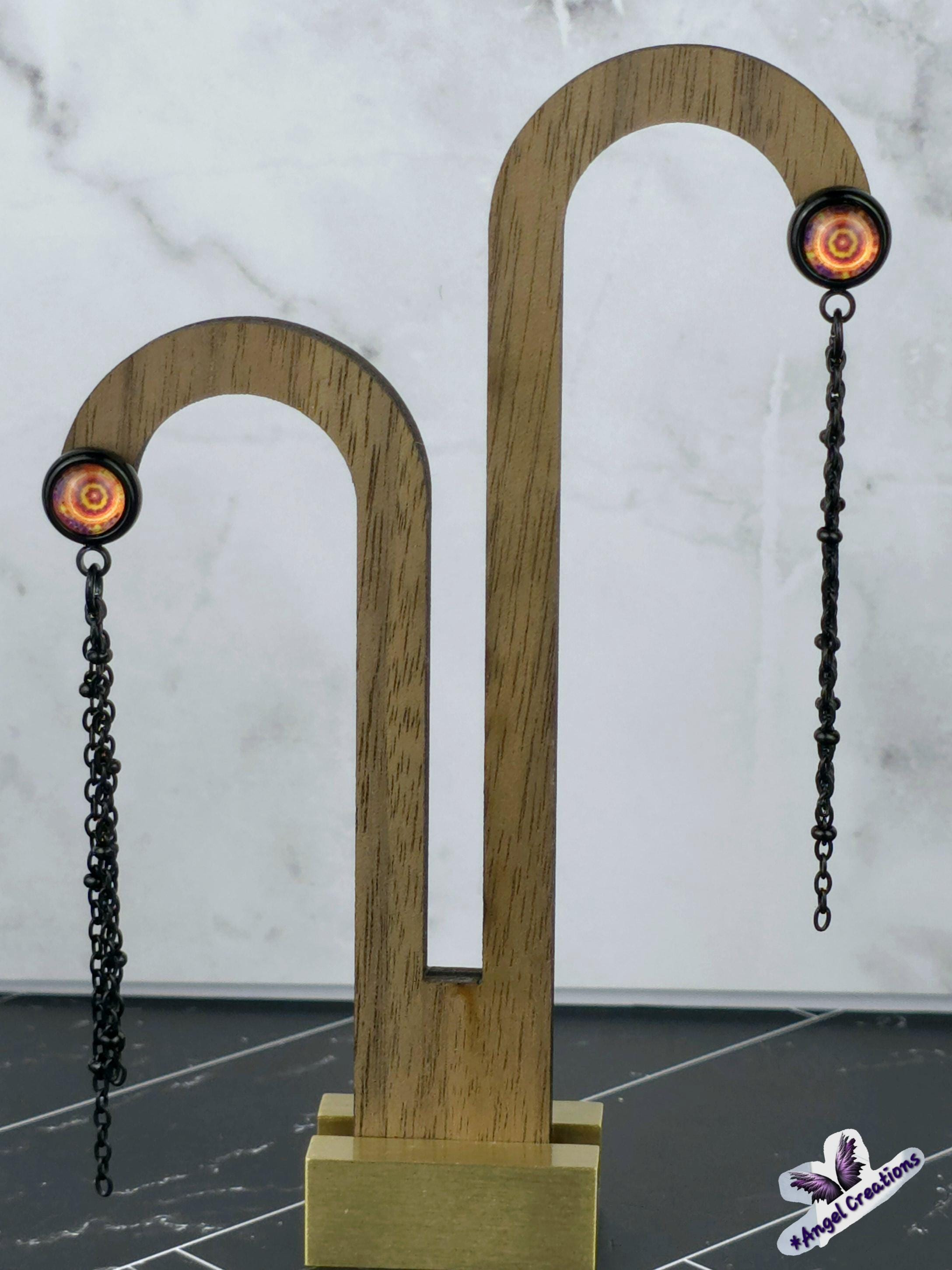 Add a touch of edgy sophistication to your look with these stunning dangle earrings. Made with black stainless steel stud earrings featuring a cabochon setting bezel and a loop for extra flair, these earrings are sure to make a statement. Each earring boasts 3-5cm black beaded stainless steel chains hanging from the bezel loop, adding movement and intrigue to the design. The focal point of these earrings is the vibrant glass orange kaleidoscope style spiral cabochon insert, which adds a pop of color and visual interest. Elevate your outfit with these unique and stylish earrings that are perfect for any occasion. These earrings are 5.5cm long, with a drop length of 5cm. Post studs are 8mm round cabochon trays with colorful glass dome.