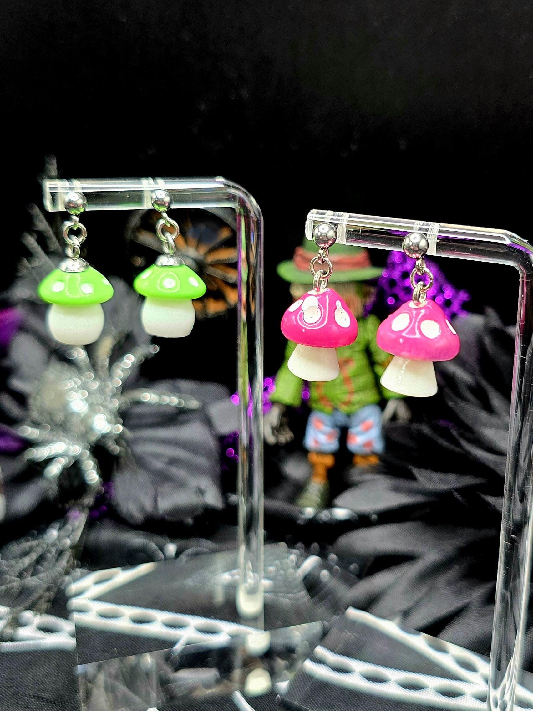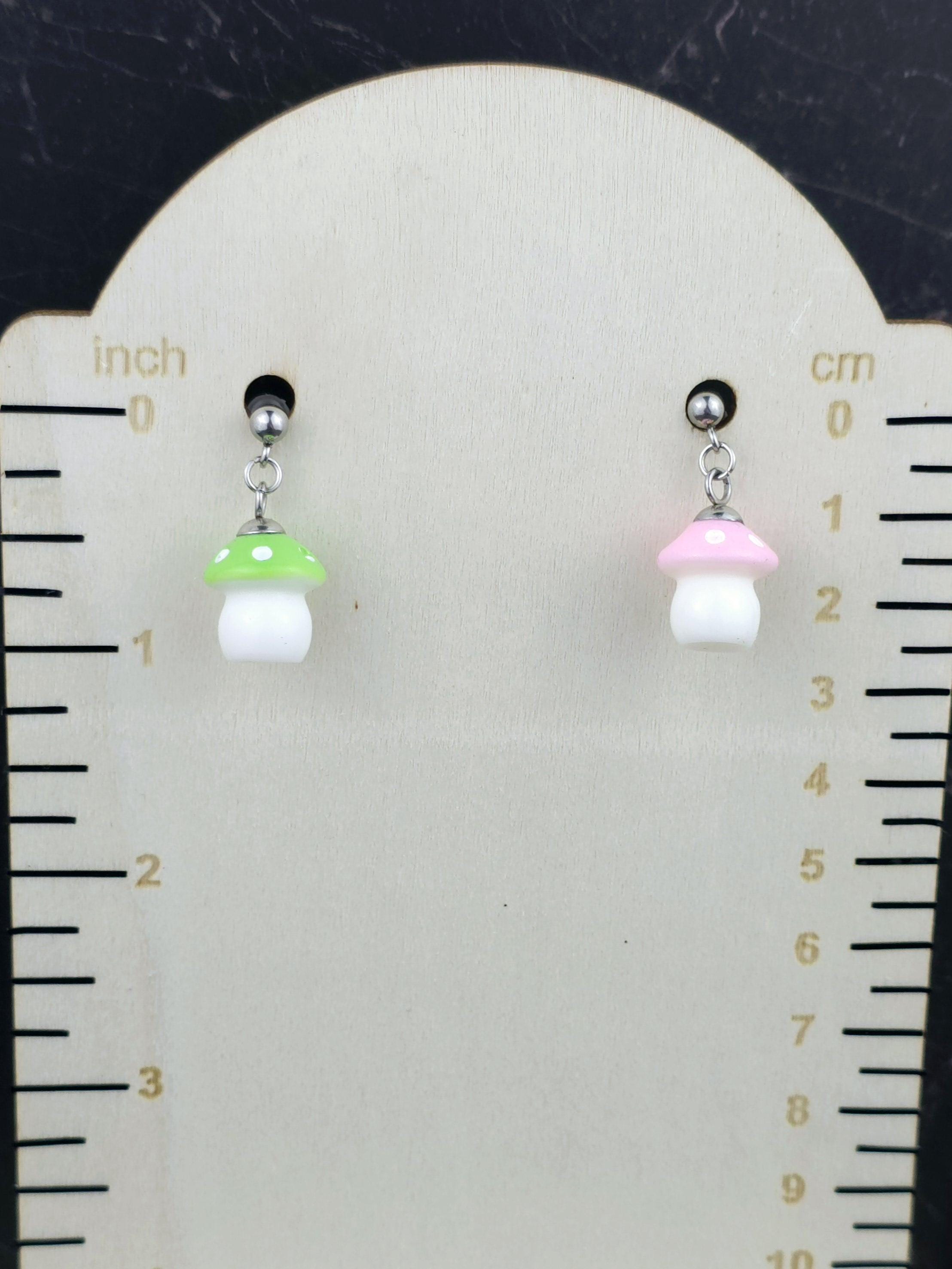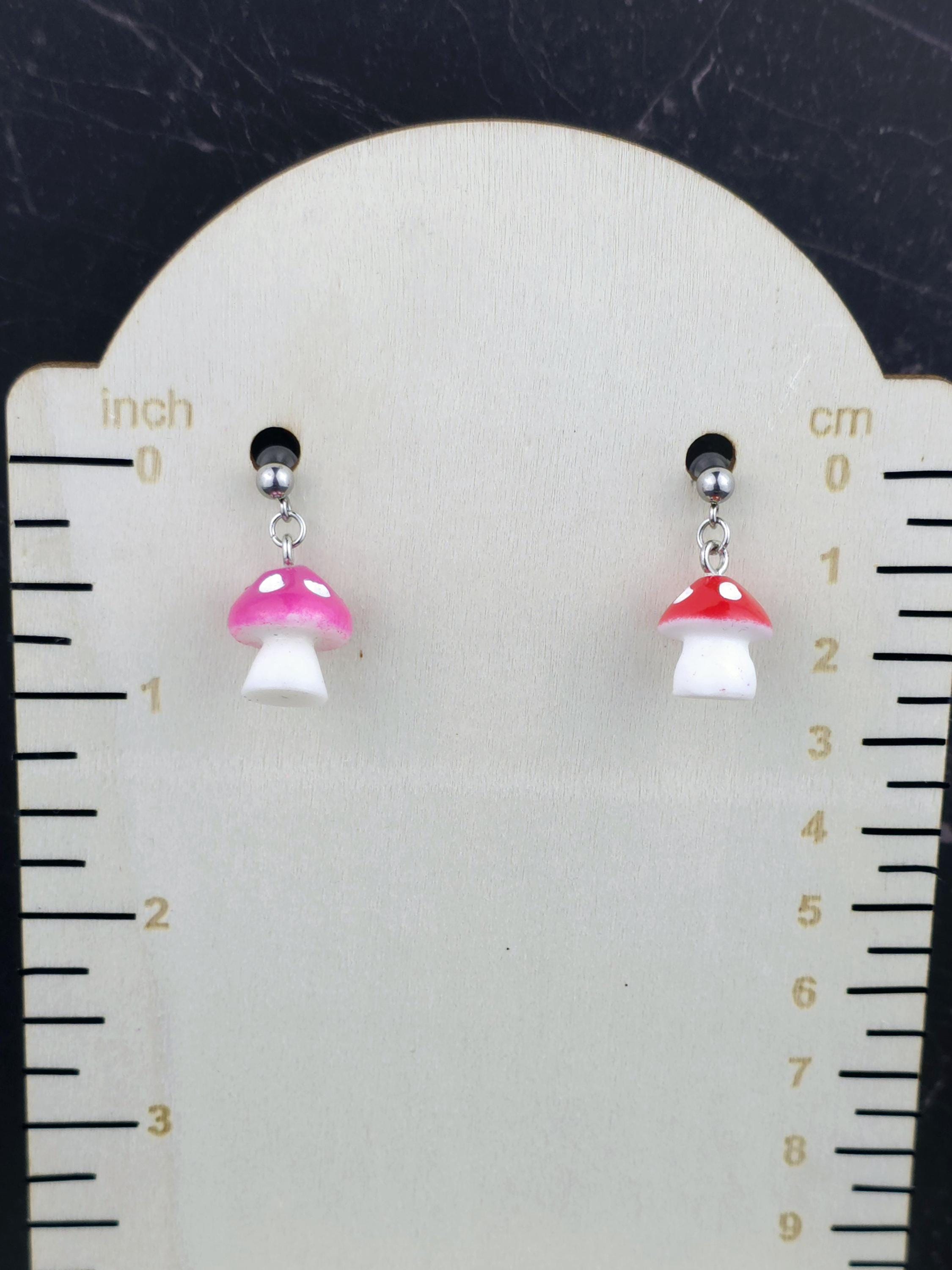 Upgrade your style game with our Fun Mushroom Ball Post Style Earrings! Made with all stainless steel materials, mushroom charms are made from plastic. Making these earrings are not only stylish but also durable. Total length is .75 inches. Available in a variety of colors, they are the perfect addition to any outfit. Elevate your look with these fun and trendy earrings.These earrings are 2.5cm long, with a drop length of 2cm long. The mushroom charms are 1.5cm long by 1.5cm wide (at the widest point of charm).