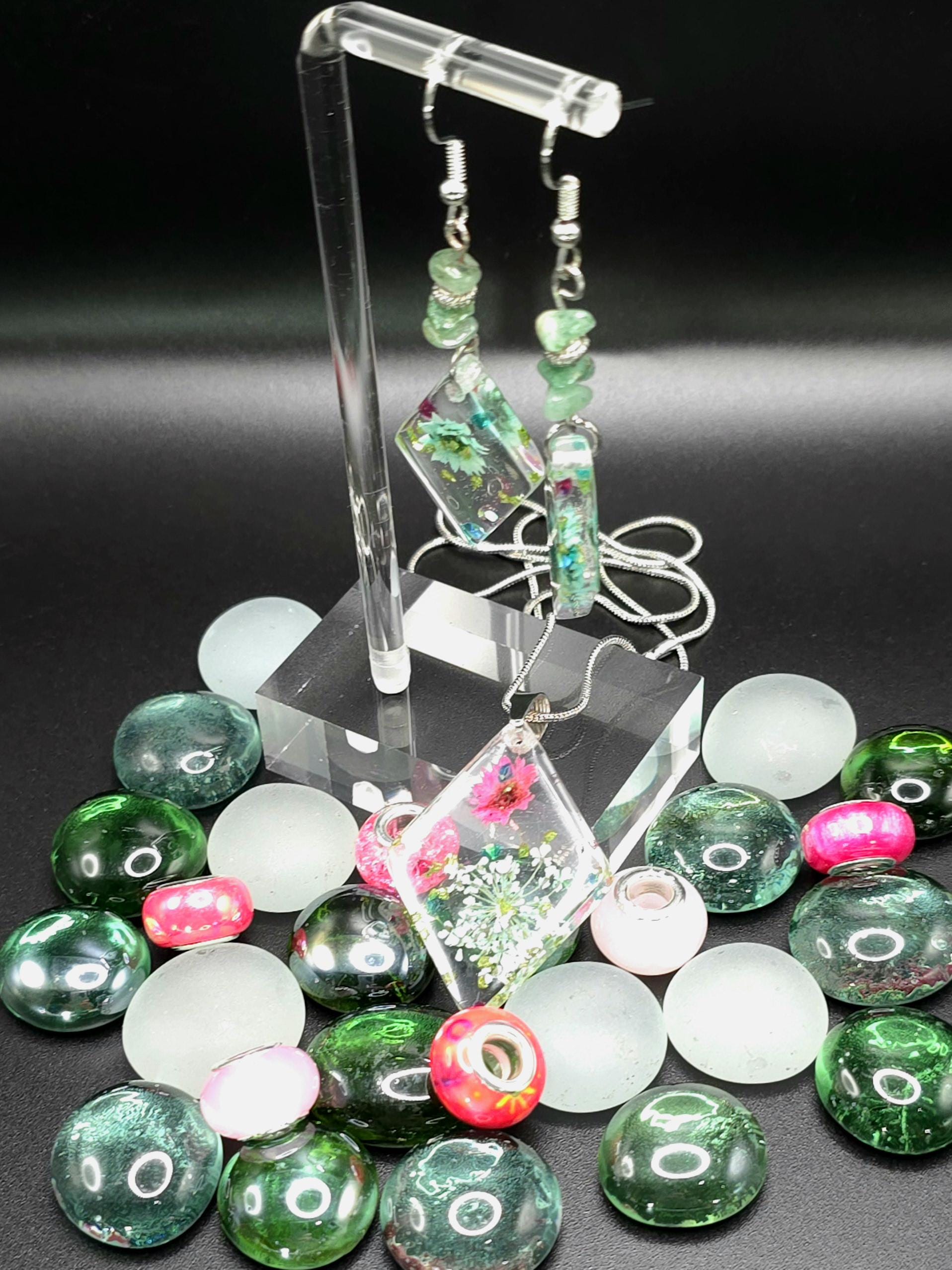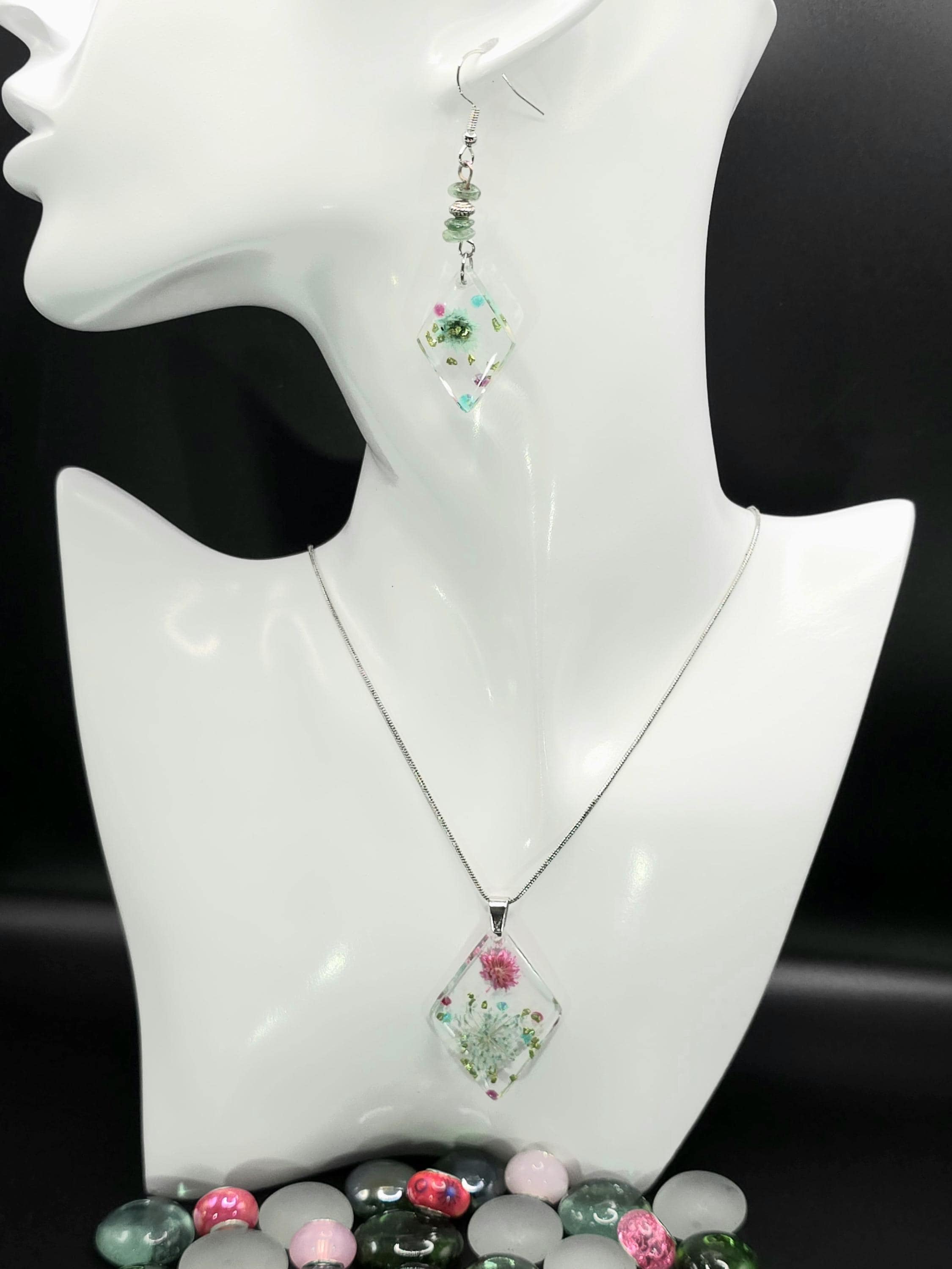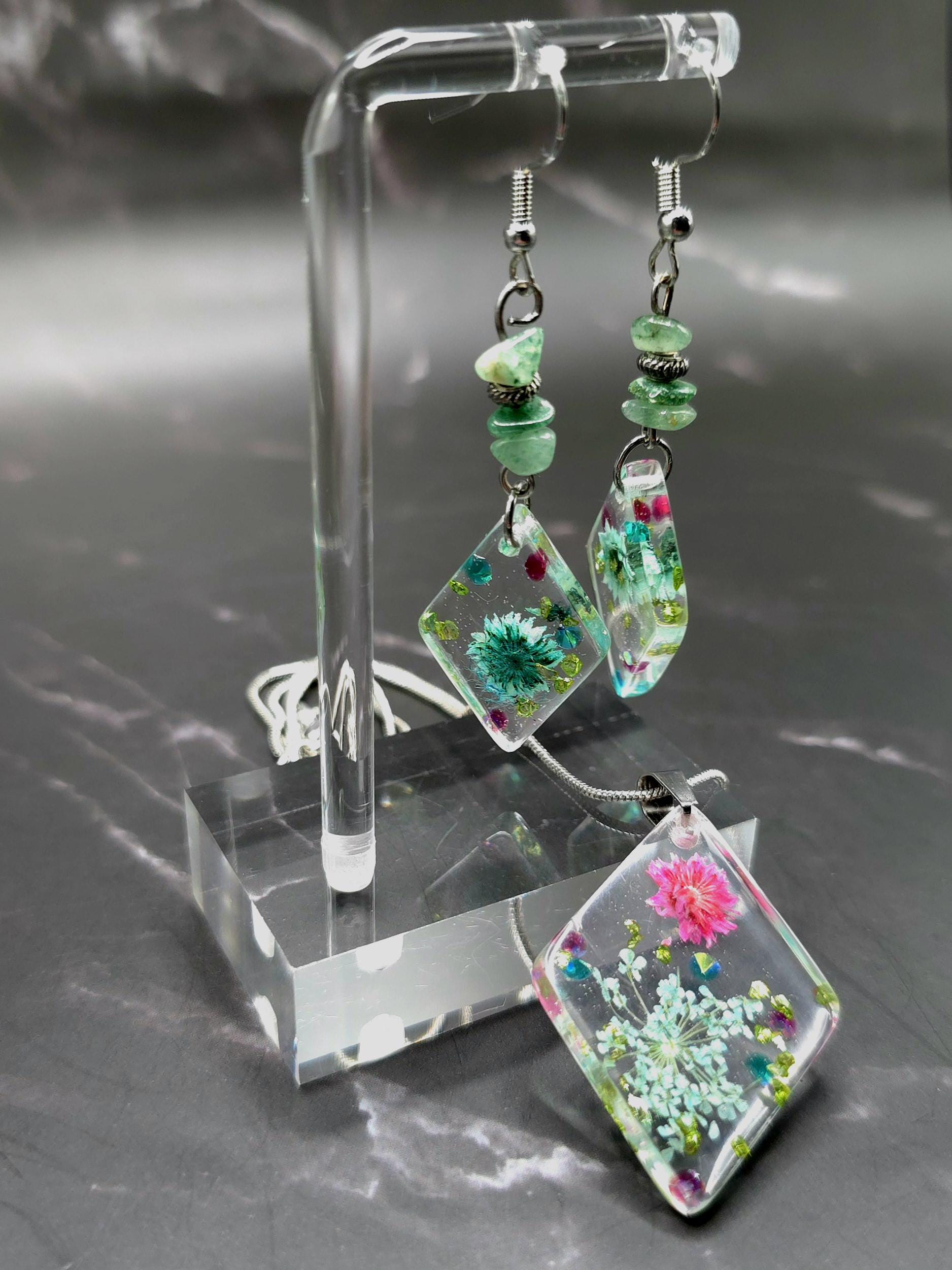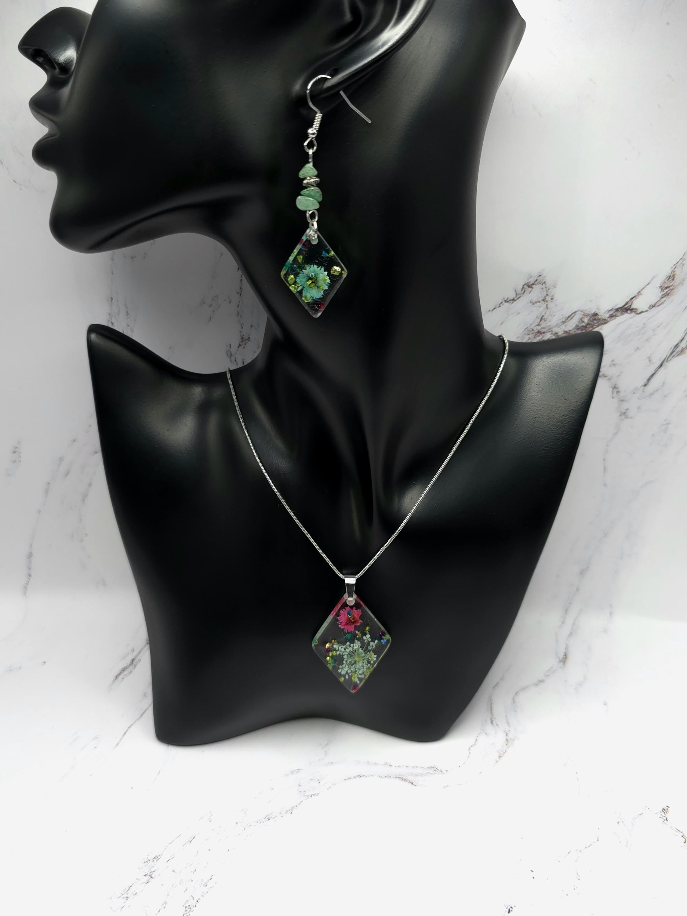 Handmade Resin Flower Jewelry Set: Stainless Steel Necklace and Earrings