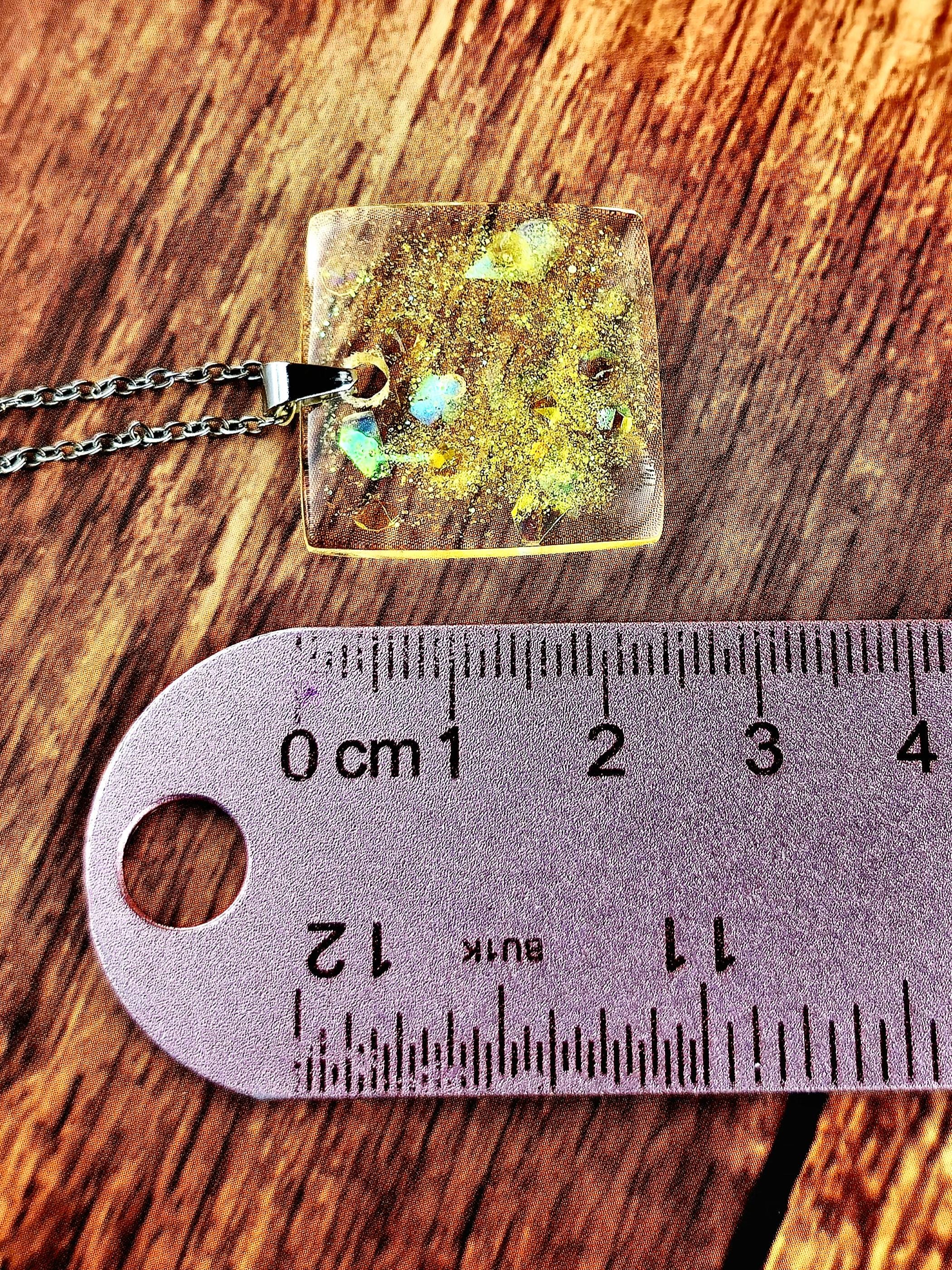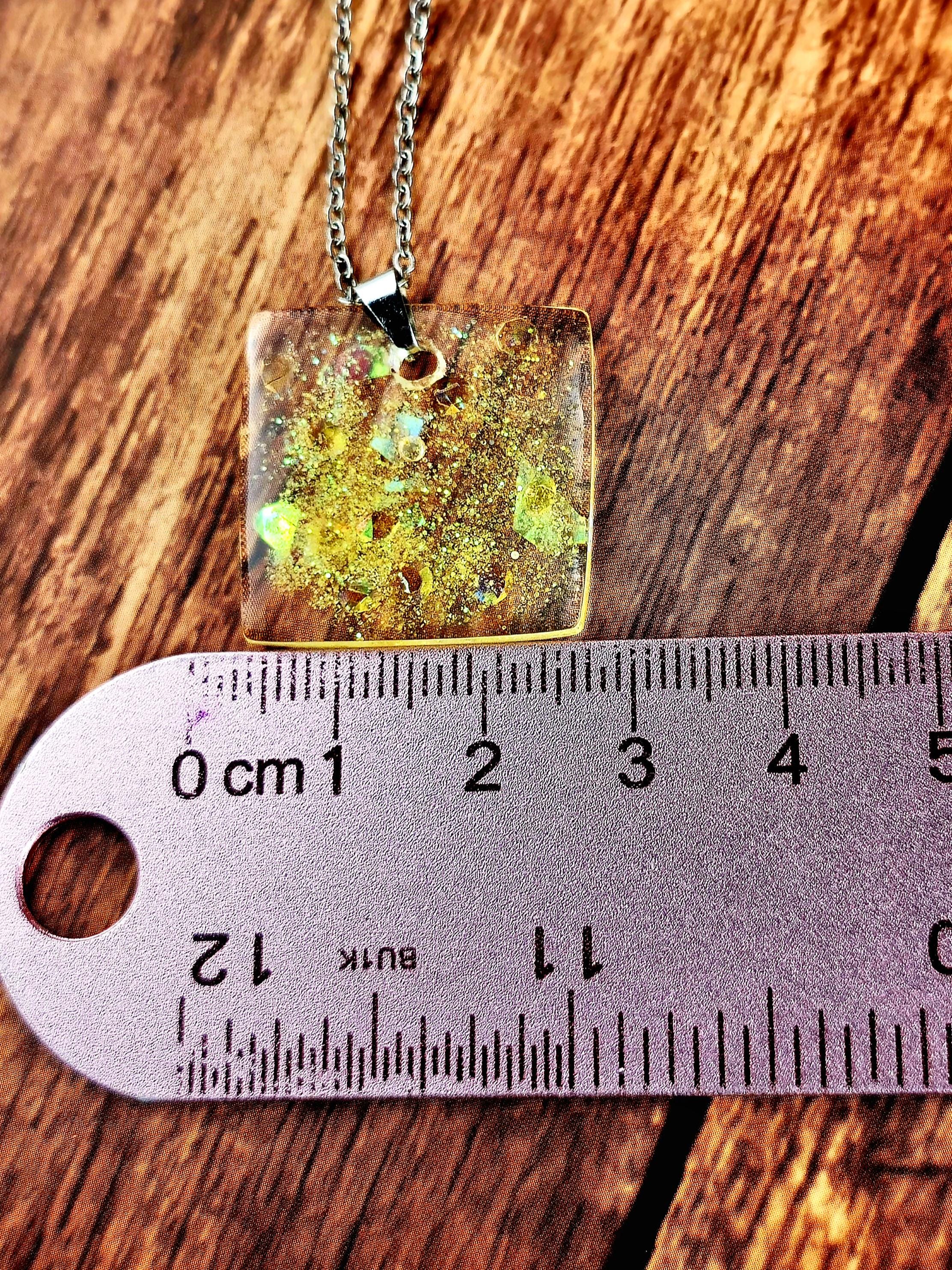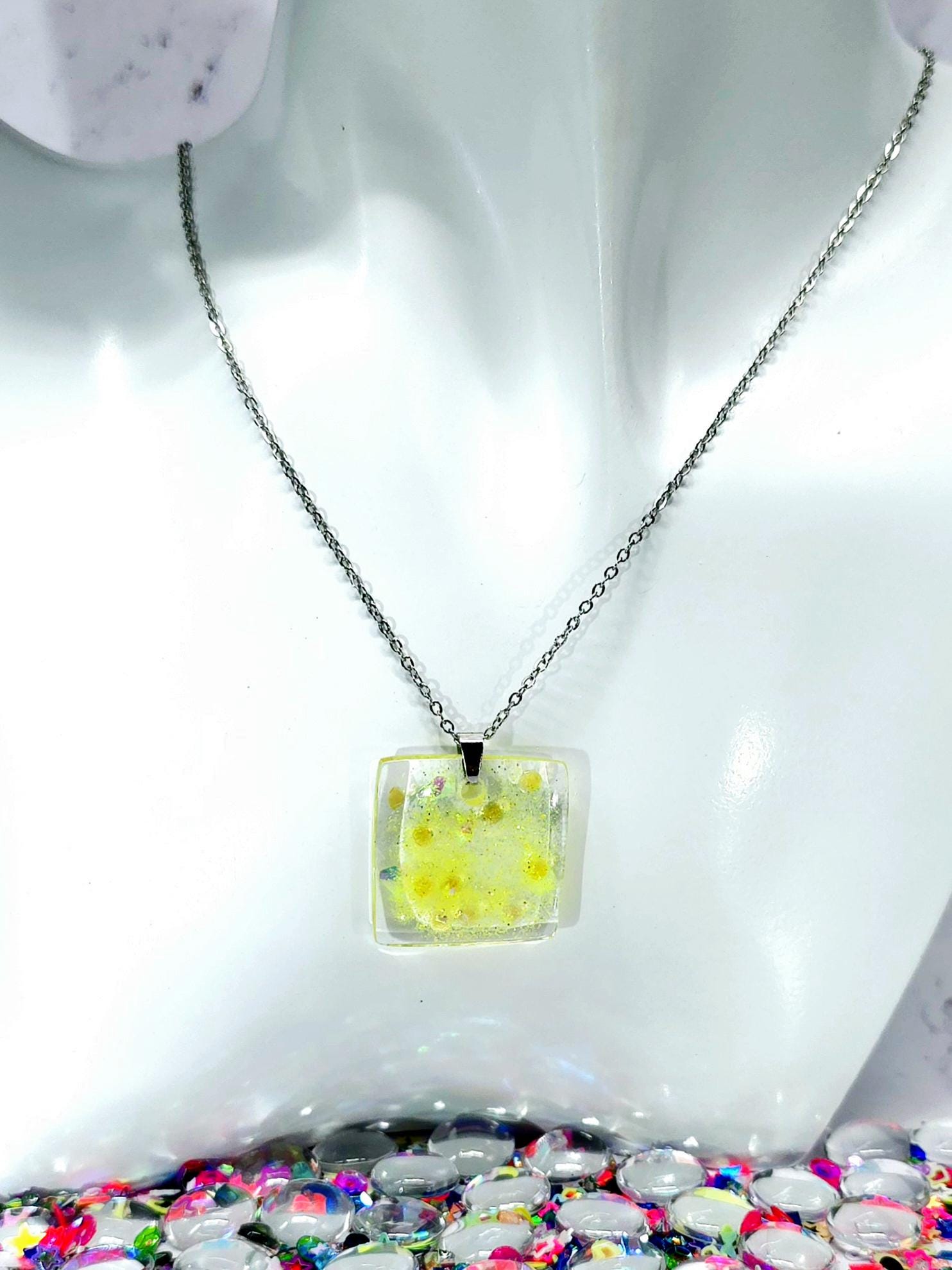 Capture the sunshine with our Shine in Yellow Resin Necklace. The clear resin pendant is filled with stunning yellow flakes, gems, and glitter, perfect for catching the light. With a stainless steel chain and secure lobster clasp, this necklace will elevate any outfit. This necklace is 48cm long, with a drop length of 26cm (including resin pendant). Resin pendant is 2.5cm long by 2.5cm wide (at widest point of pendant).