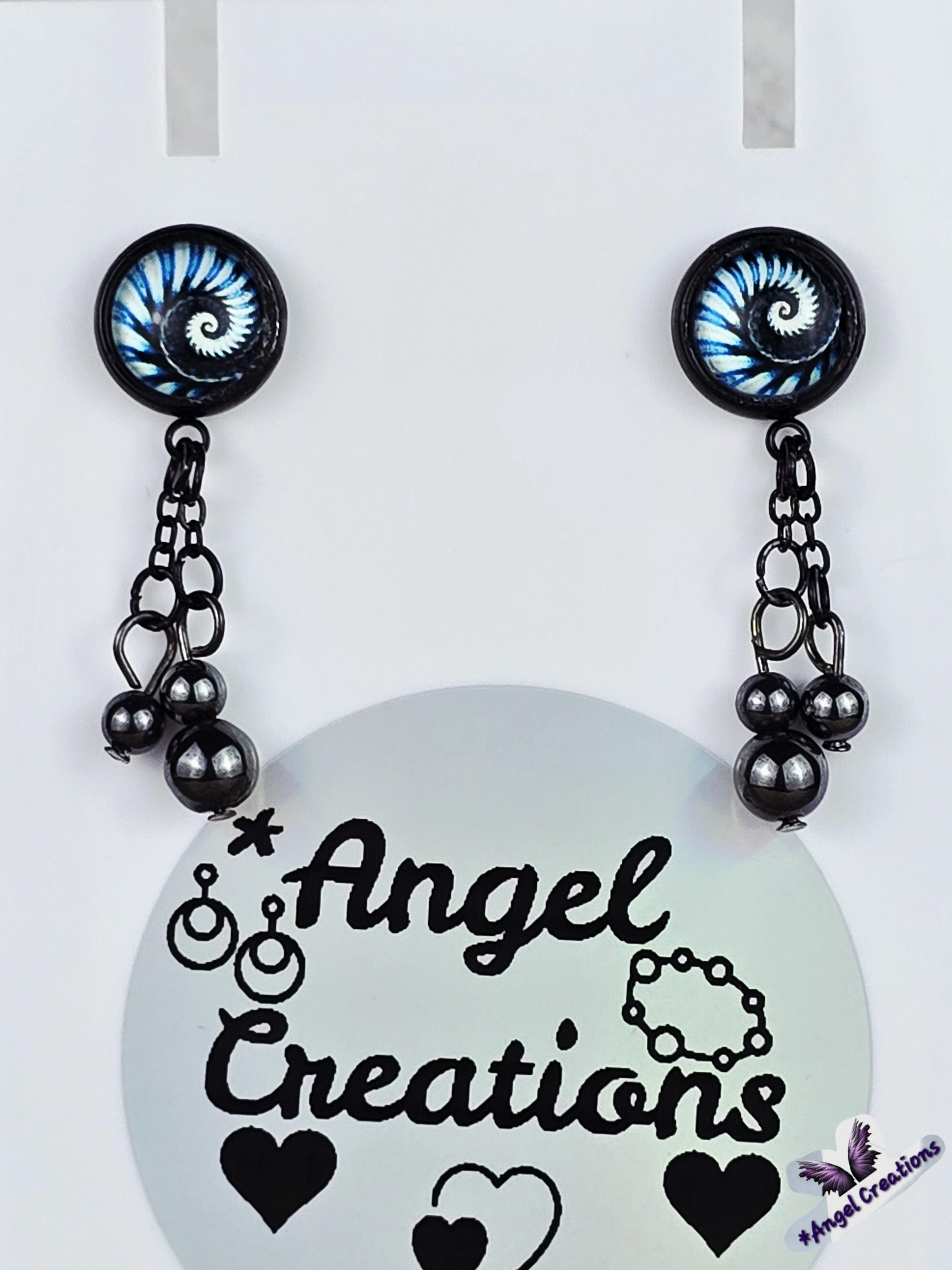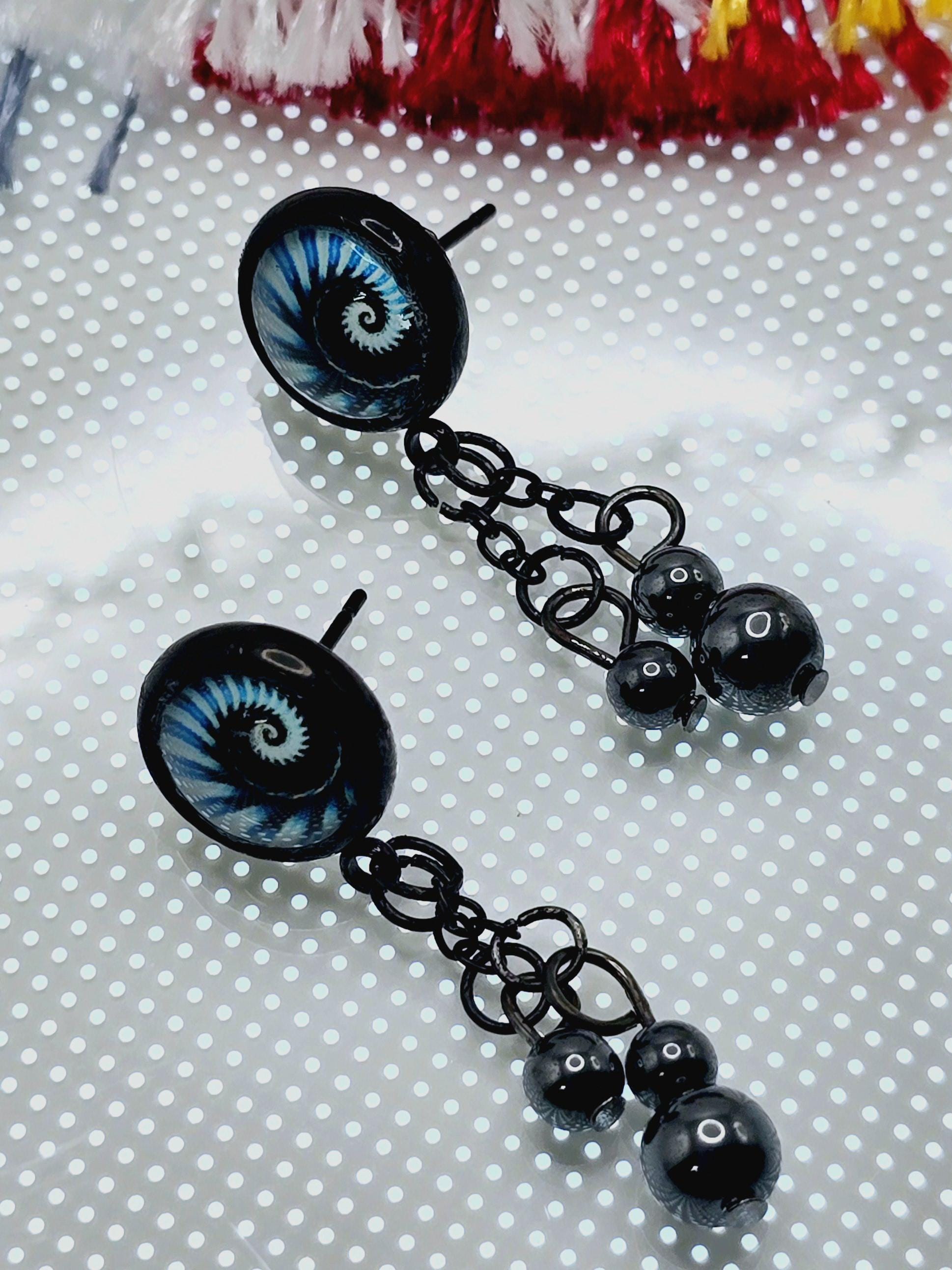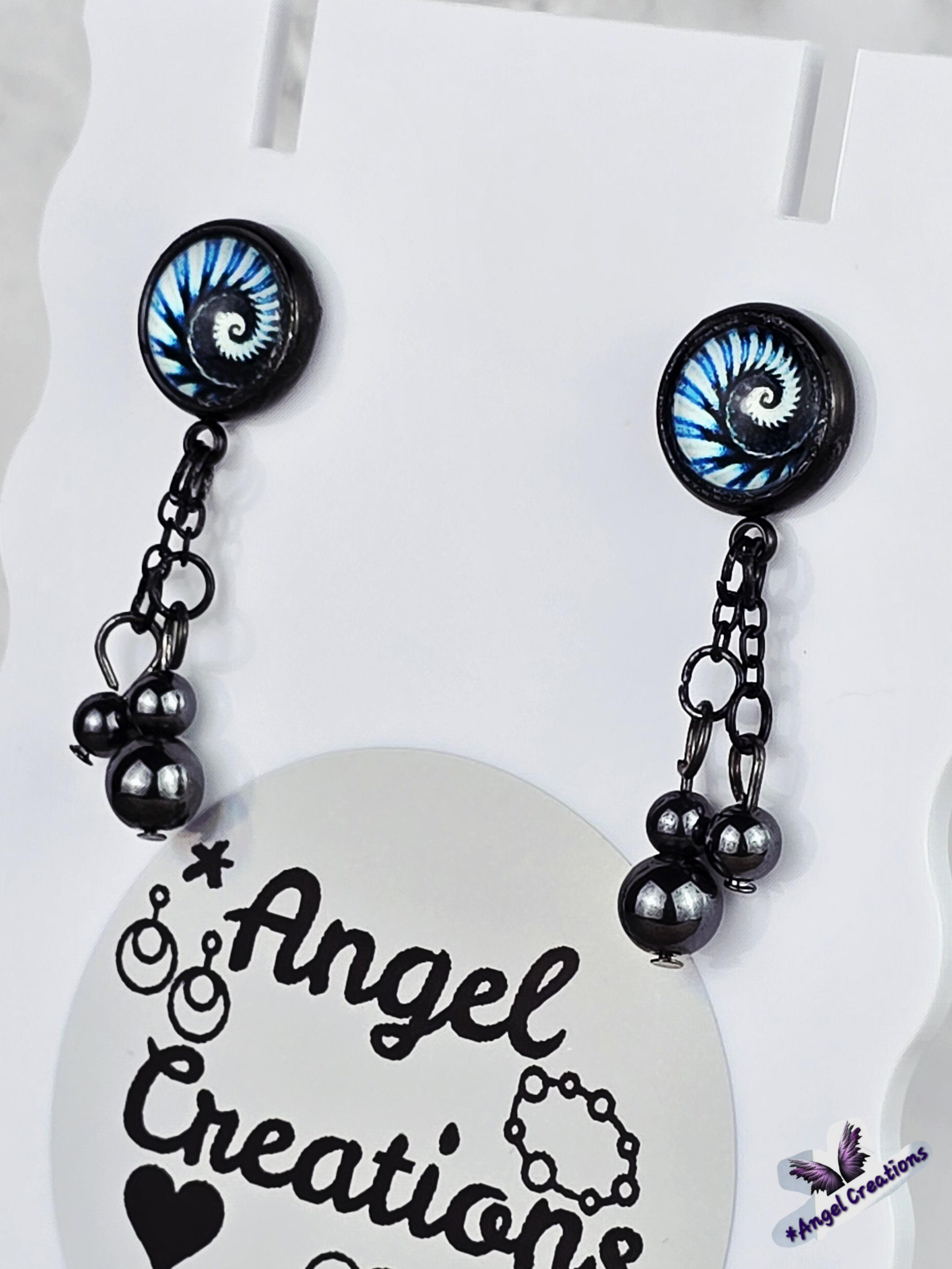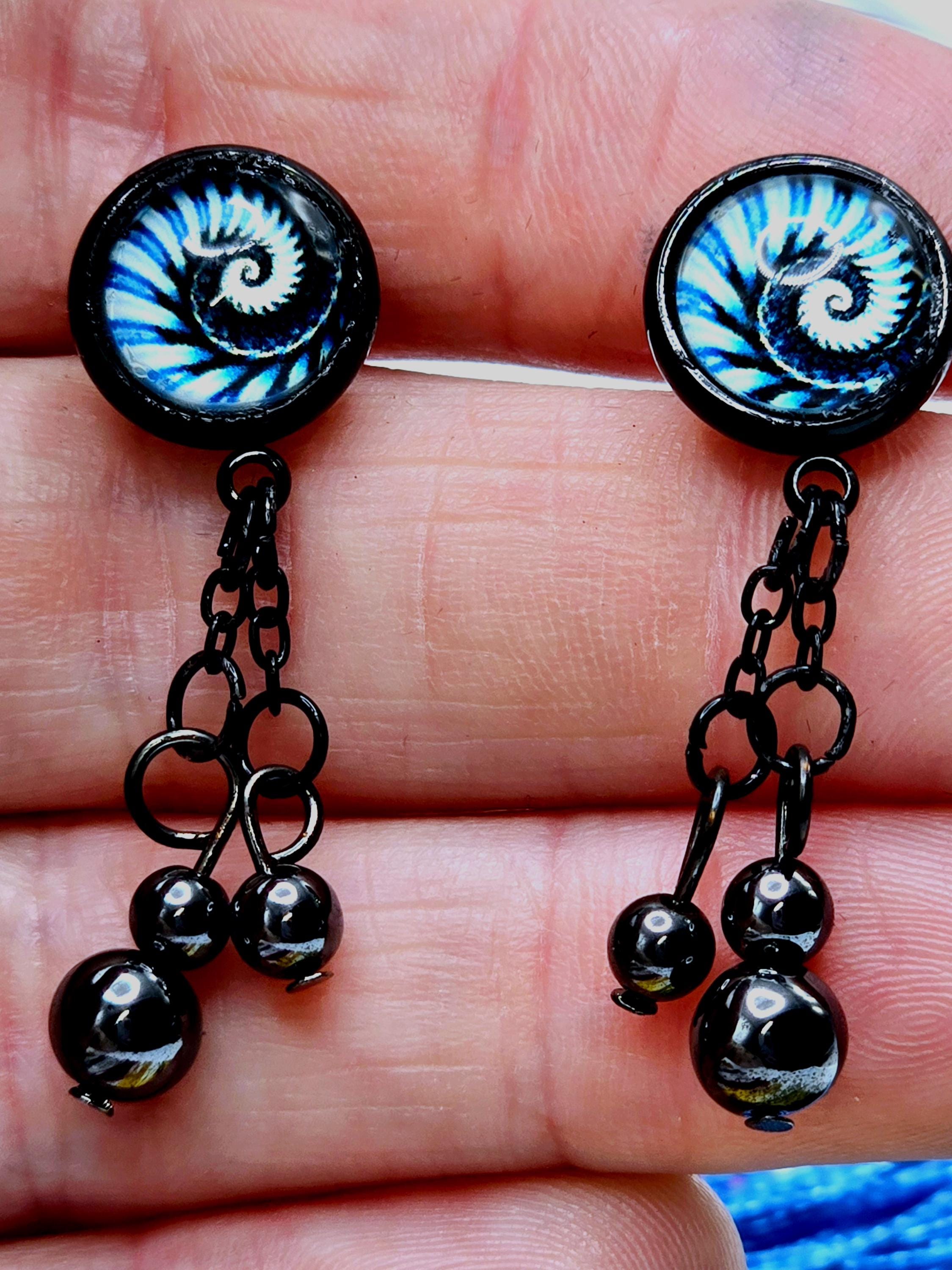 Bring a hit of modern elegance to your look with these stunning black stainless steel stud earrings. The 12mm Cabochon setting features a mesmerizing black and blue kaleidoscope design, adding a pop of color and intrigue to your ensemble. 3 natural stone crystals dangling beautifully from the post stud earrings. These earrings measure 3cm in length, with a 2cm drop length, making them the perfect statement piece for any outfit. Elevate your style with these unique and eye-catching earrings that are sure to turn heads wherever you go.