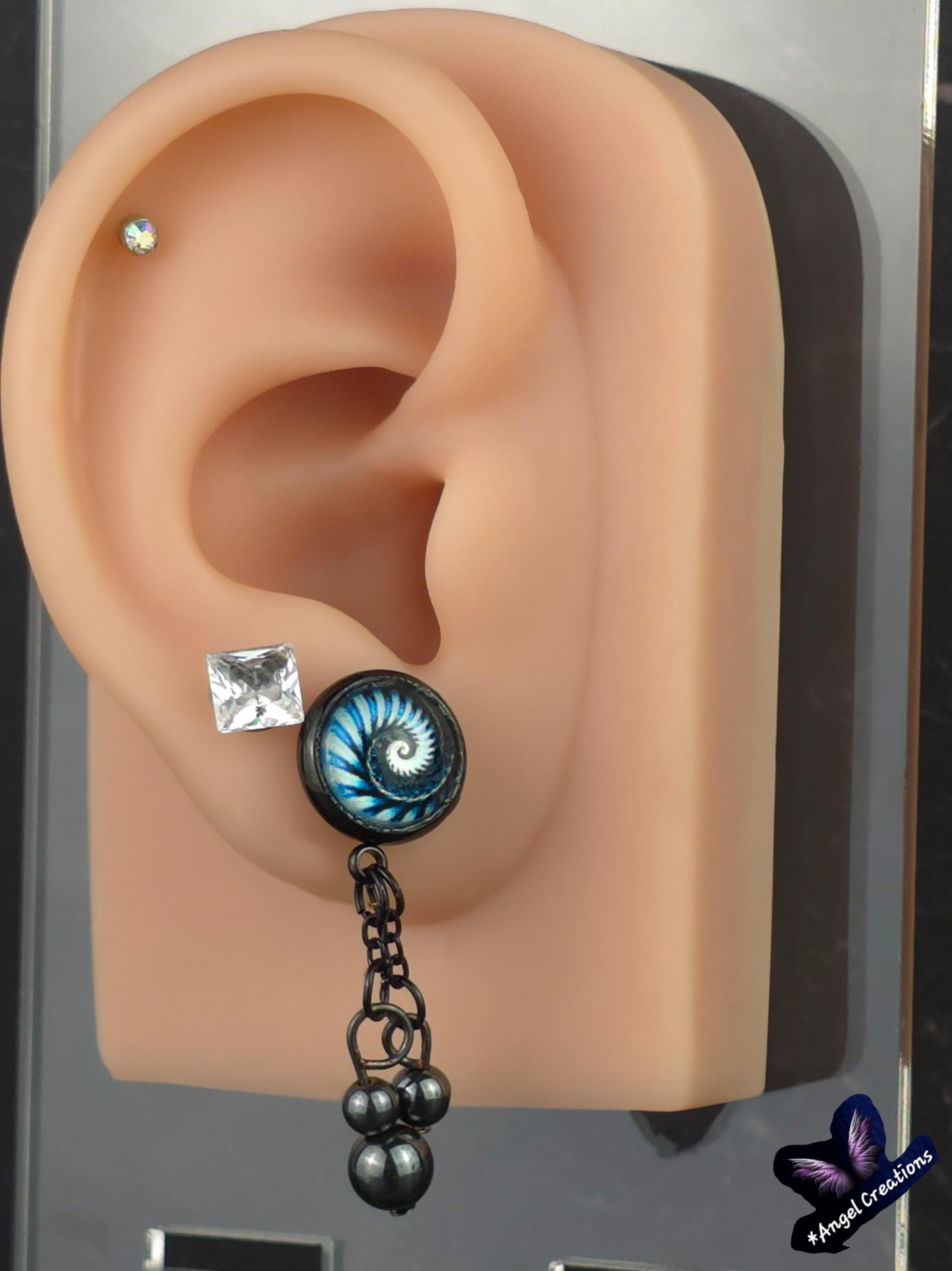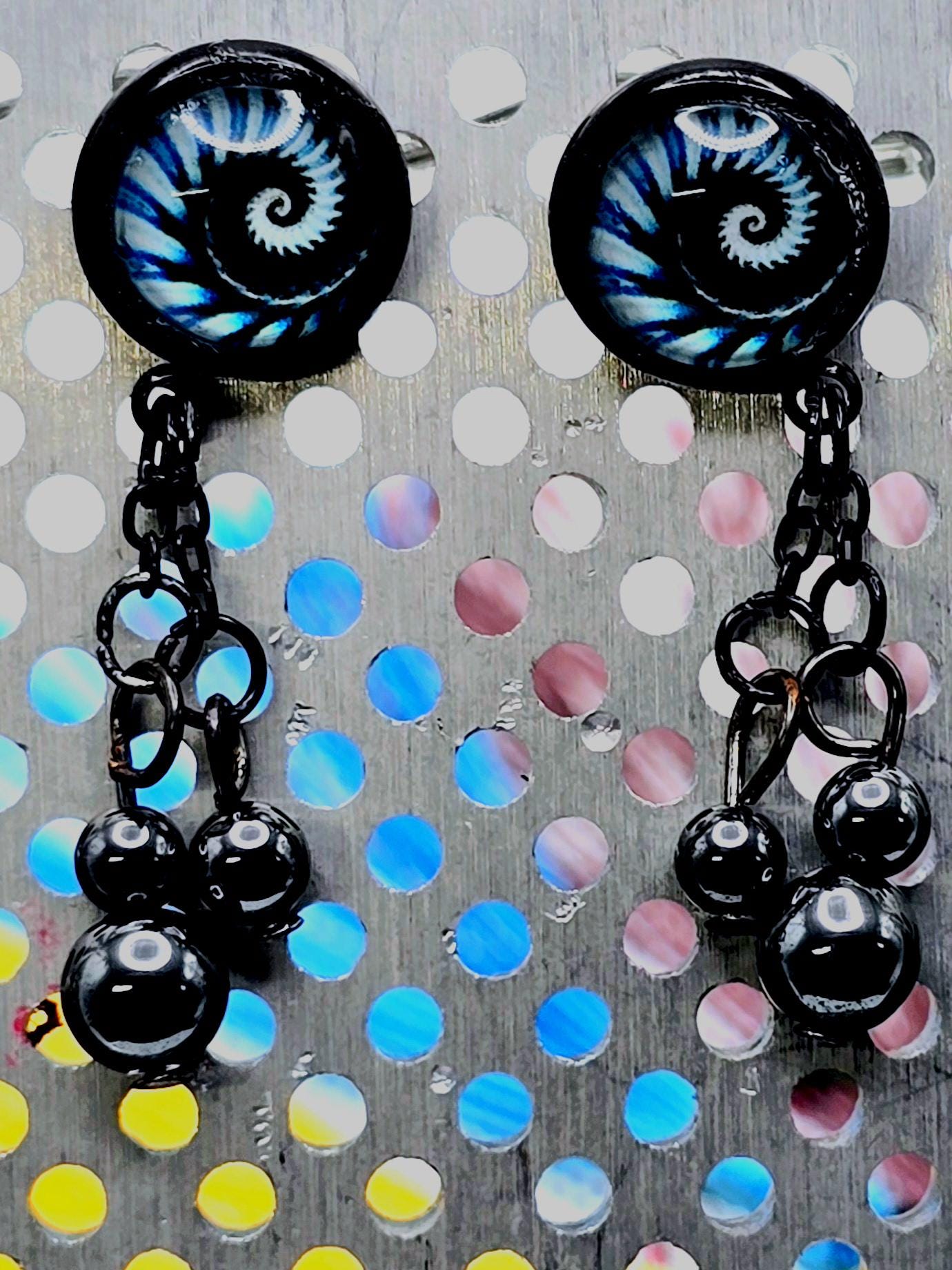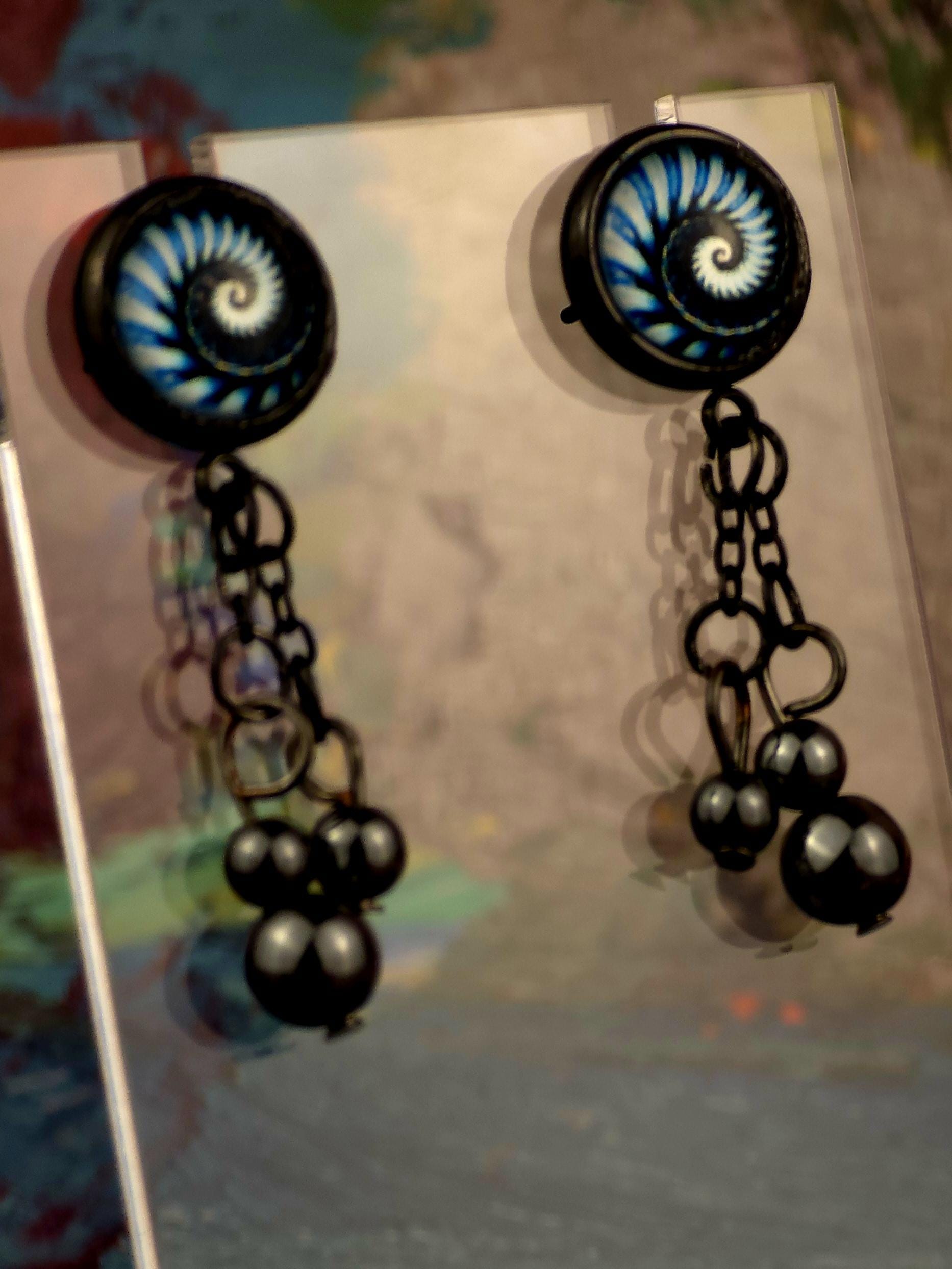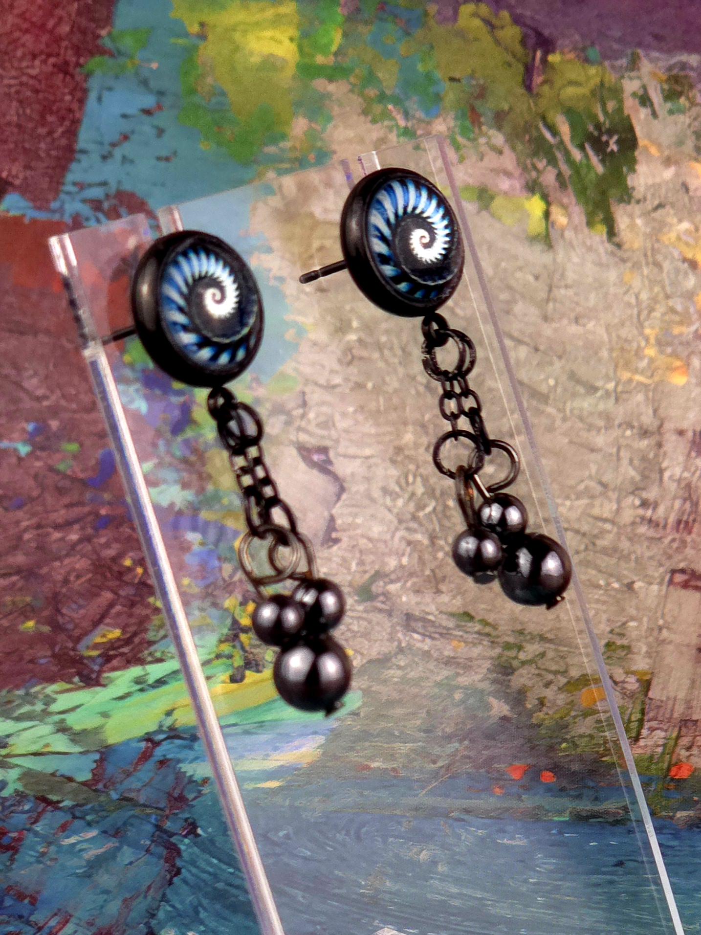 Bring a hit of modern elegance to your look with these stunning black stainless steel stud earrings. The 12mm Cabochon setting features a mesmerizing black and blue kaleidoscope design, adding a pop of color and intrigue to your ensemble. 3 natural stone crystals dangling beautifully from the post stud earrings. These earrings measure 3cm in length, with a 2cm drop length, making them the perfect statement piece for any outfit. Elevate your style with these unique and eye-catching earrings that are sure to turn heads wherever you go.