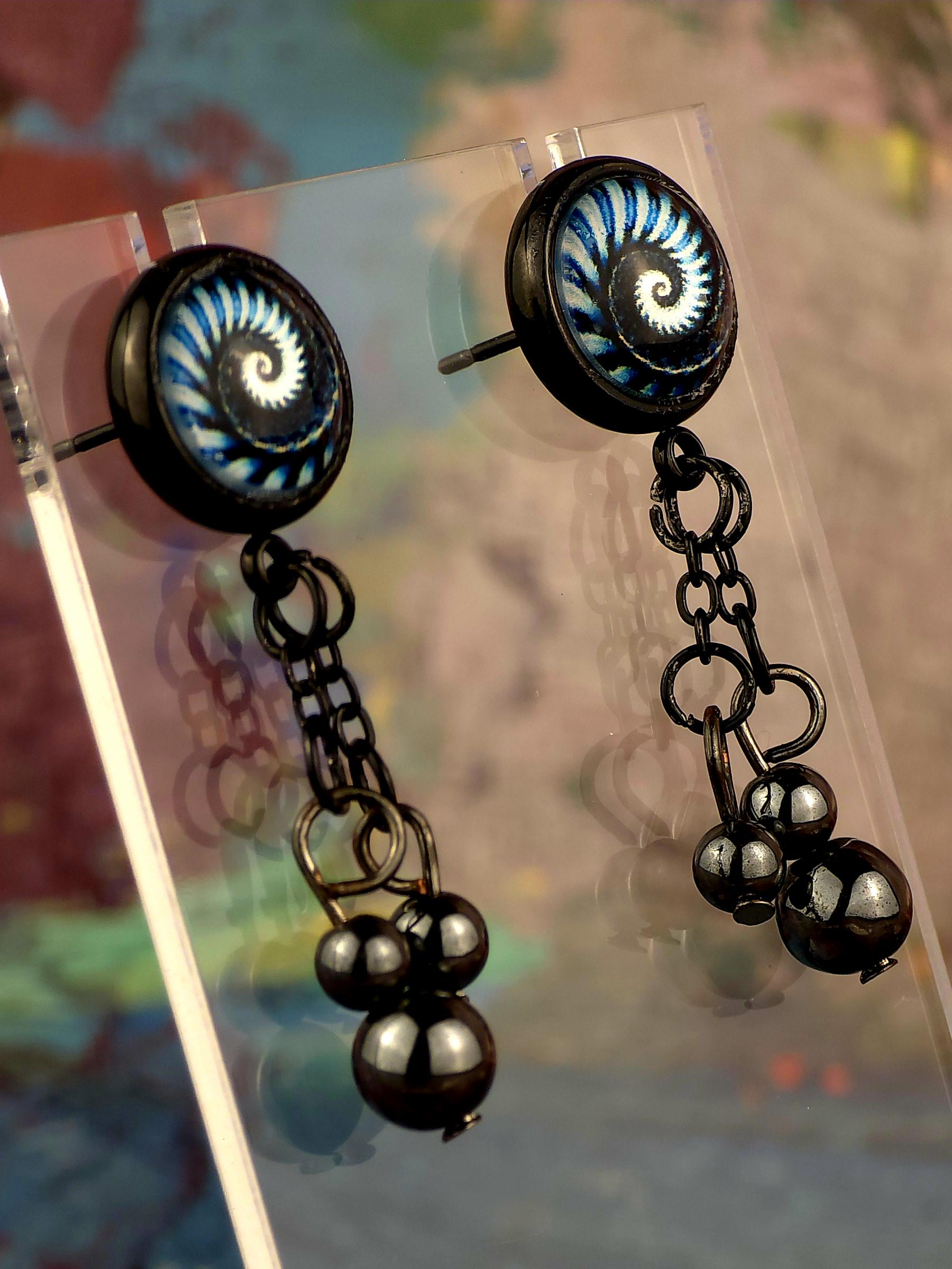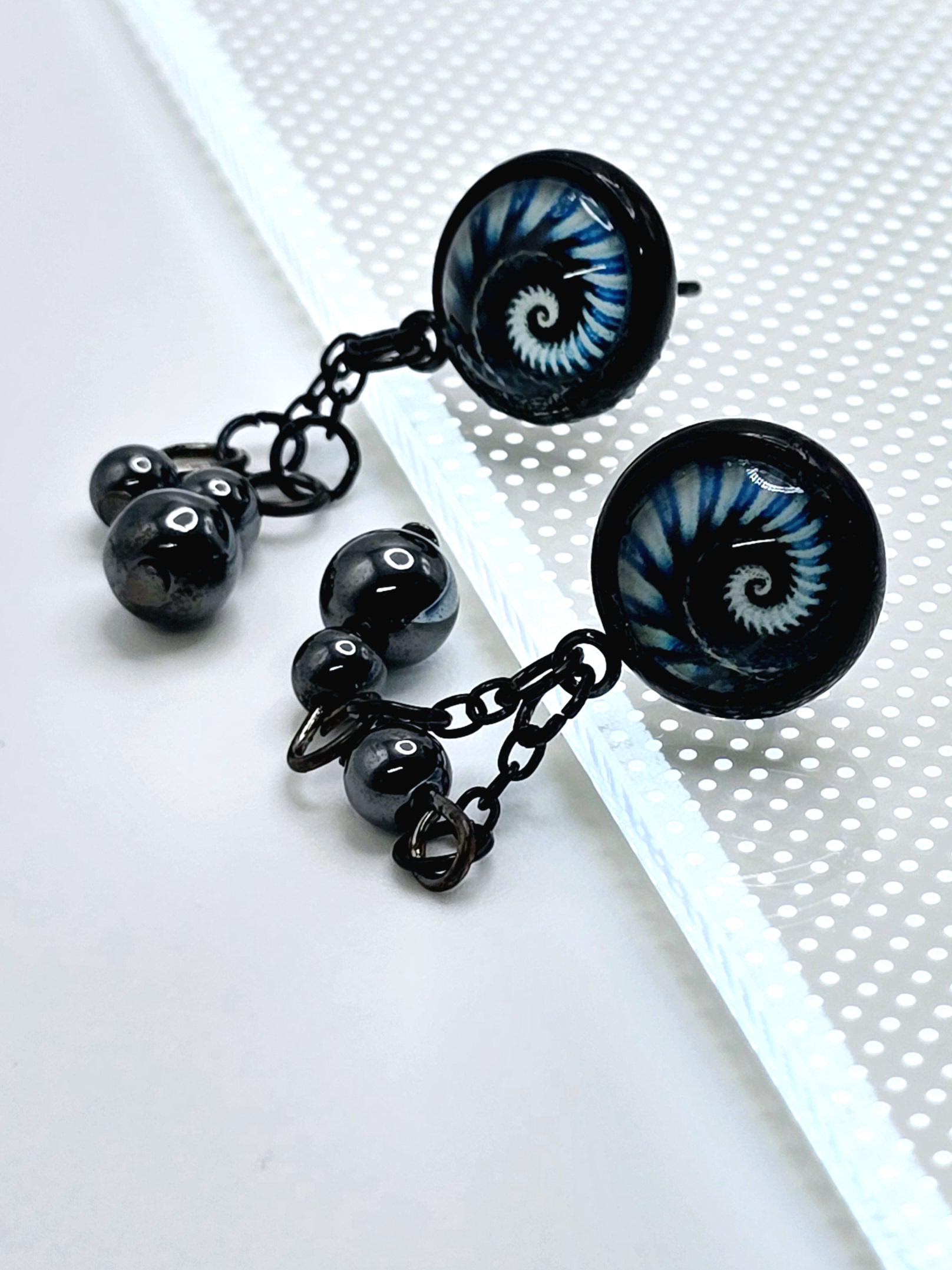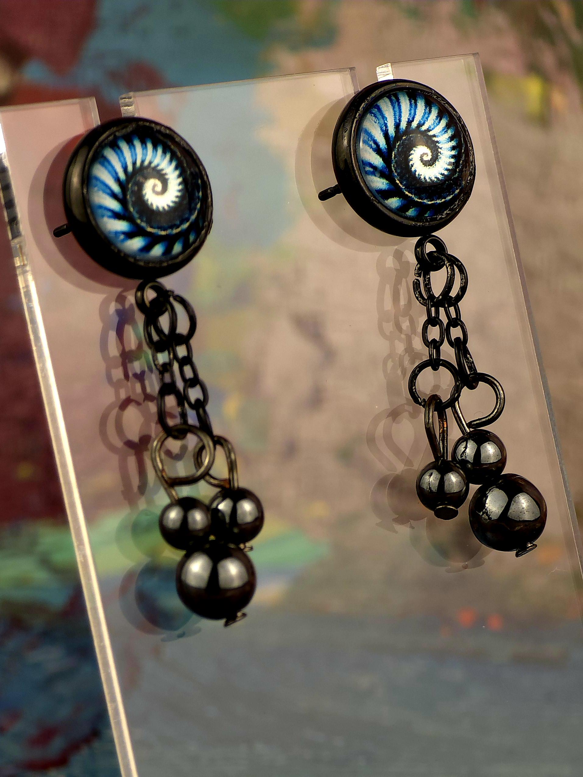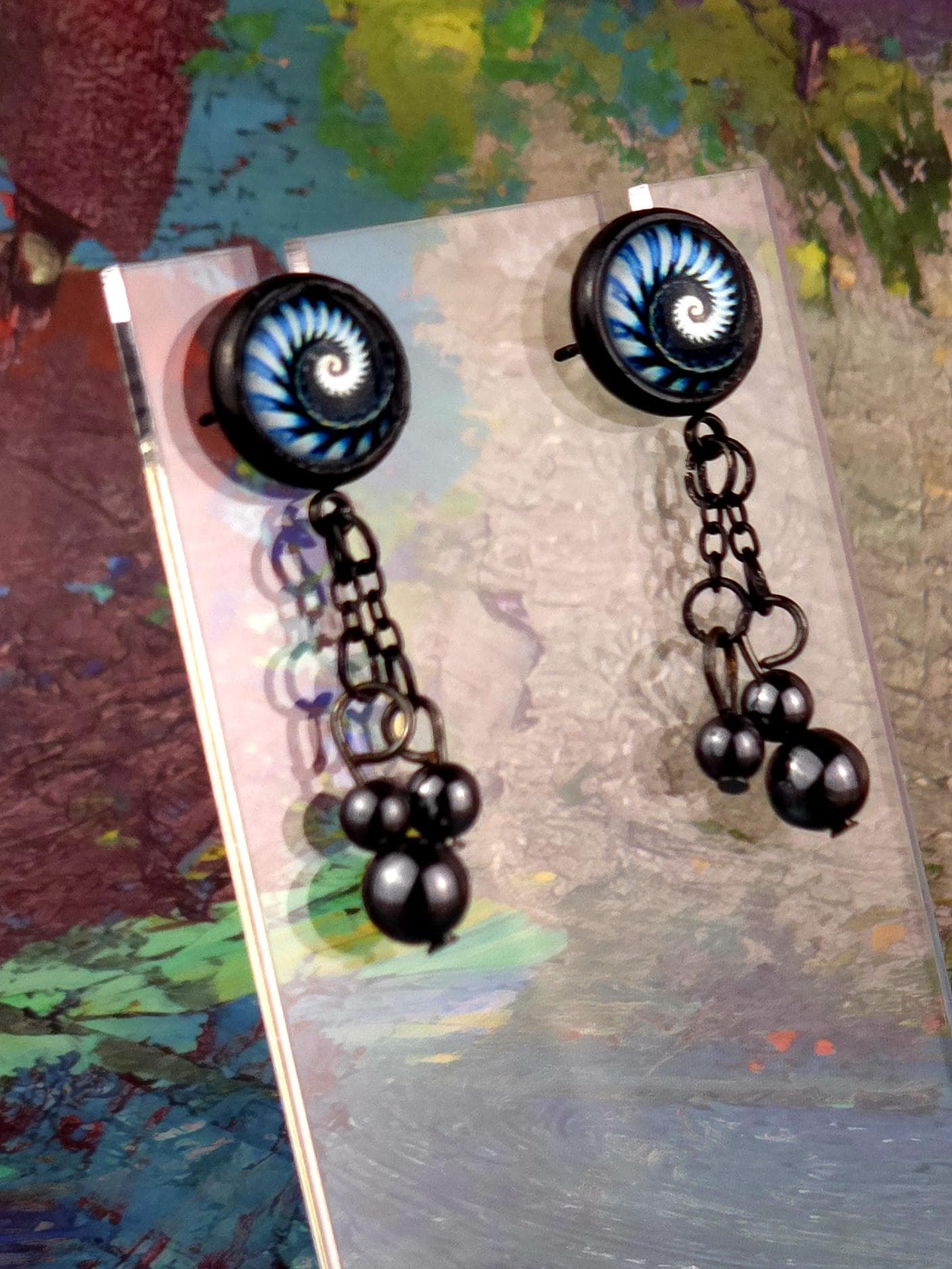 Bring a hit of modern elegance to your look with these stunning black stainless steel stud earrings. The 12mm Cabochon setting features a mesmerizing black and blue kaleidoscope design, adding a pop of color and intrigue to your ensemble. 3 natural stone crystals dangling beautifully from the post stud earrings. These earrings measure 3cm in length, with a 2cm drop length, making them the perfect statement piece for any outfit. Elevate your style with these unique and eye-catching earrings that are sure to turn heads wherever you go.