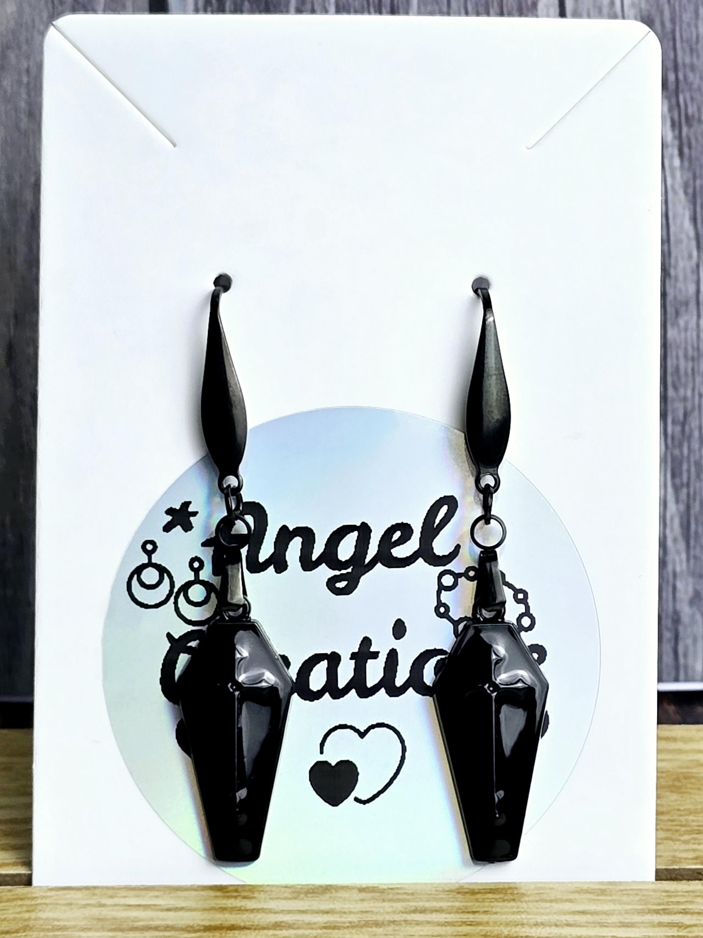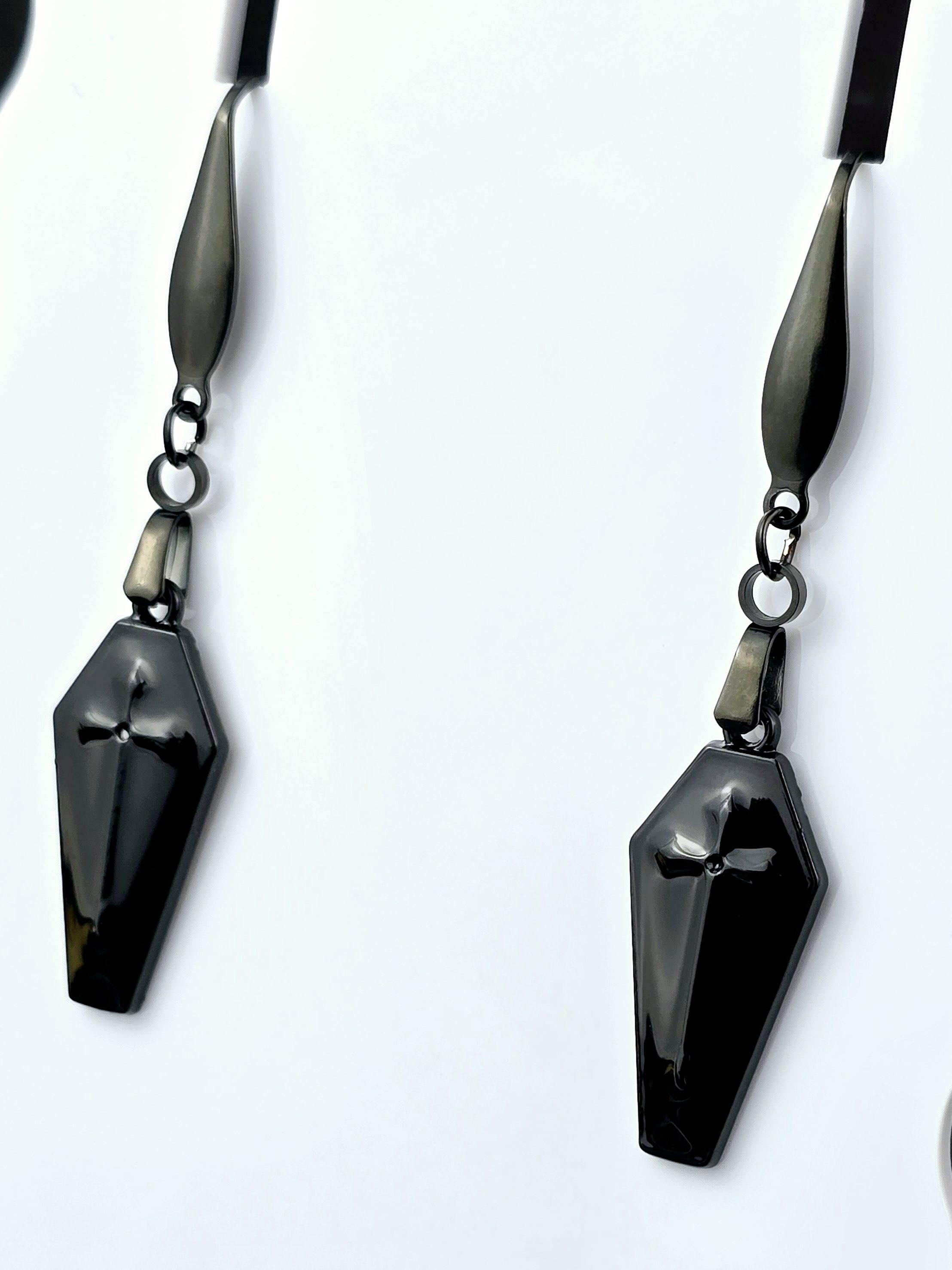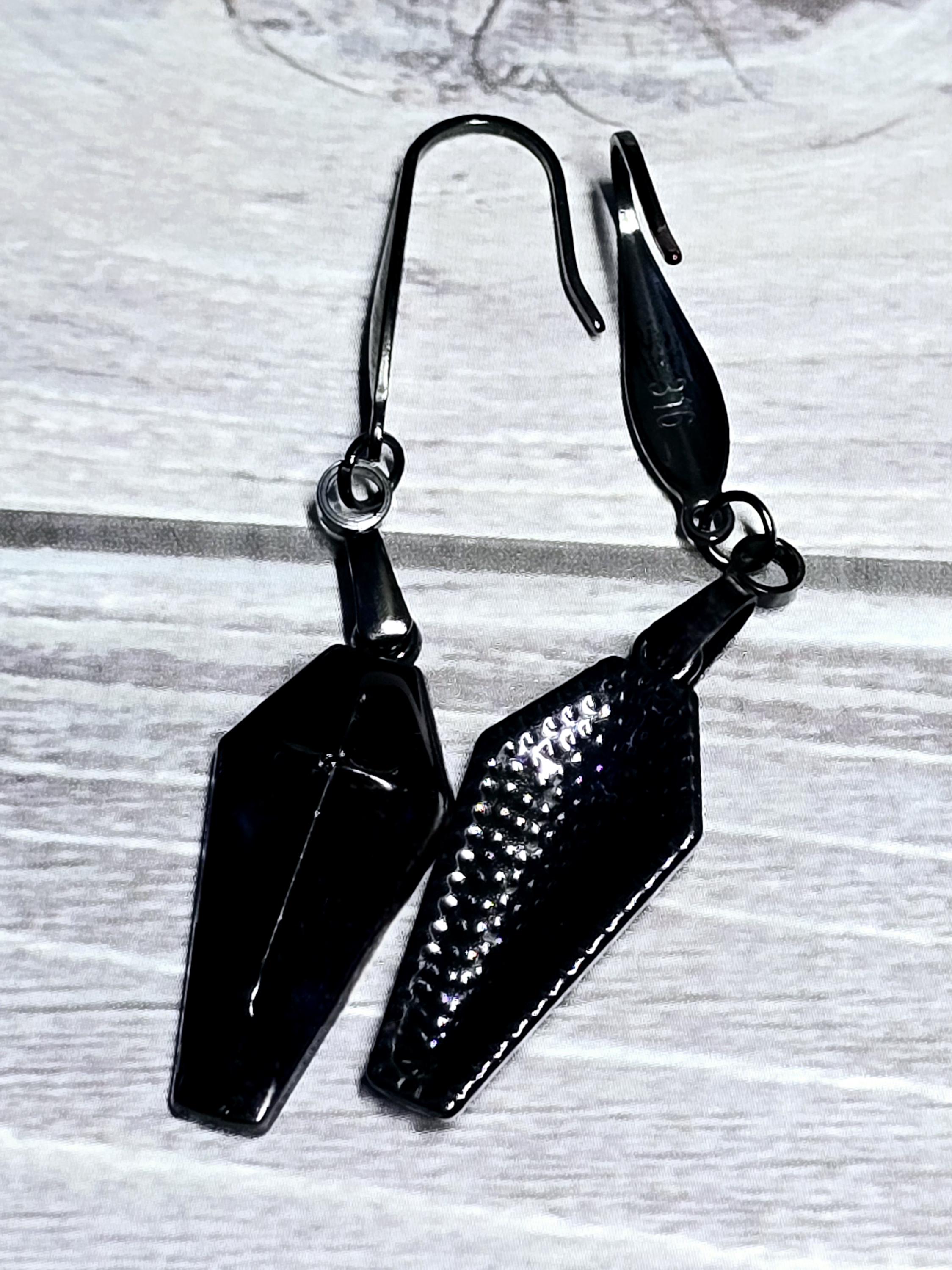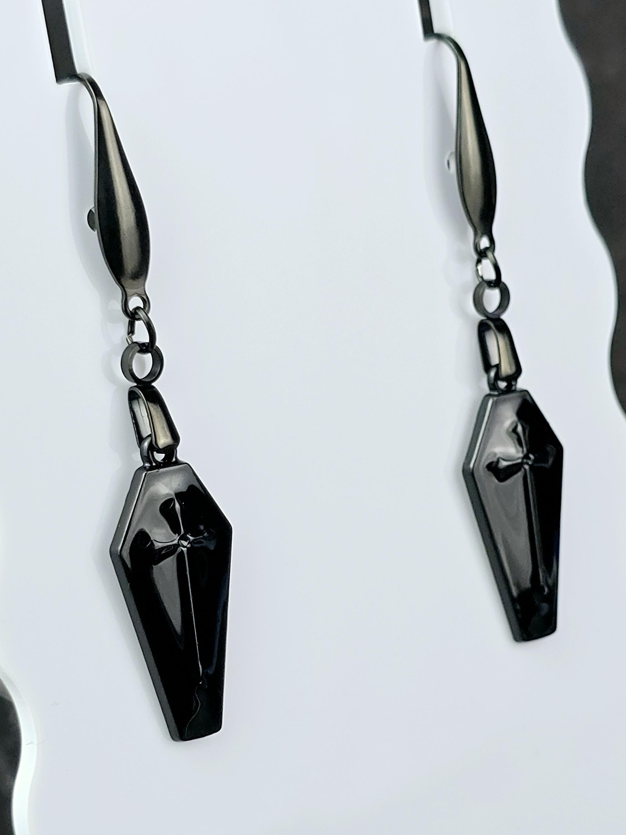 Add a touch of gothic flair to your look with these black stainless steel wire hook style earrings featuring black enamel coated coffin charms. The total length of these earrings is 5.5cm, with a drop length of 3.5cm and a width of 1cm. The black stainless steel earring hooks perfectly complement the dark and edgy vibe of the enamel coated coffin charms. Make a bold statement with these unique and stylish earrings.