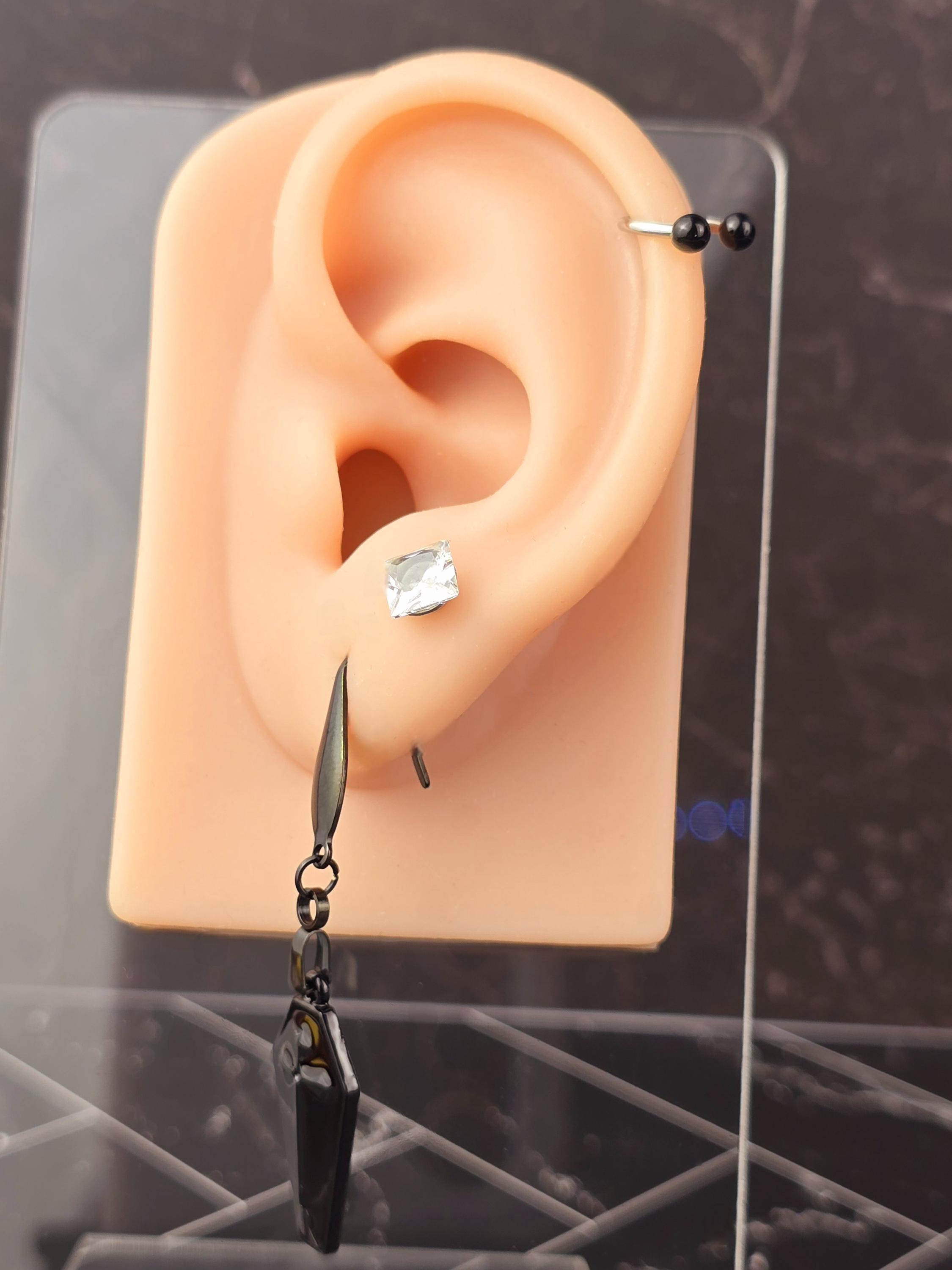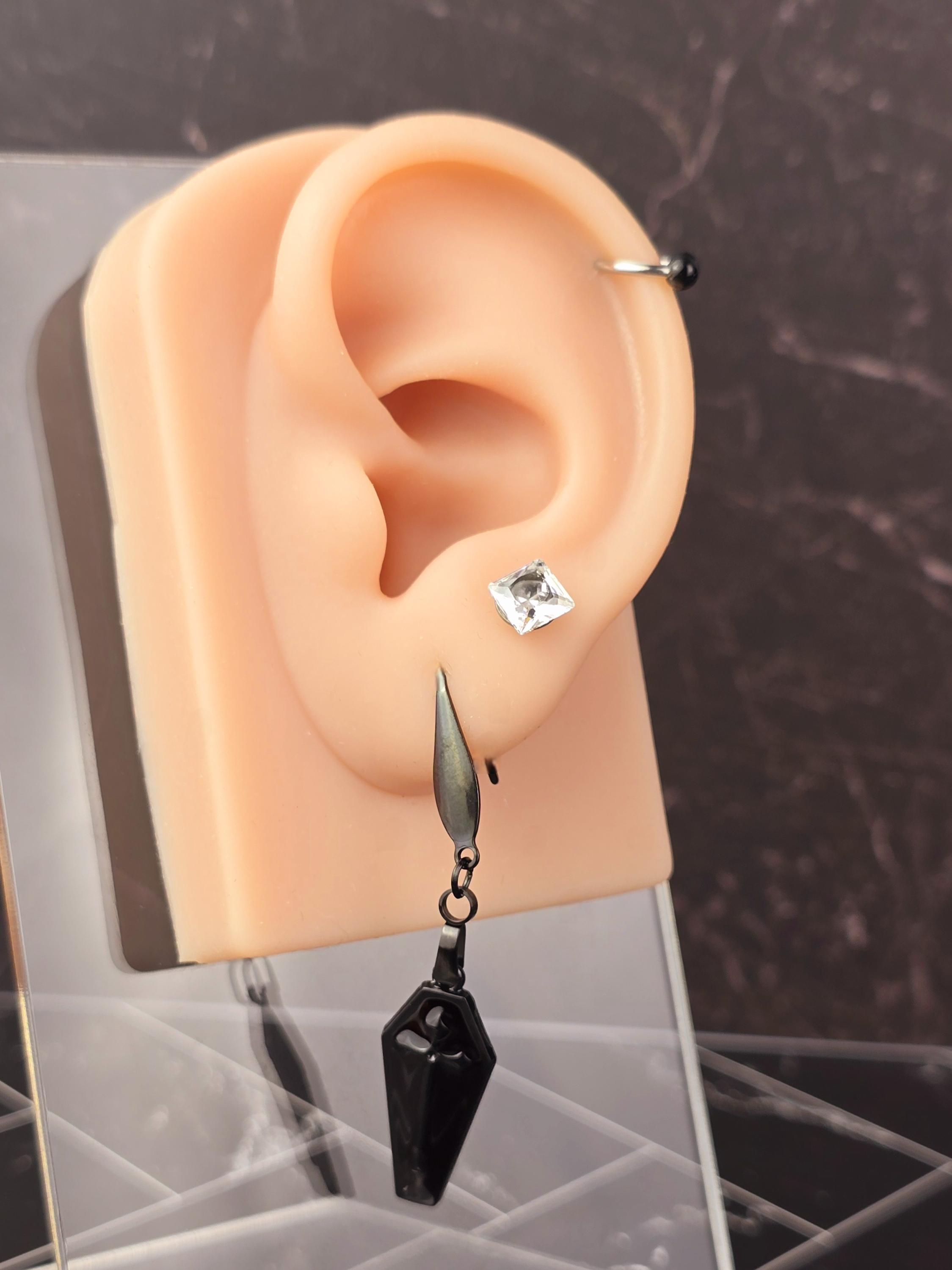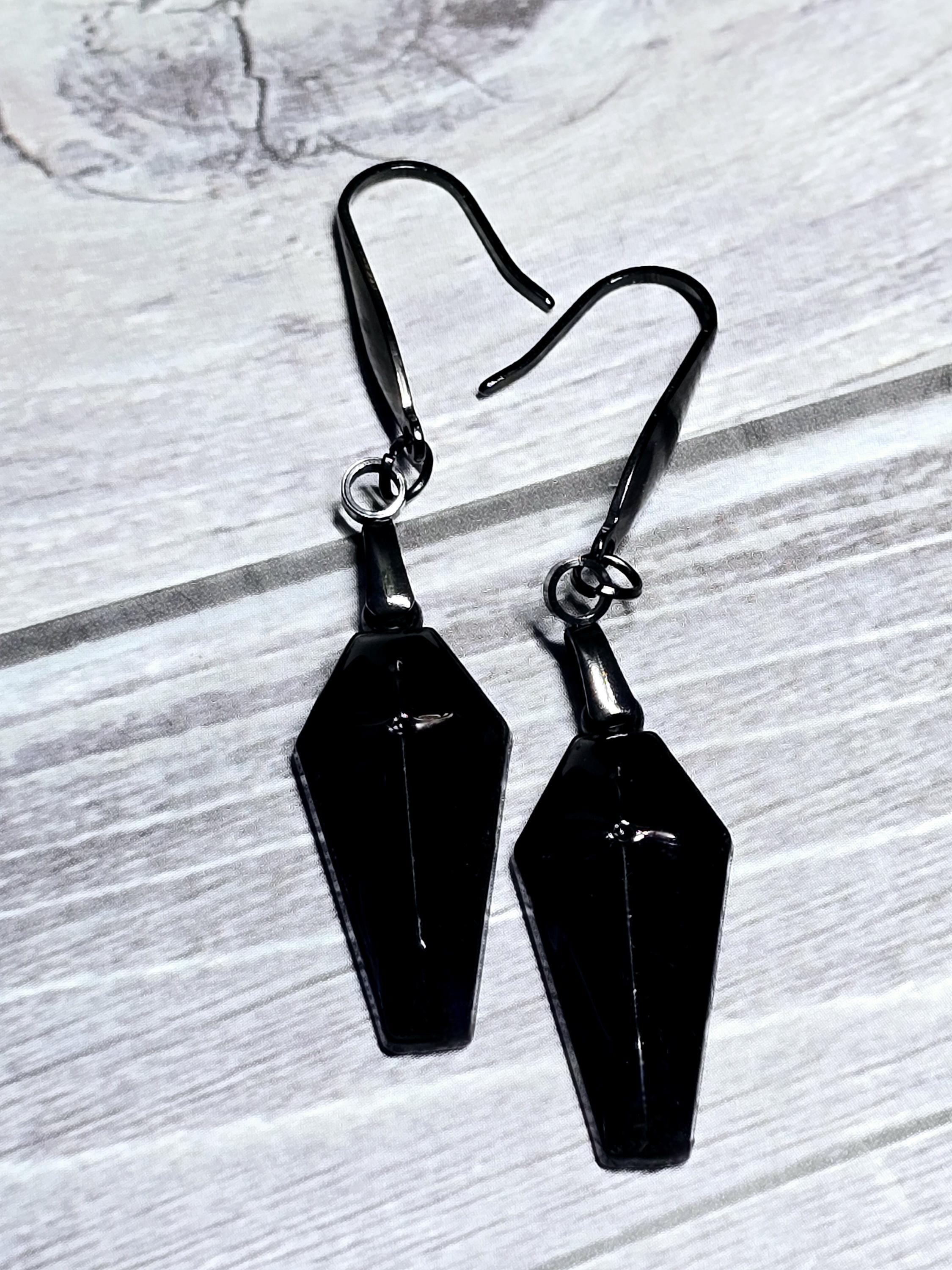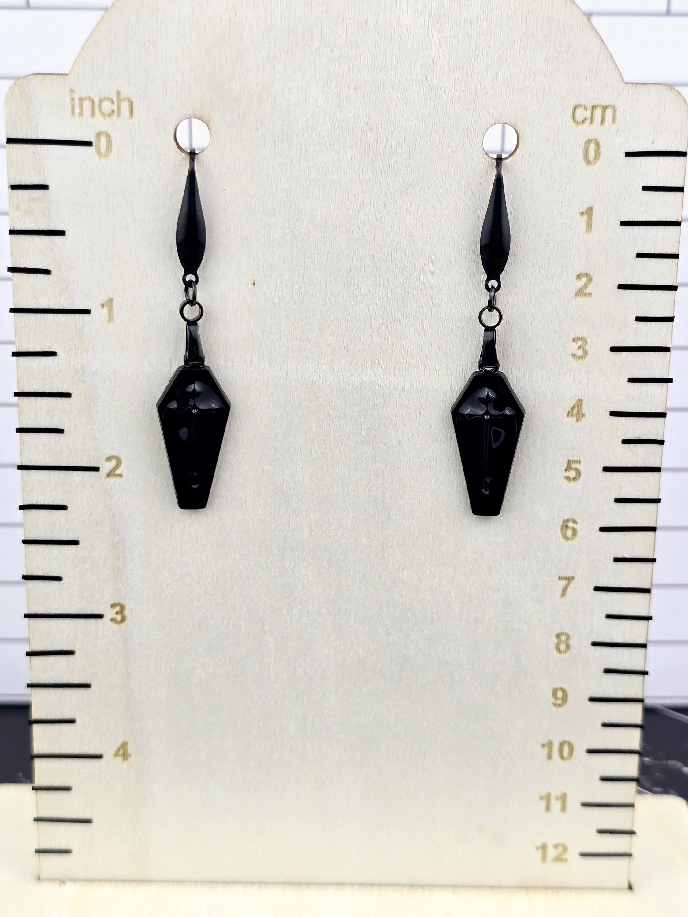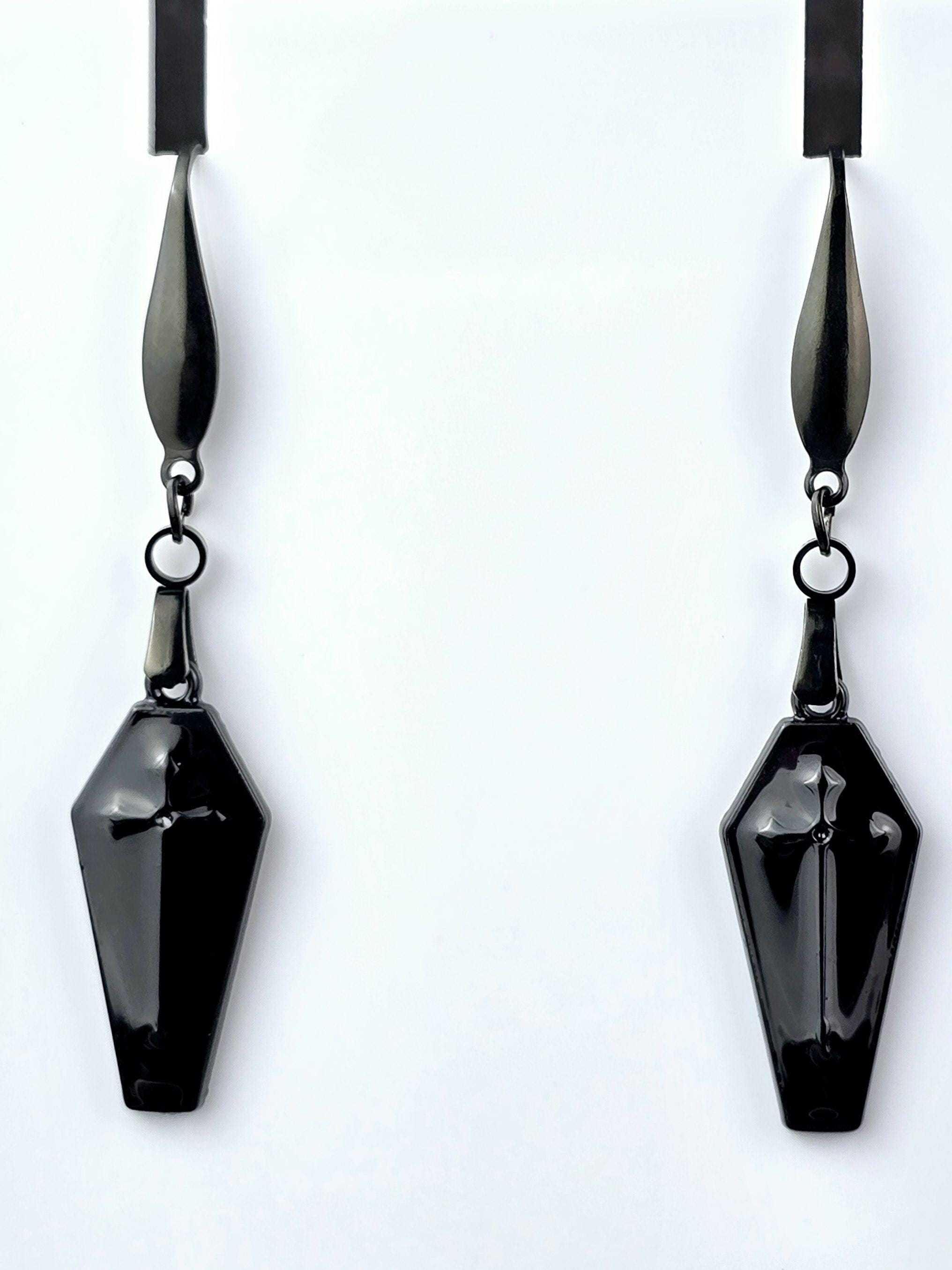 Add a touch of gothic flair to your look with these black stainless steel wire hook style earrings featuring black enamel coated coffin charms. The total length of these earrings is 5.5cm, with a drop length of 3.5cm and a width of 1cm. The black stainless steel earring hooks perfectly complement the dark and edgy vibe of the enamel coated coffin charms. Make a bold statement with these unique and stylish earrings.