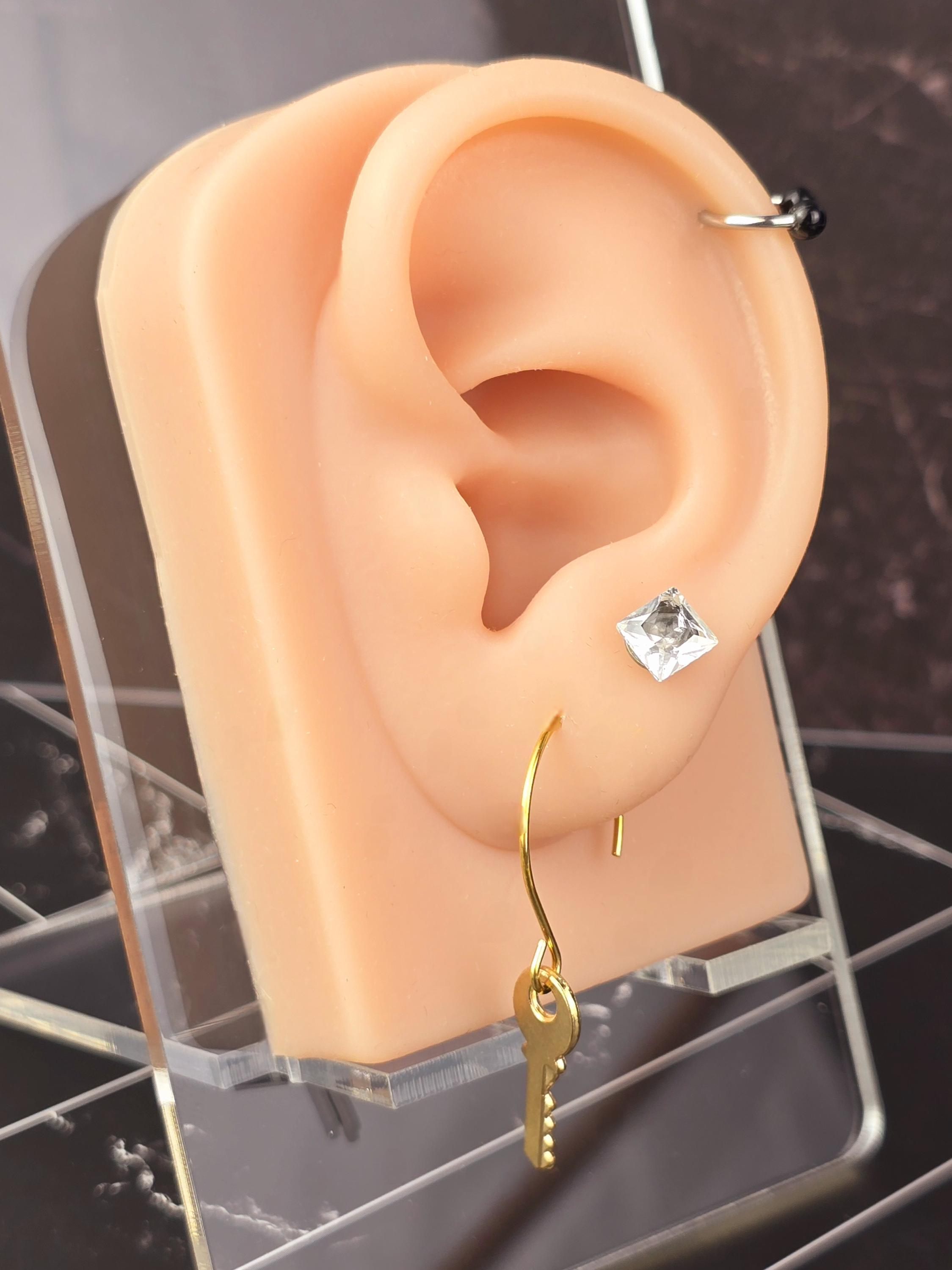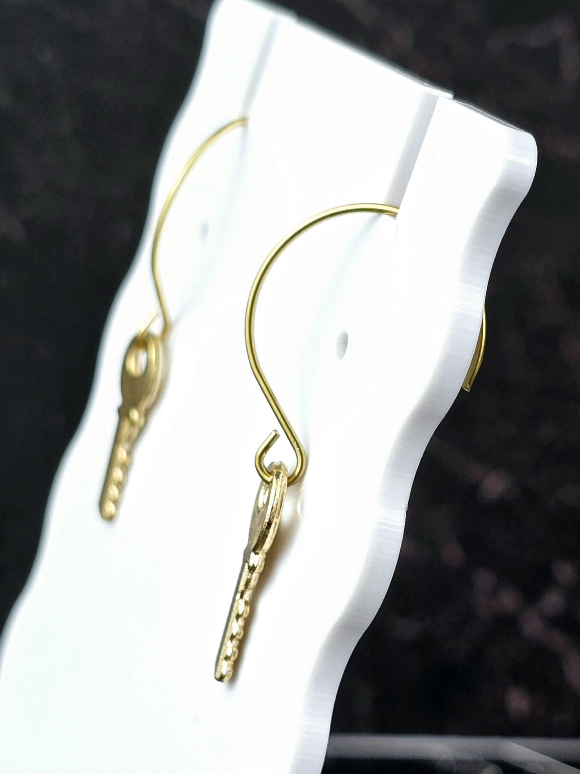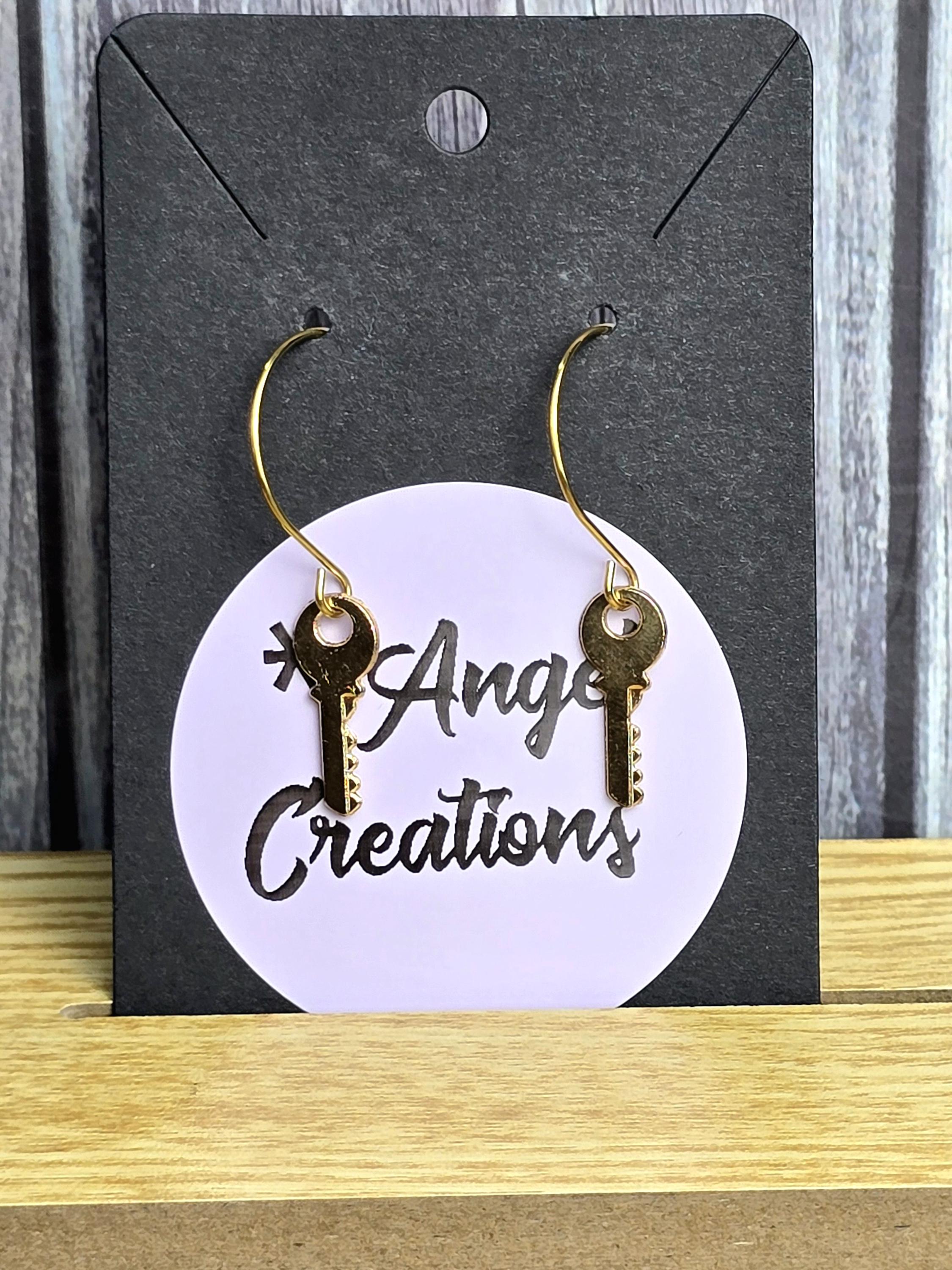 Show your elegance with these stunning gold stainless steel wire hoop earrings. The hoops measure 2.5mm in diameter and feature a secure .10mm ear pin for comfortable wear. Dangling from the hoops are charming metal alloy gold key charms, adding a unique and stylish element to the design. These earrings have a total length of 4cm, with a drop length of 2cm and a width of 0.5cm, making them the perfect accessory for any occasion. Elevate your look with these chic and versatile earrings that are sure to make a statement.