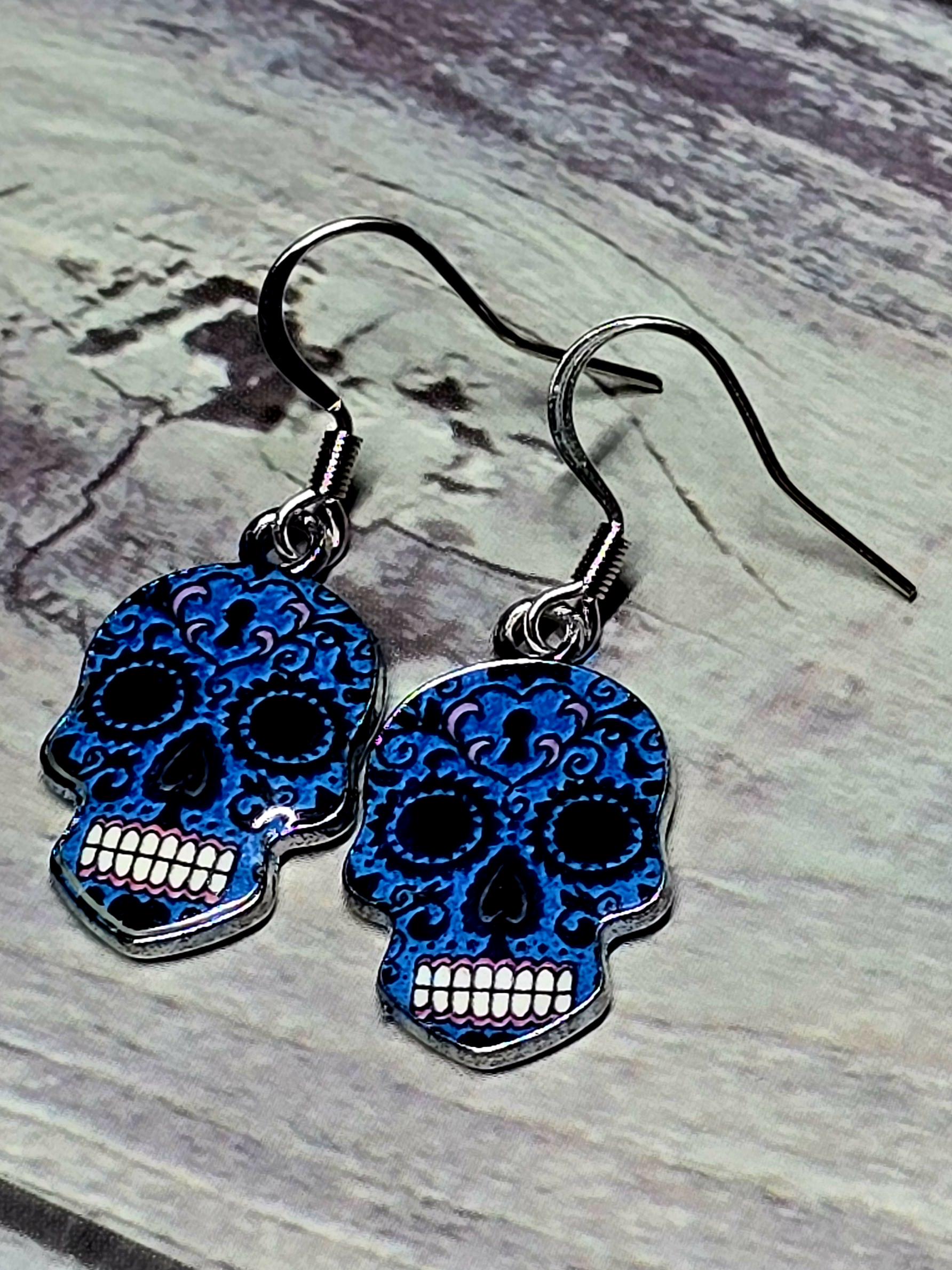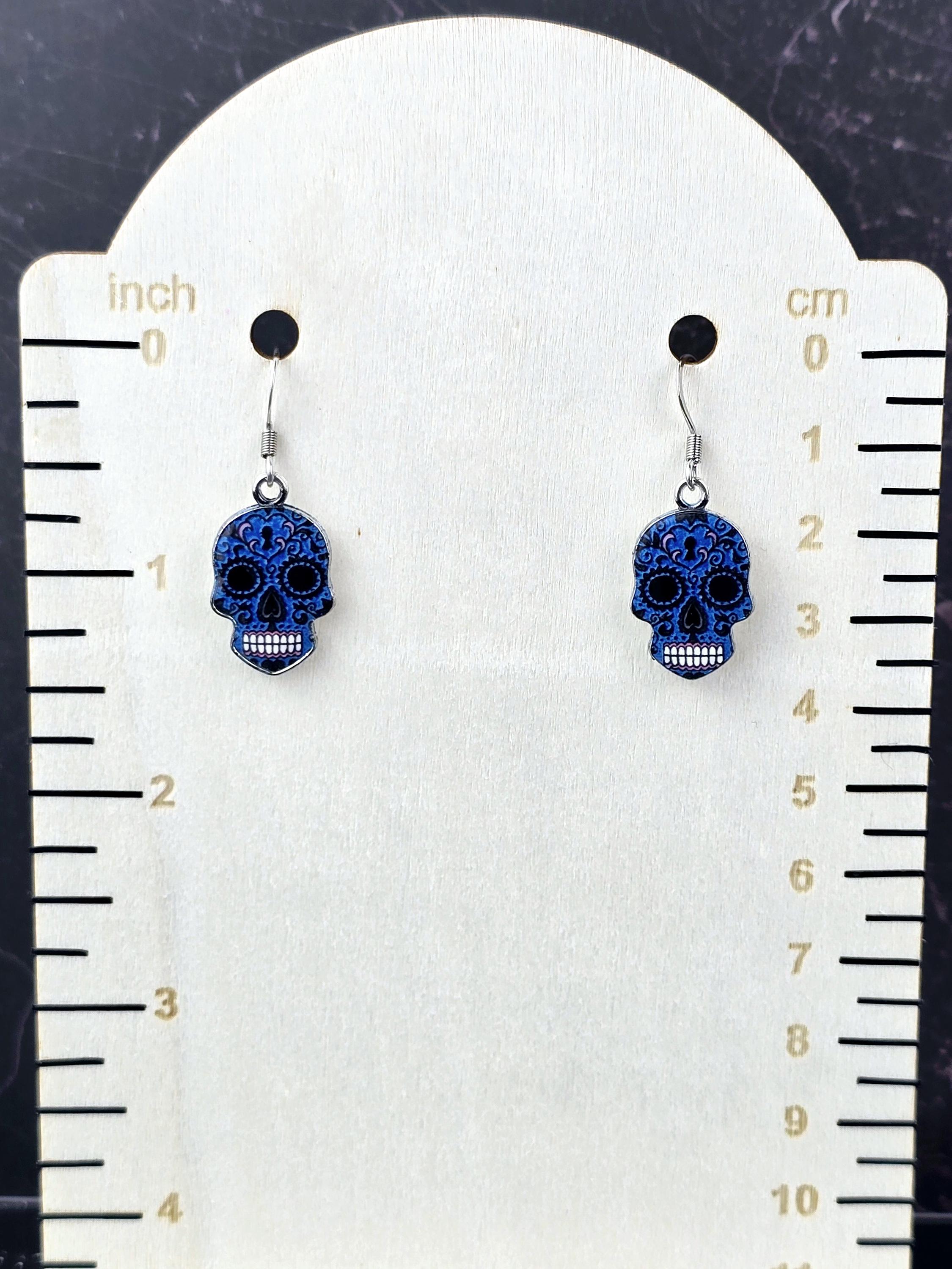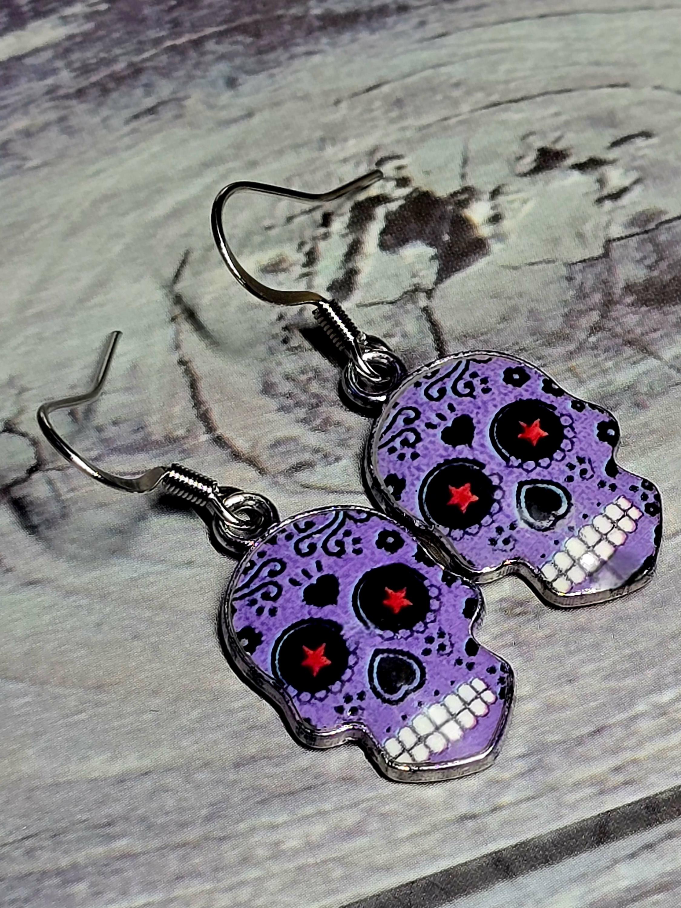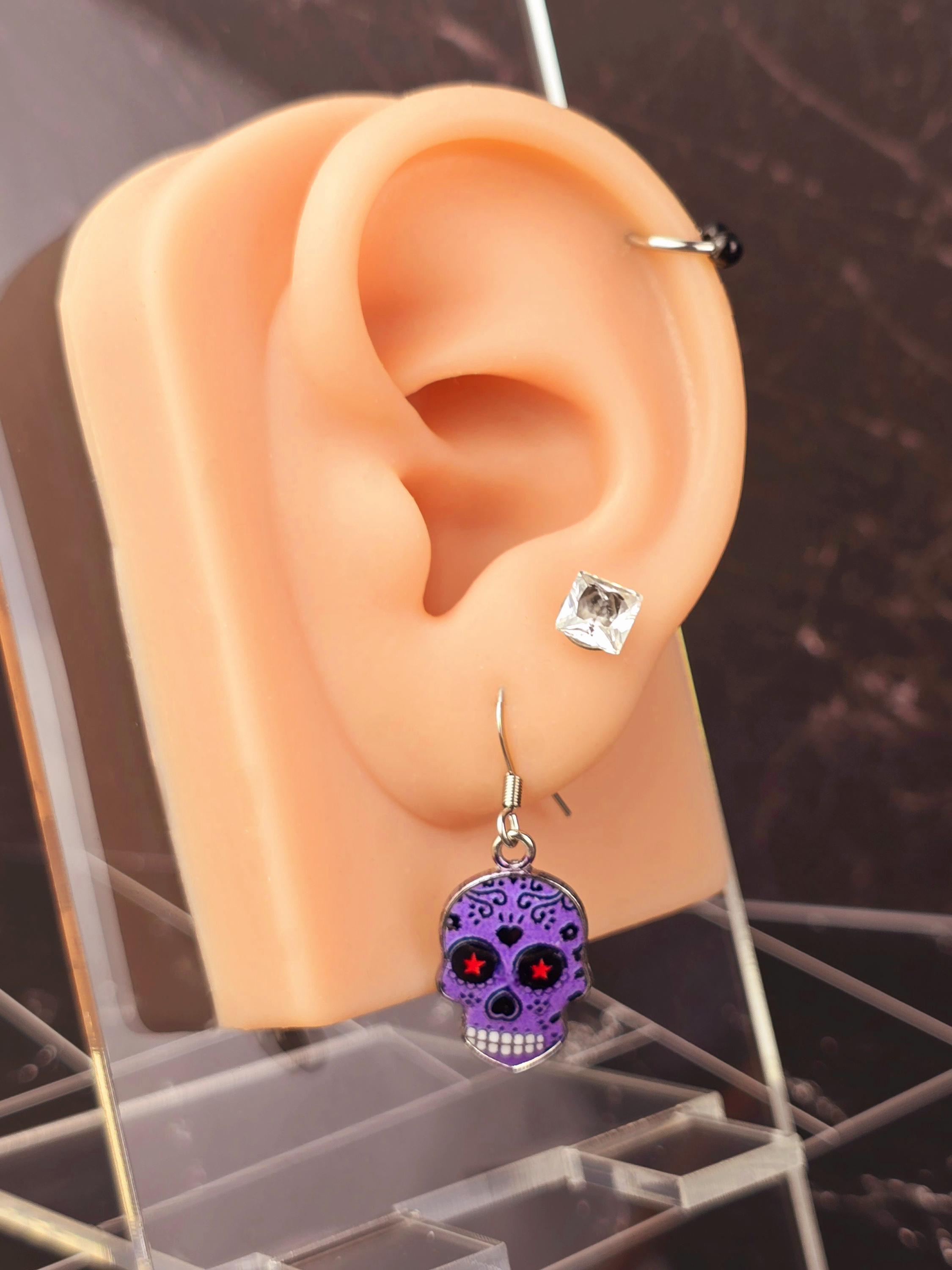 Want to add some edge style to your look with these unique silver stainless steel wire fishhook earrings featuring a metal alloy sugar skull charm. Choose from a variety of vibrant colors including pink, blue, purple, or red for the sugar skull charm, or get one of each! These earrings measure 3.5cm in length with a drop length of 2cm and a width of 1.5cm, making them the perfect statement piece for any outfit. Stand out from the crowd with these eye-catching and trendy earrings that are sure to turn heads wherever you go.