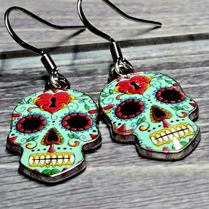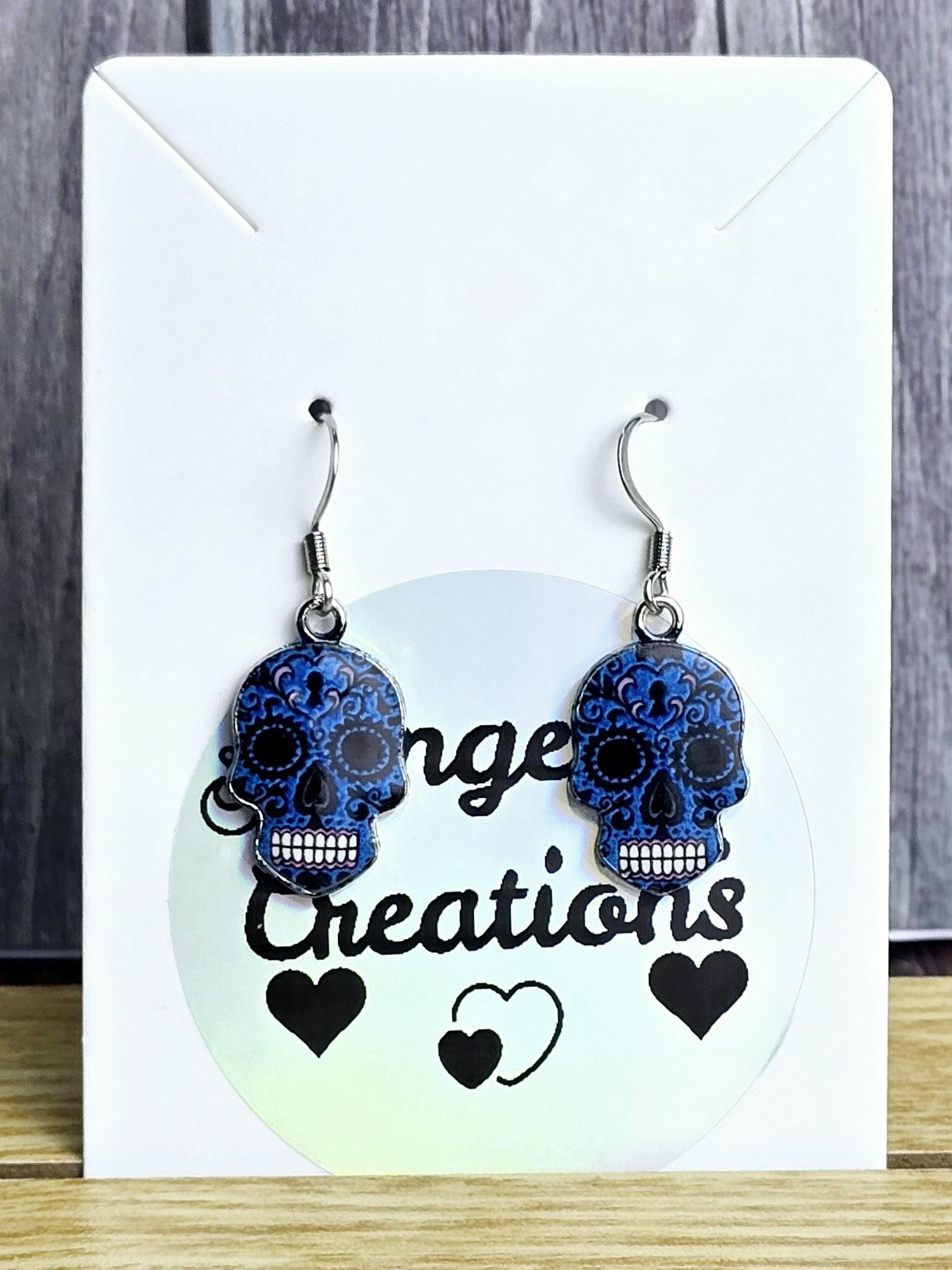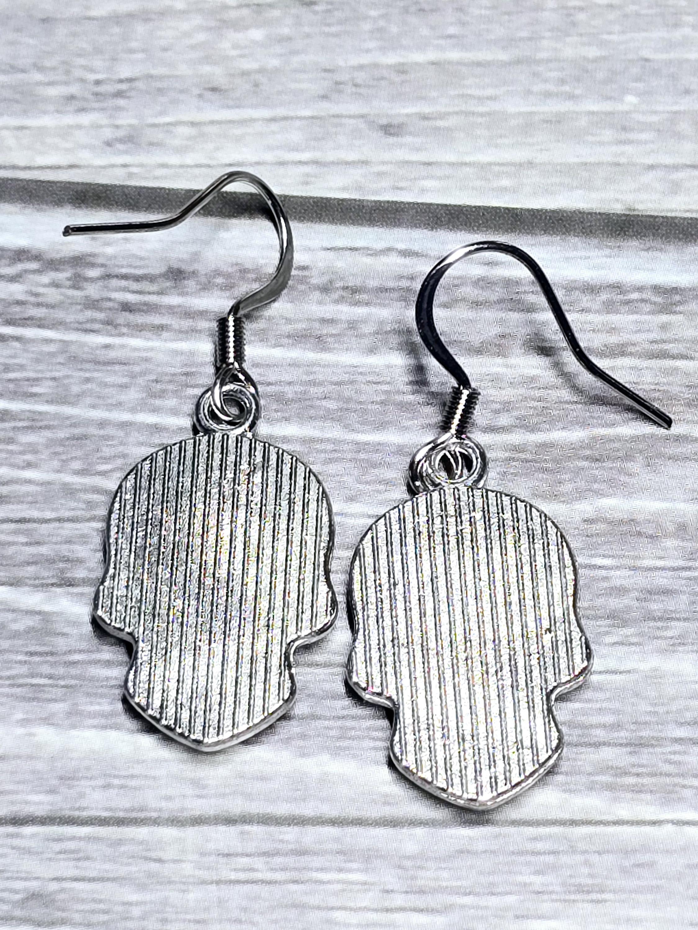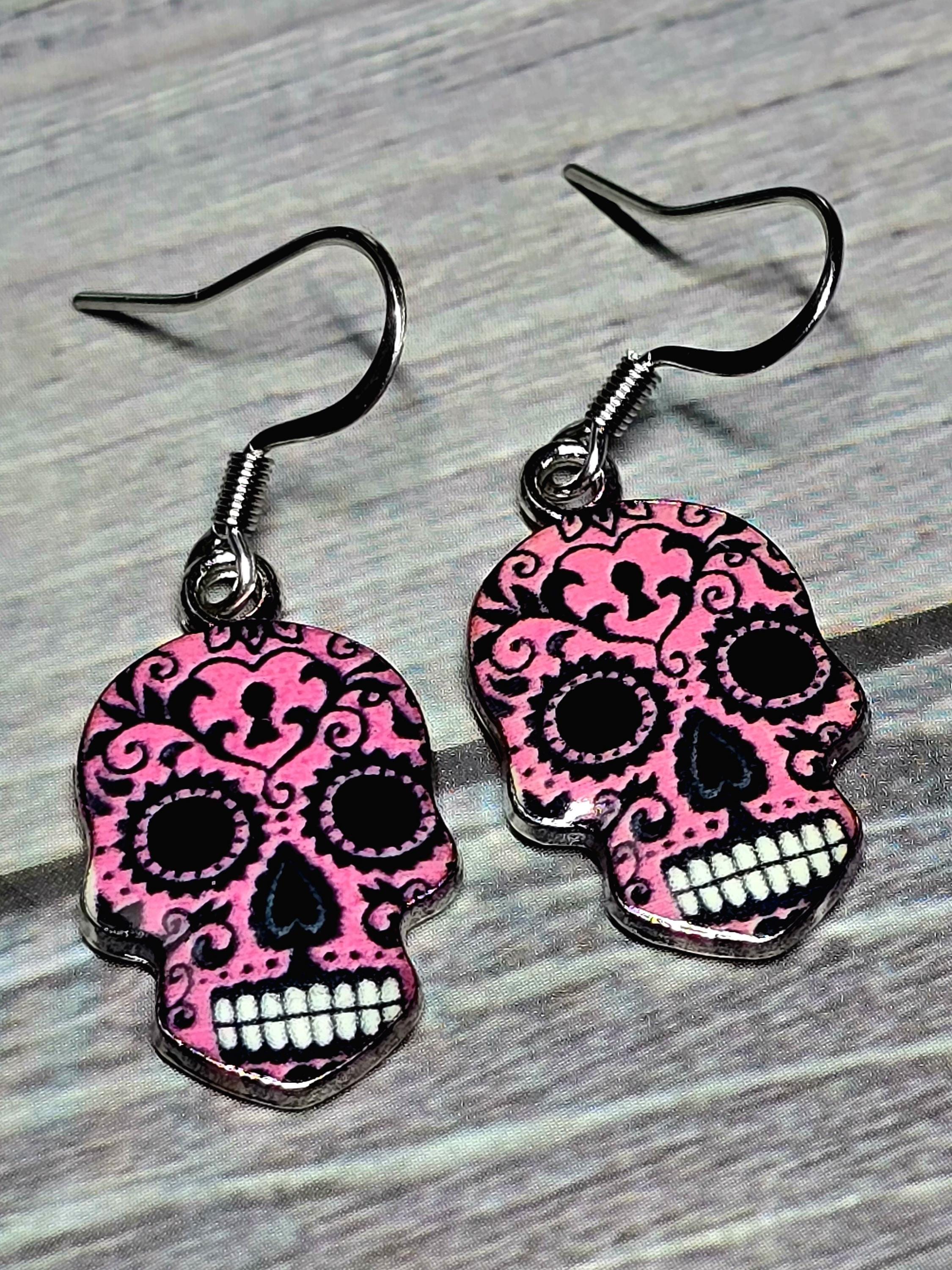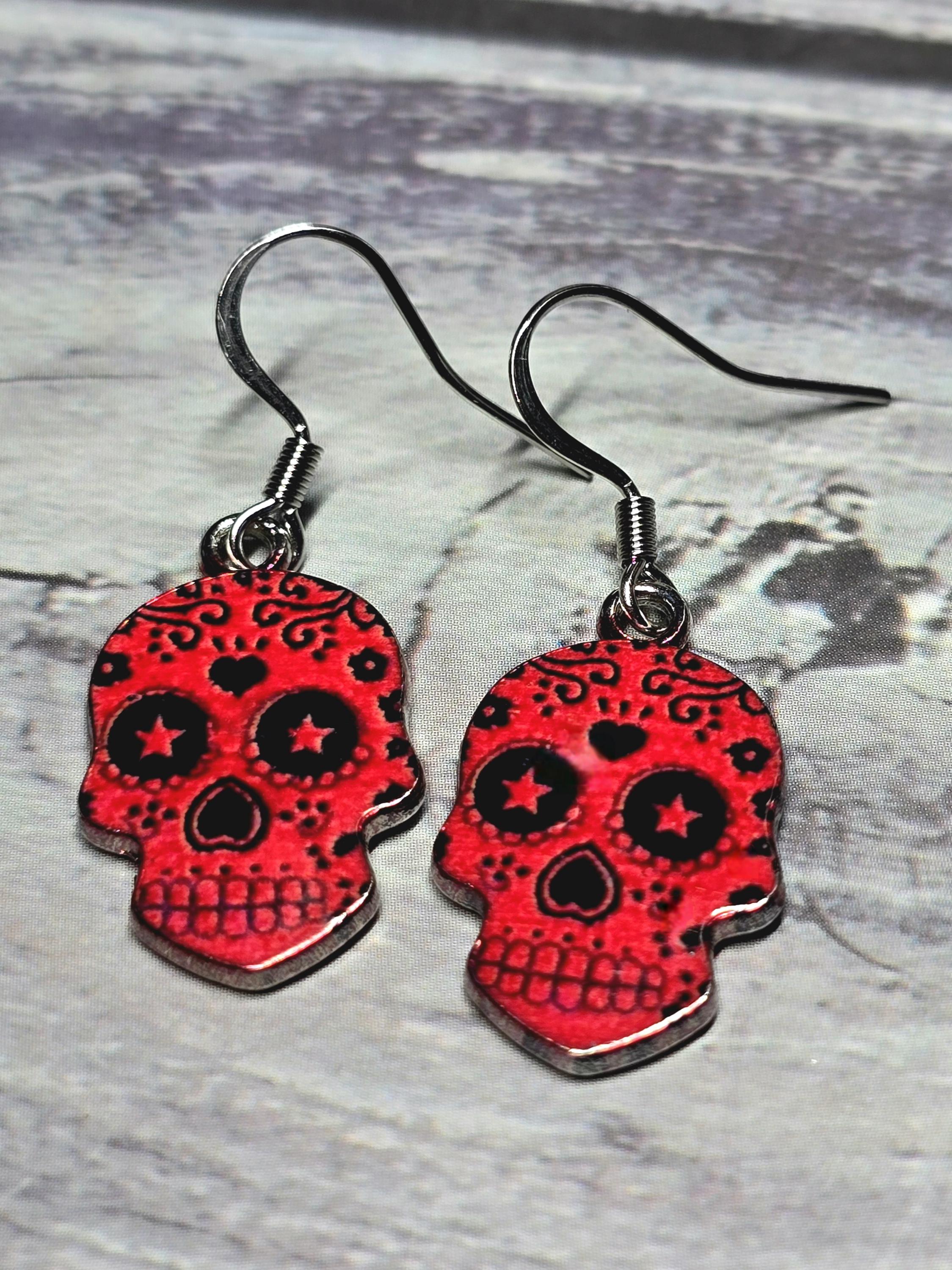 Want to add some edge style to your look with these unique silver stainless steel wire fishhook earrings featuring a metal alloy sugar skull charm. Choose from a variety of vibrant colors including pink, blue, purple, or red for the sugar skull charm, or get one of each! These earrings measure 3.5cm in length with a drop length of 2cm and a width of 1.5cm, making them the perfect statement piece for any outfit. Stand out from the crowd with these eye-catching and trendy earrings that are sure to turn heads wherever you go.