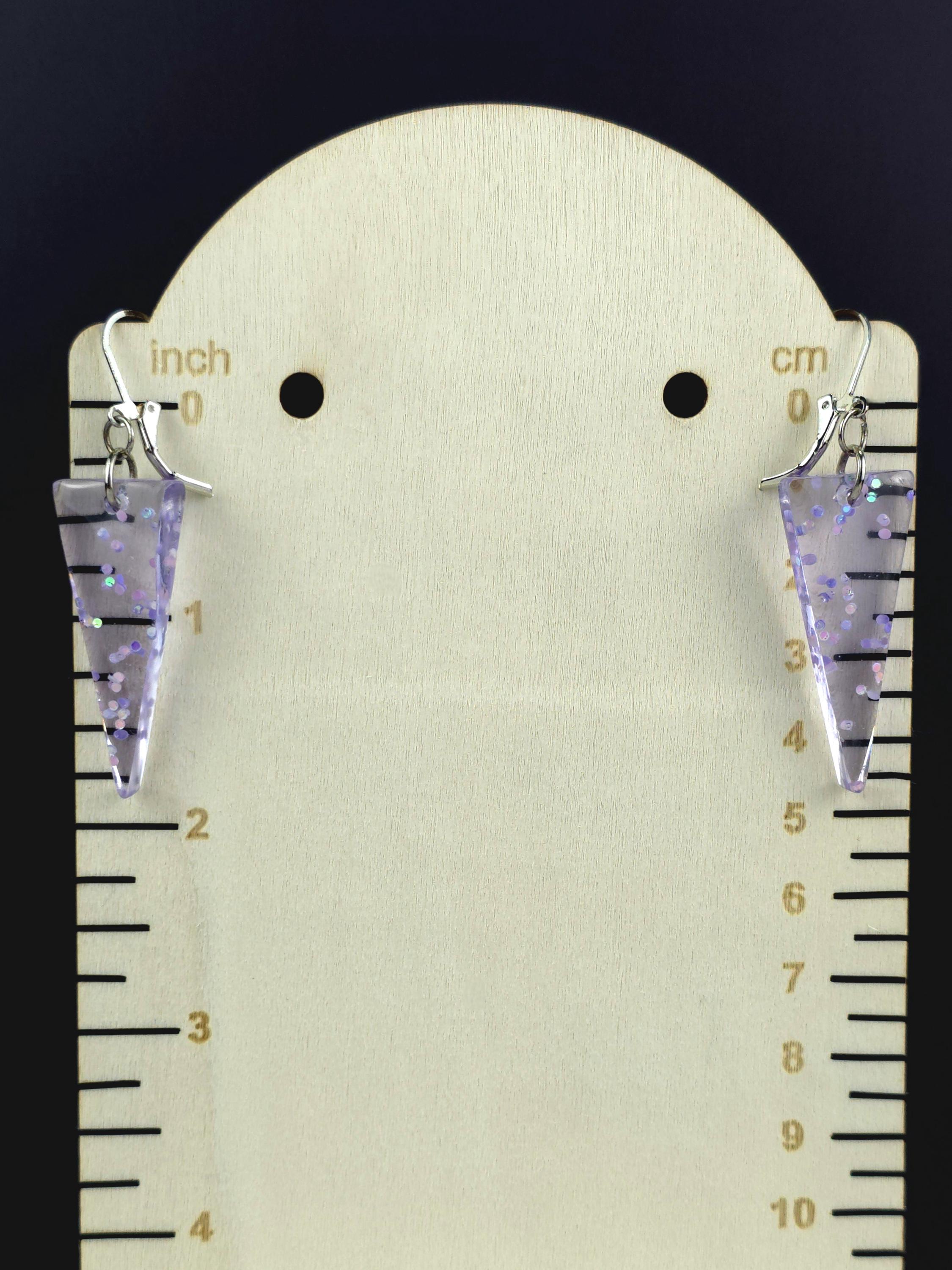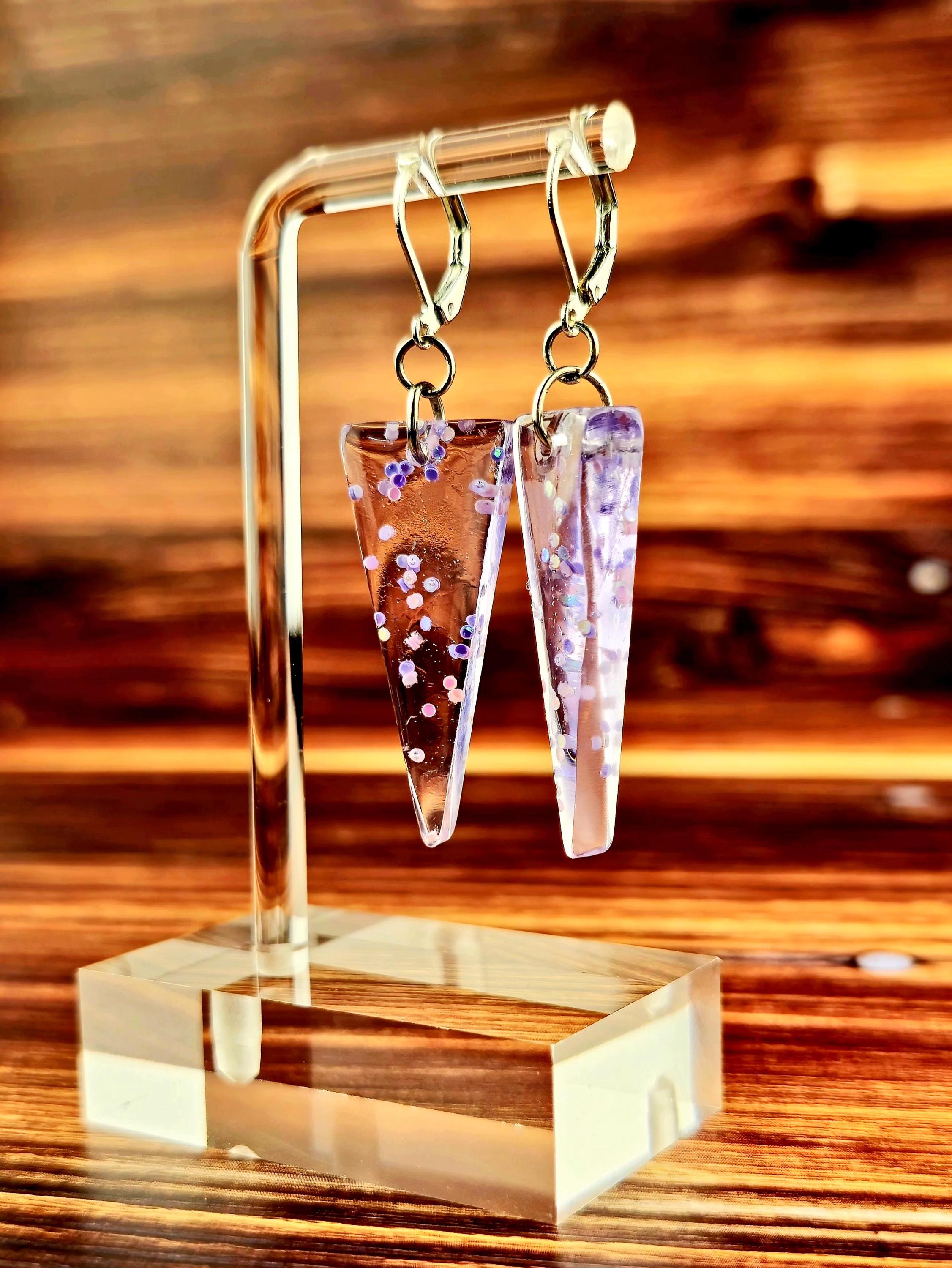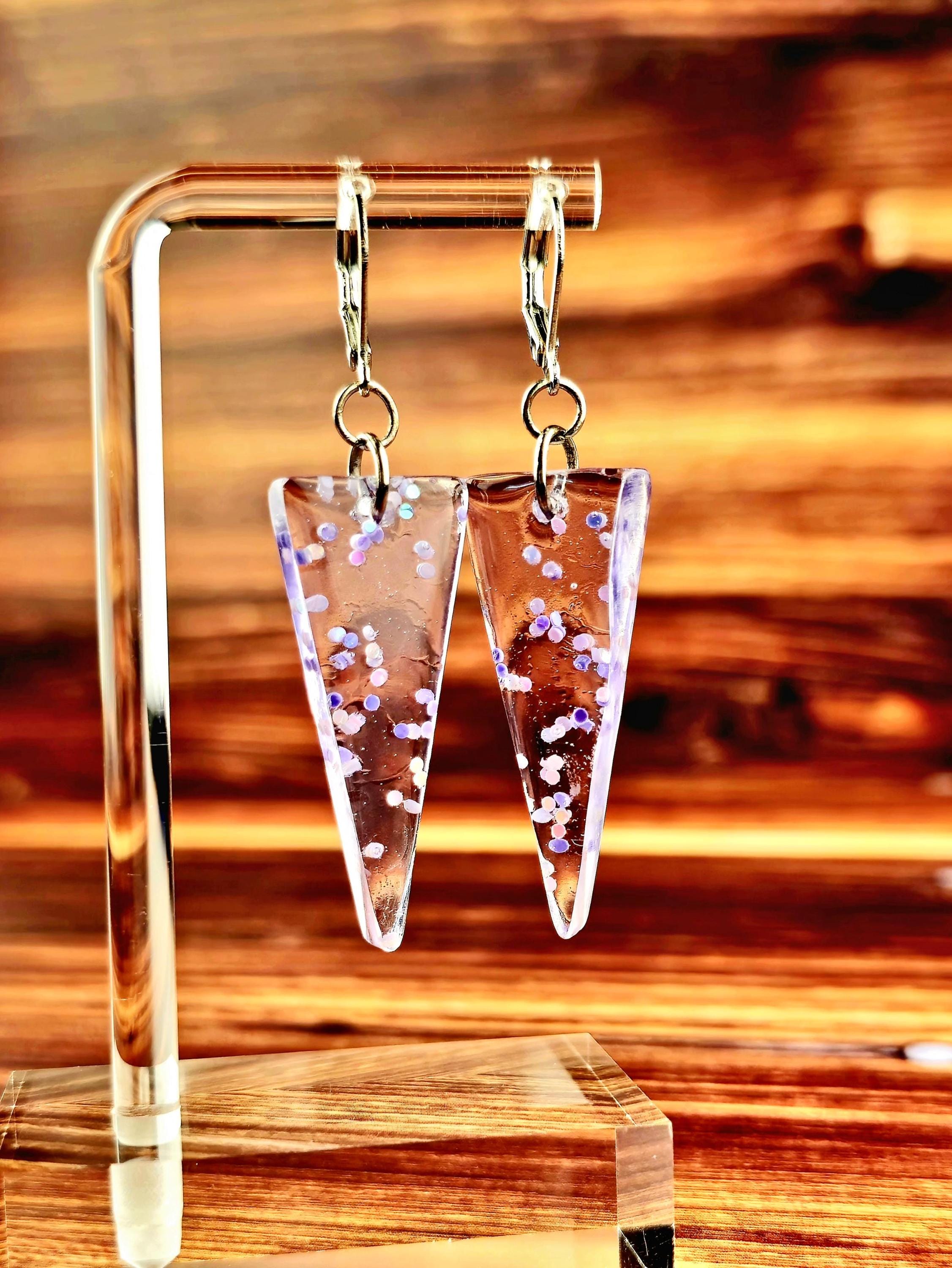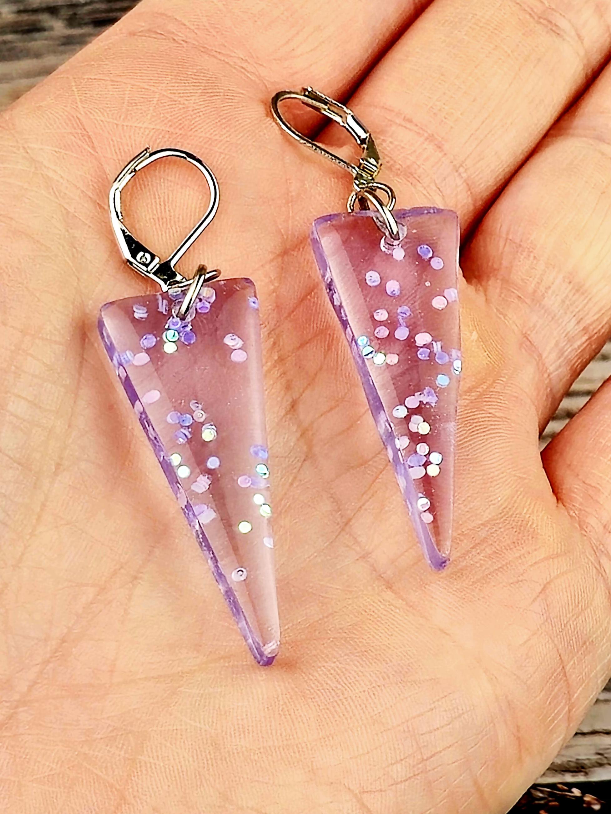 Add a touch of elegance to your outfit with these stunning silver 304 stainless steel French lever-back earrings. The 10x16mm size is perfect for everyday wear, while the premium epoxy resin pendant adds a unique and eye-catching element. The upside down triangle shape features a beautiful light purple translucent color, with pink and purple confetti dots scattered throughout for a playful touch.