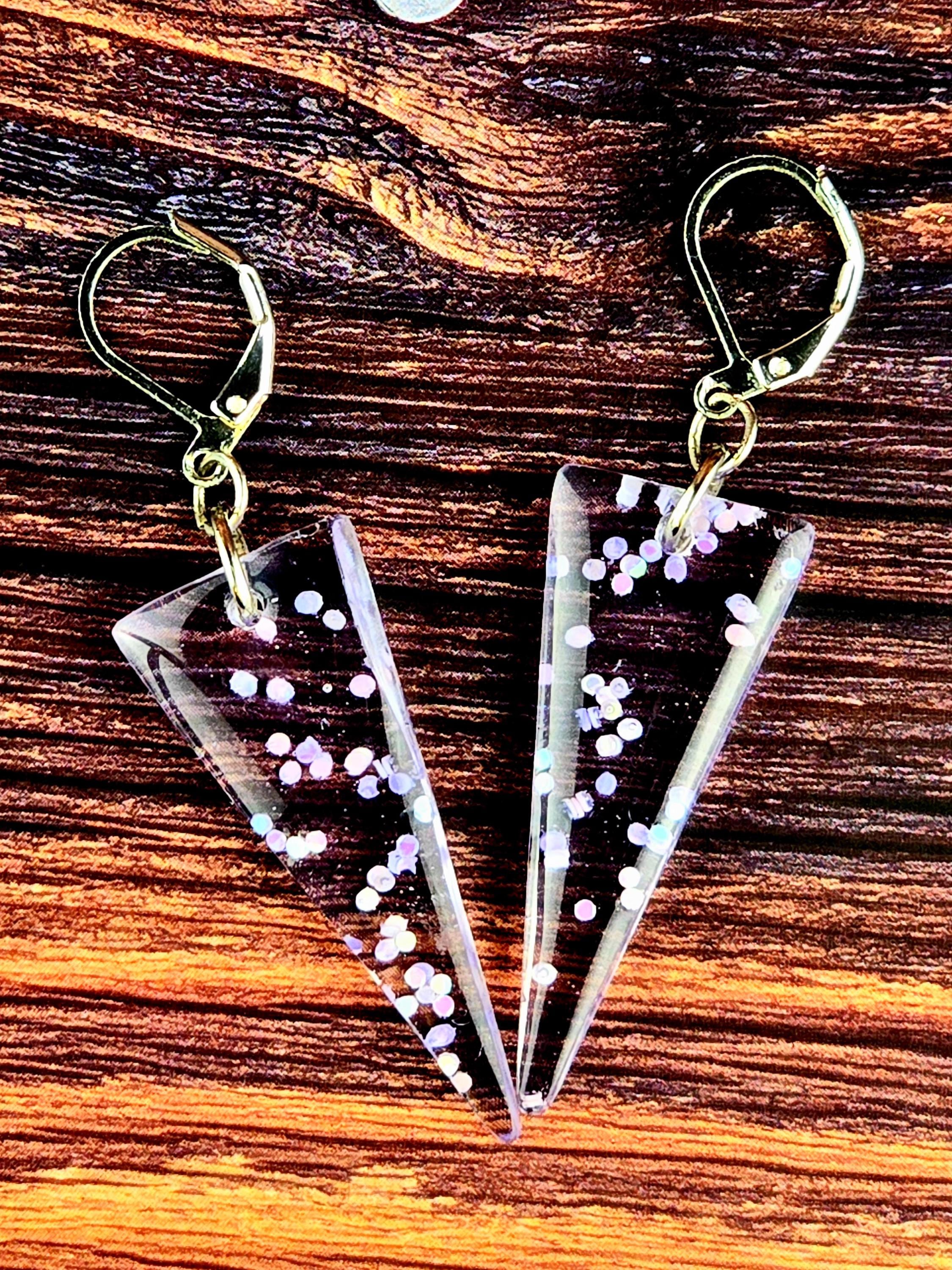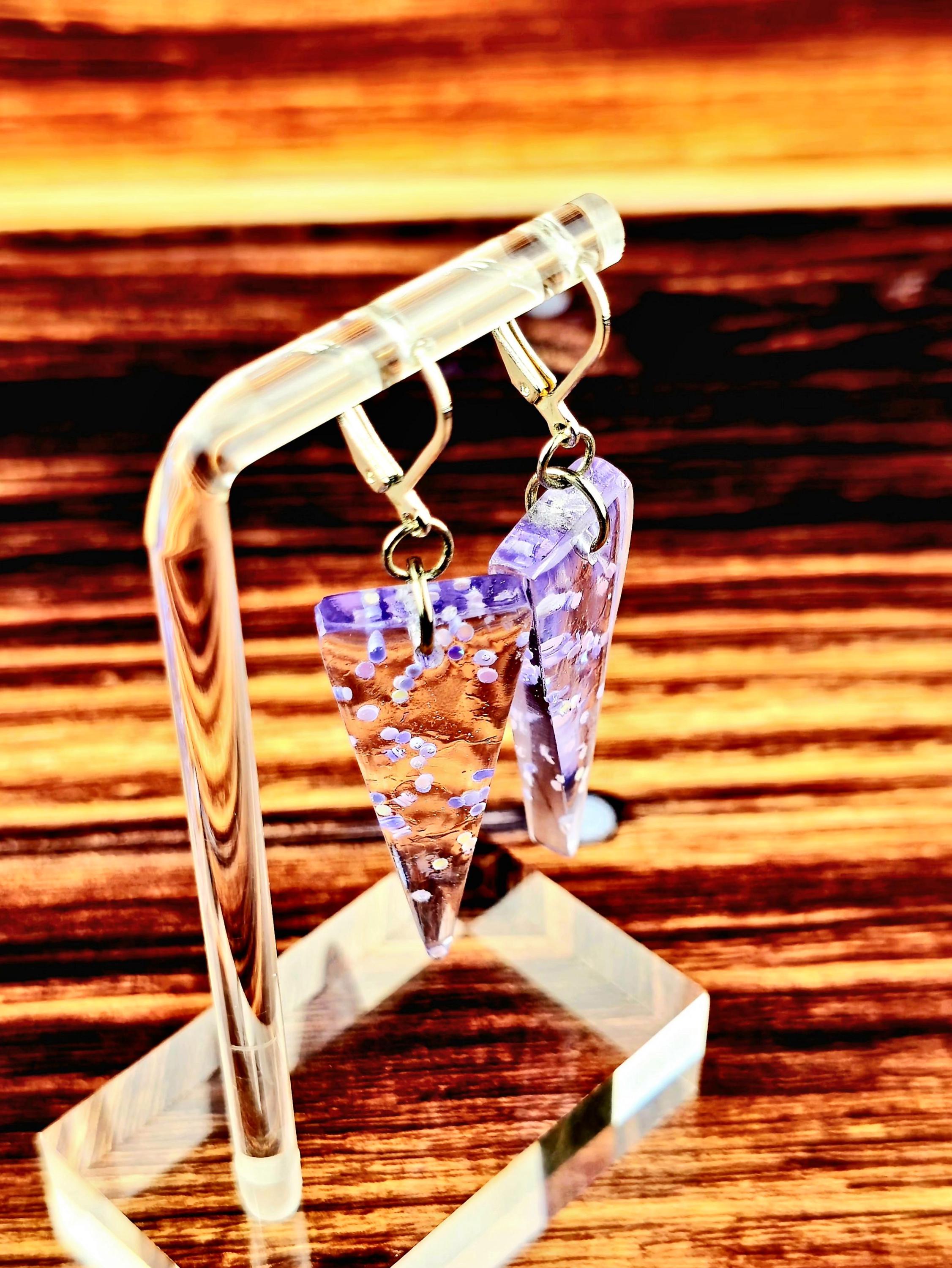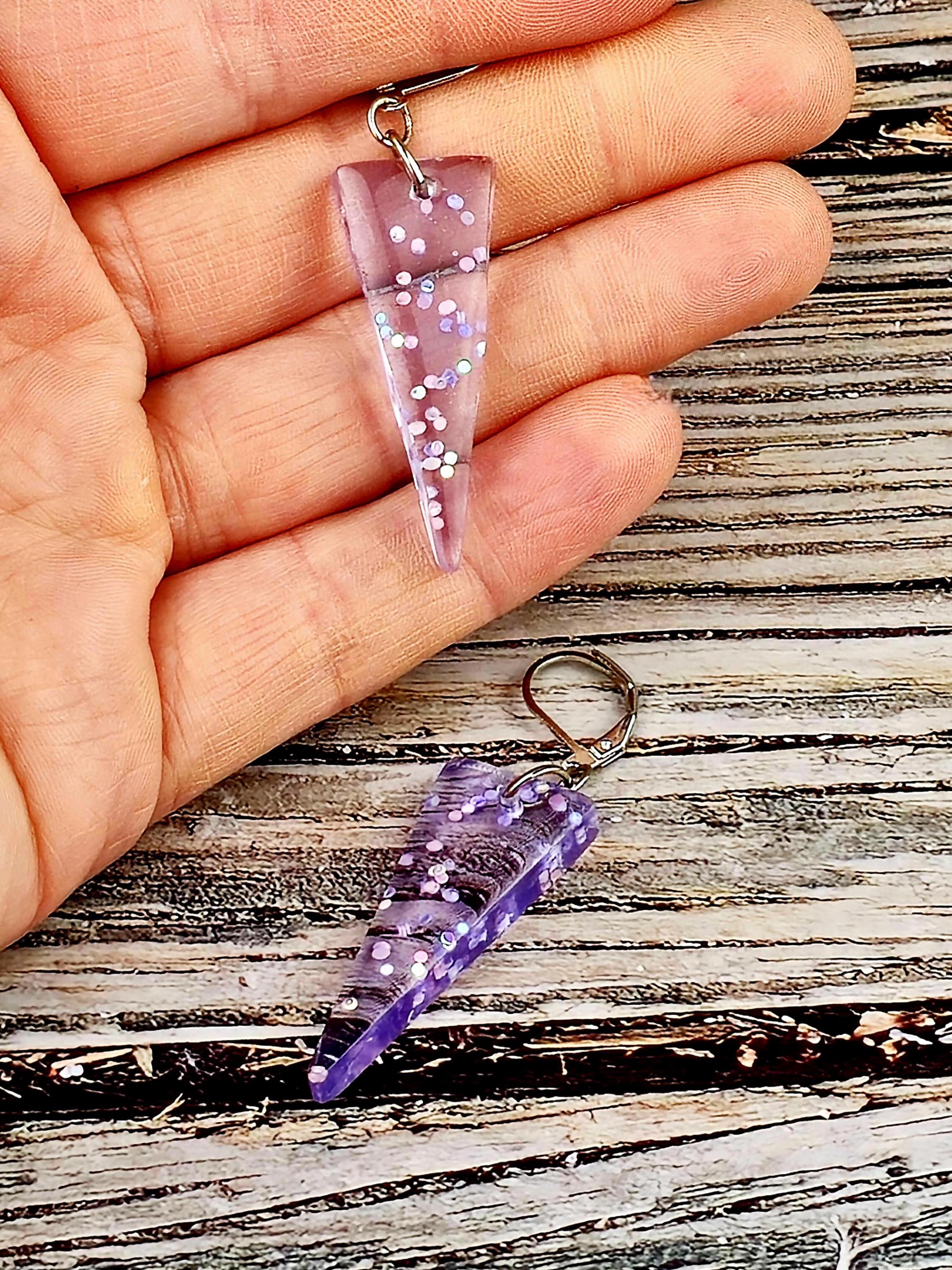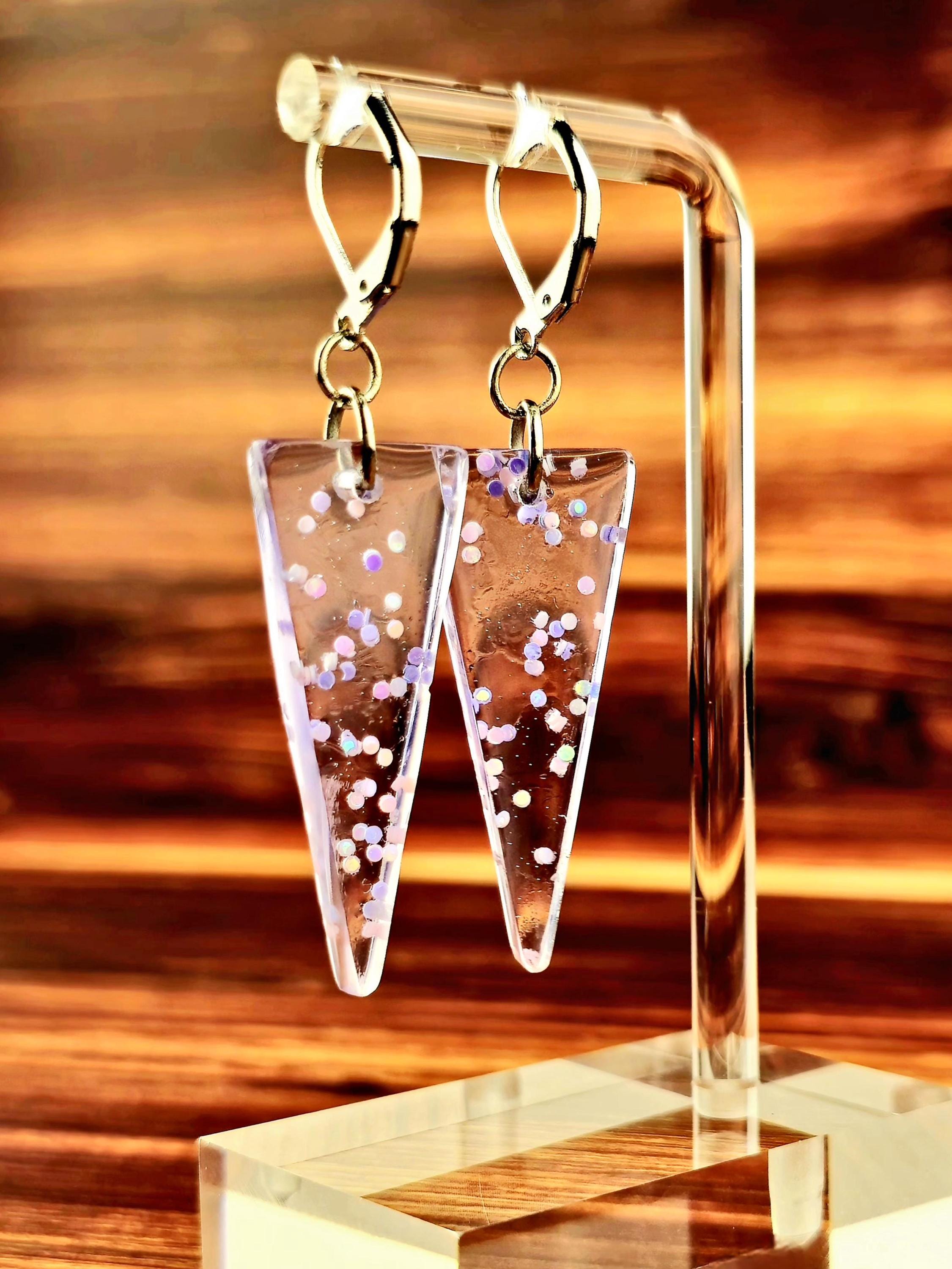 Add a touch of elegance to your outfit with these stunning silver 304 stainless steel French lever-back earrings. The 10x16mm size is perfect for everyday wear, while the premium epoxy resin pendant adds a unique and eye-catching element. The upside down triangle shape features a beautiful light purple translucent color, with pink and purple confetti dots scattered throughout for a playful touch.