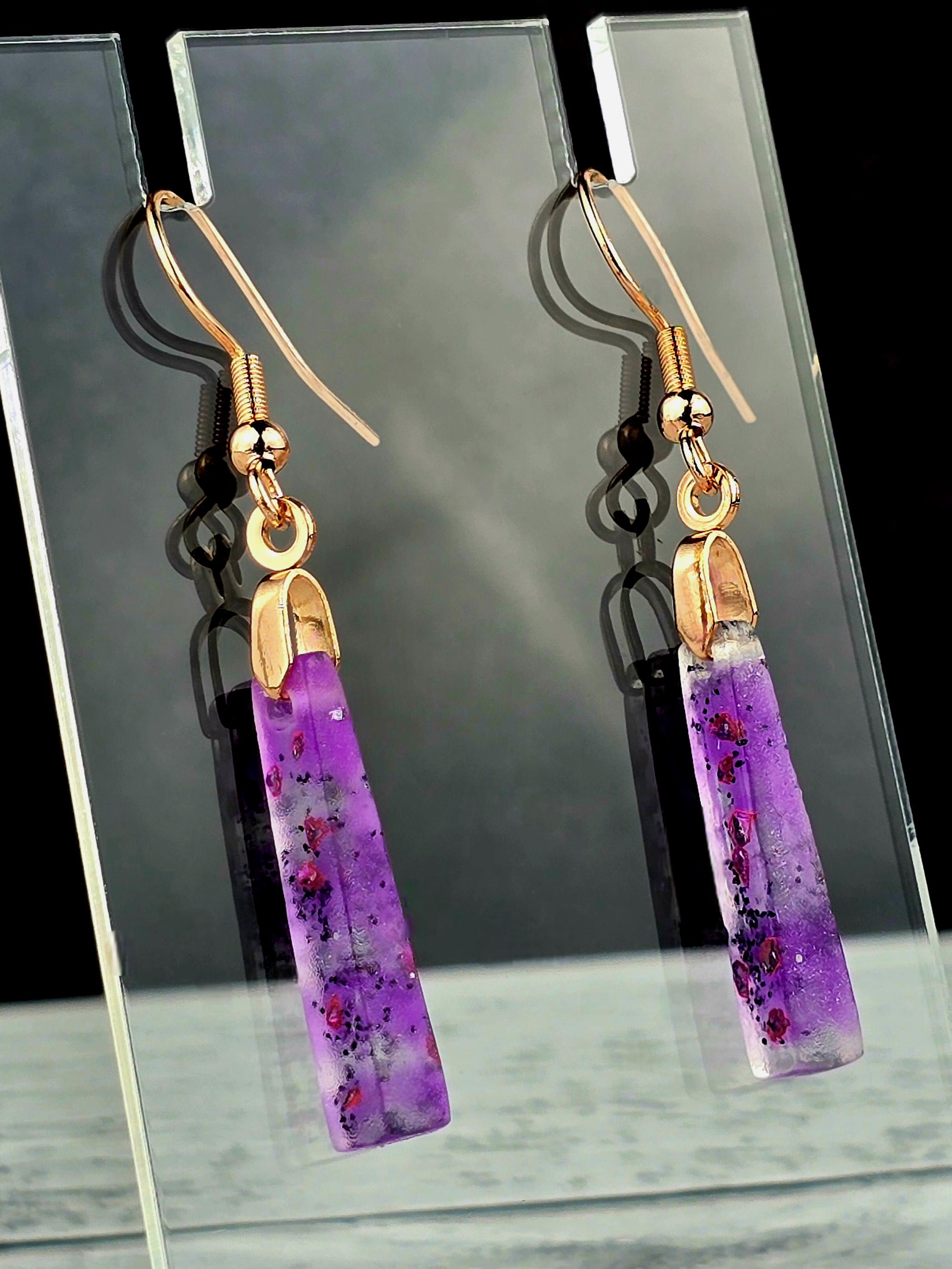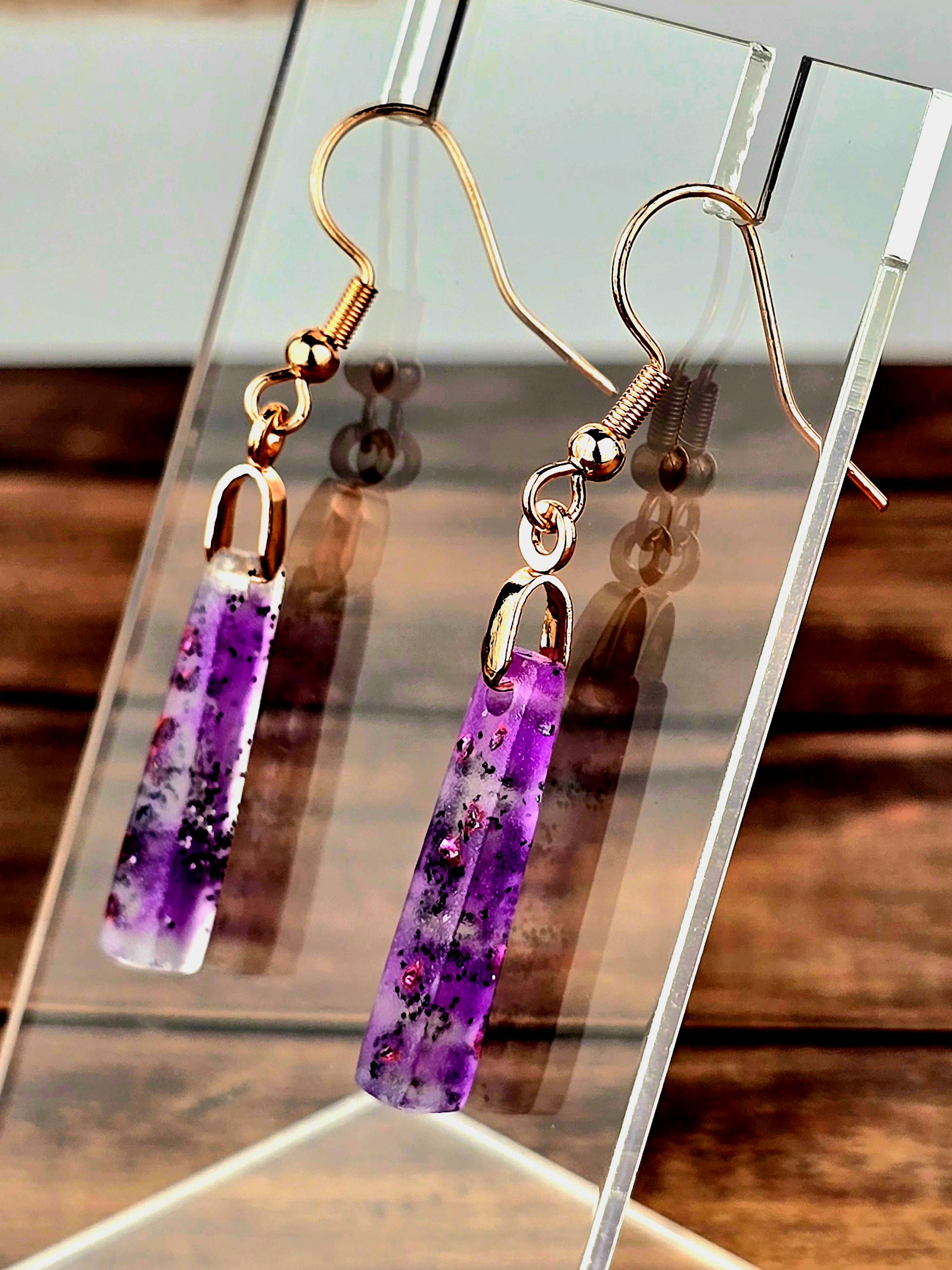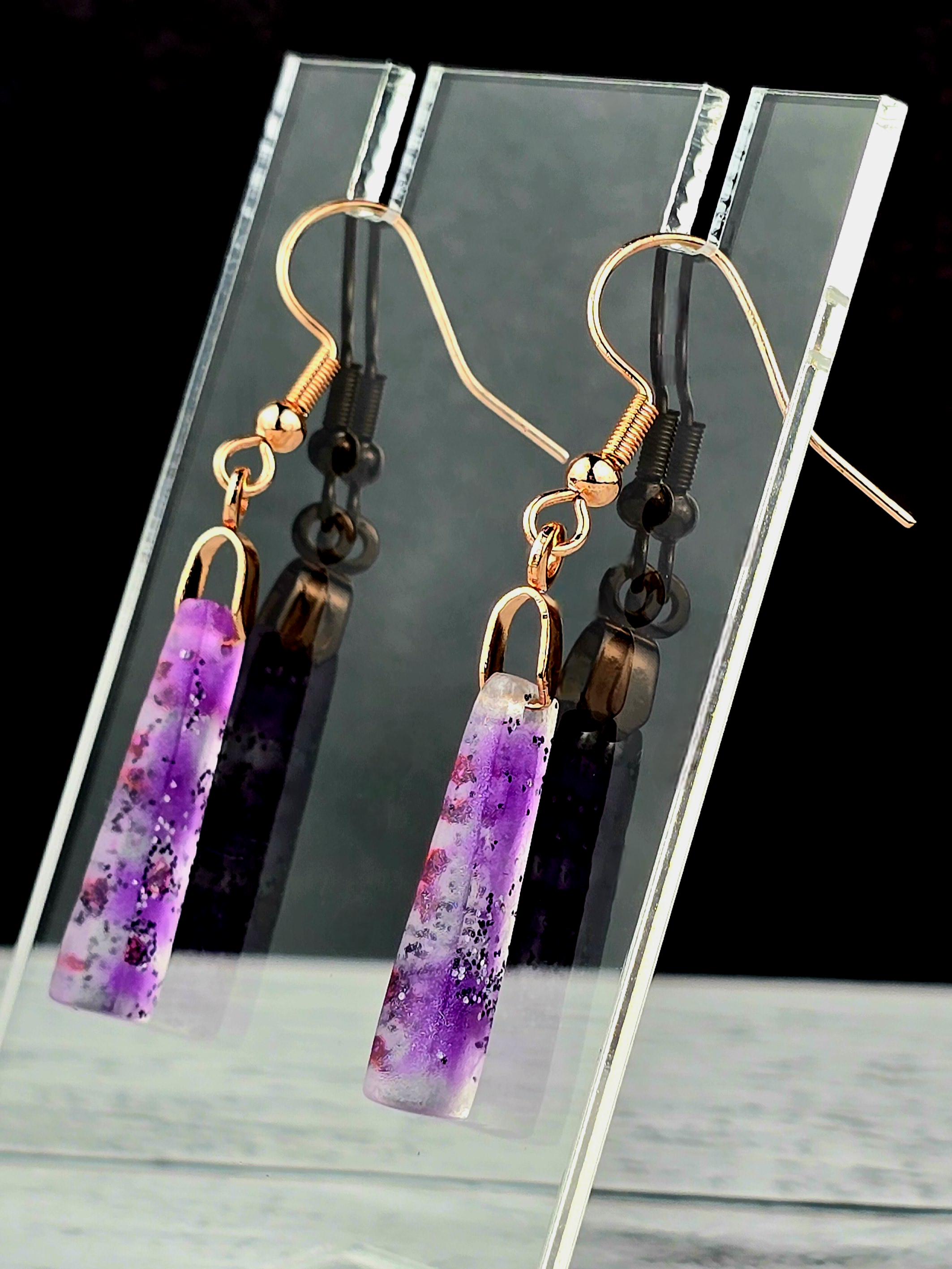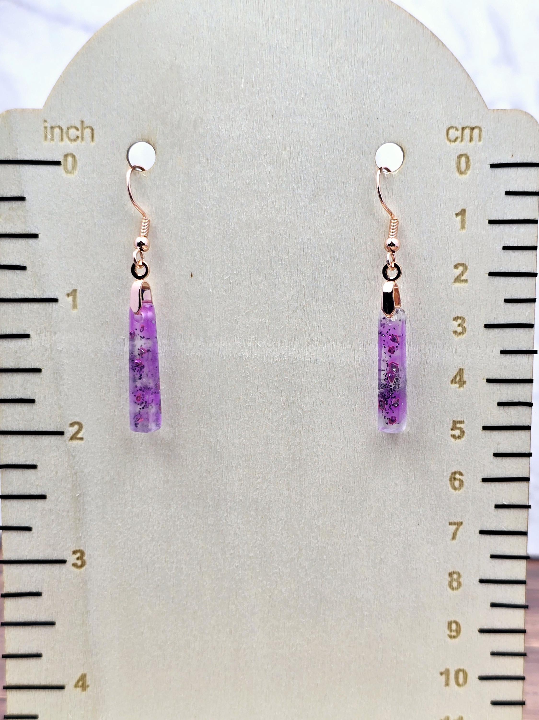 Add a touch of elegance and sophistication to your outfit with these stunning rose gold colored stainless steel earrings. The small elongated rectangle shape resin pendant features a beautiful combination of purple and white layered together with glitter, creating a unique and eye-catching design.