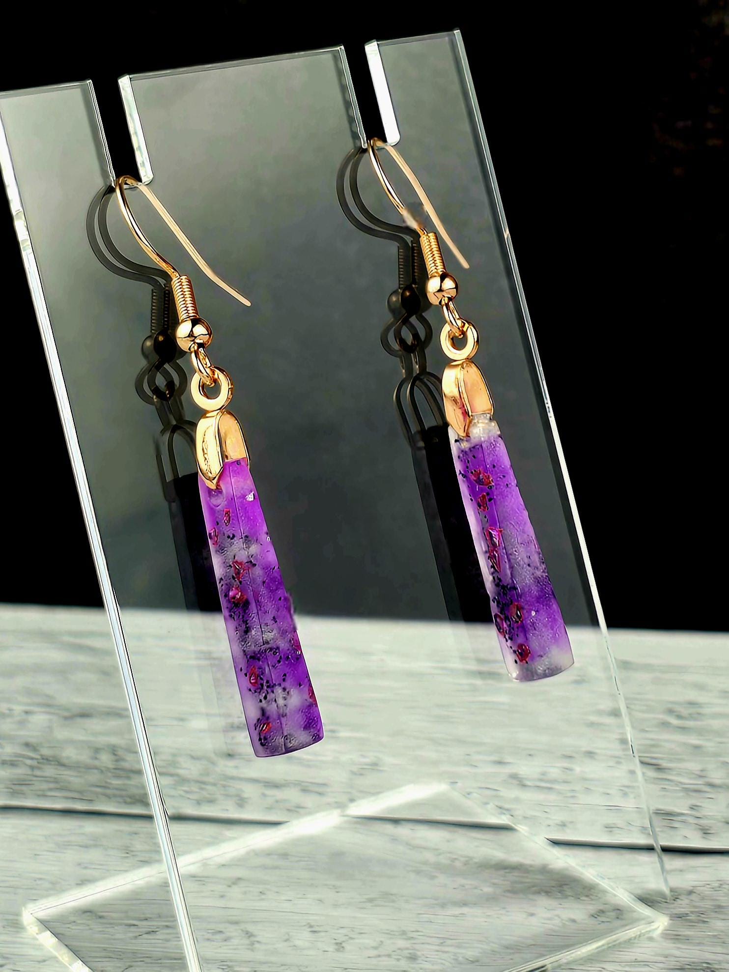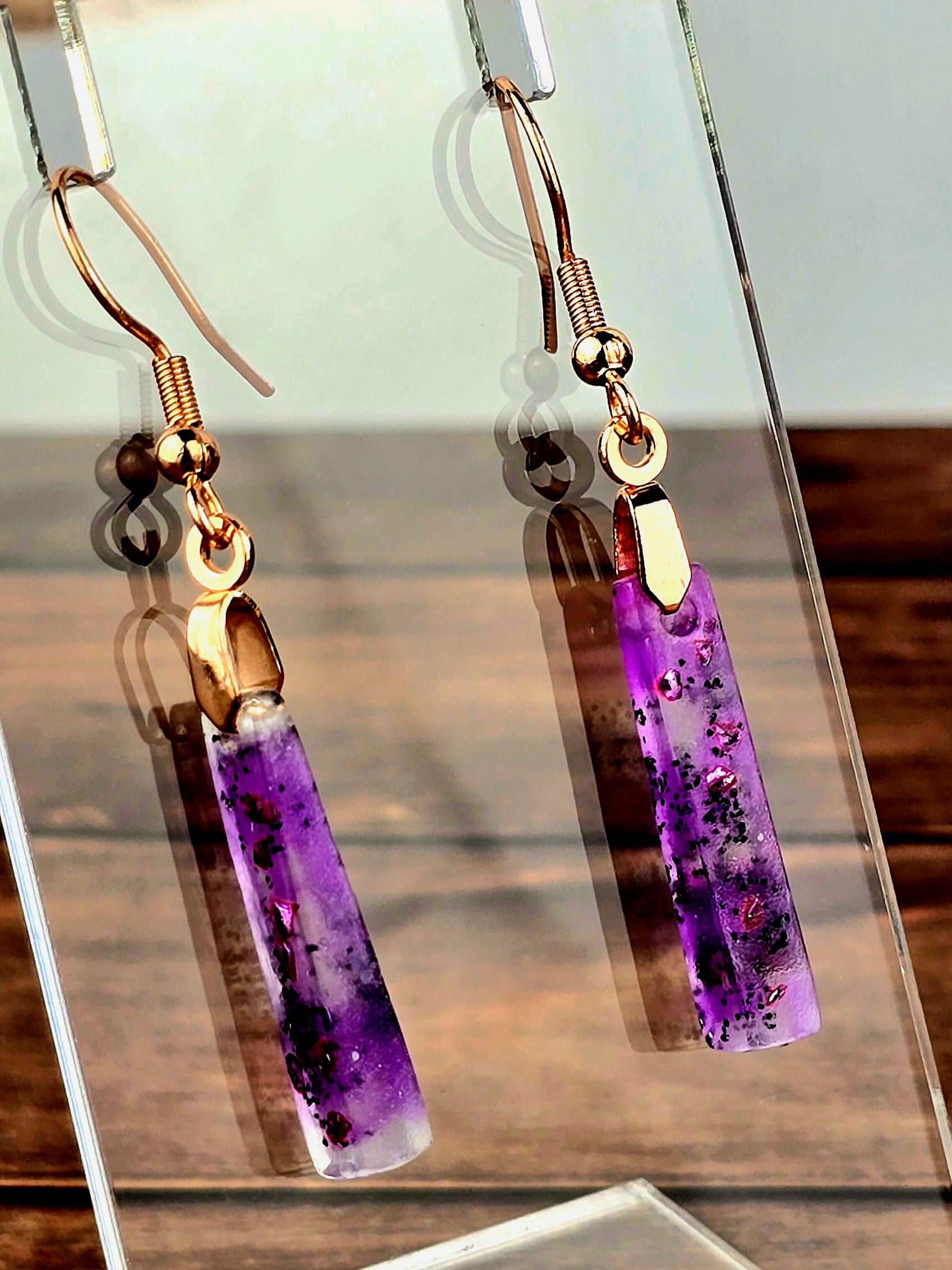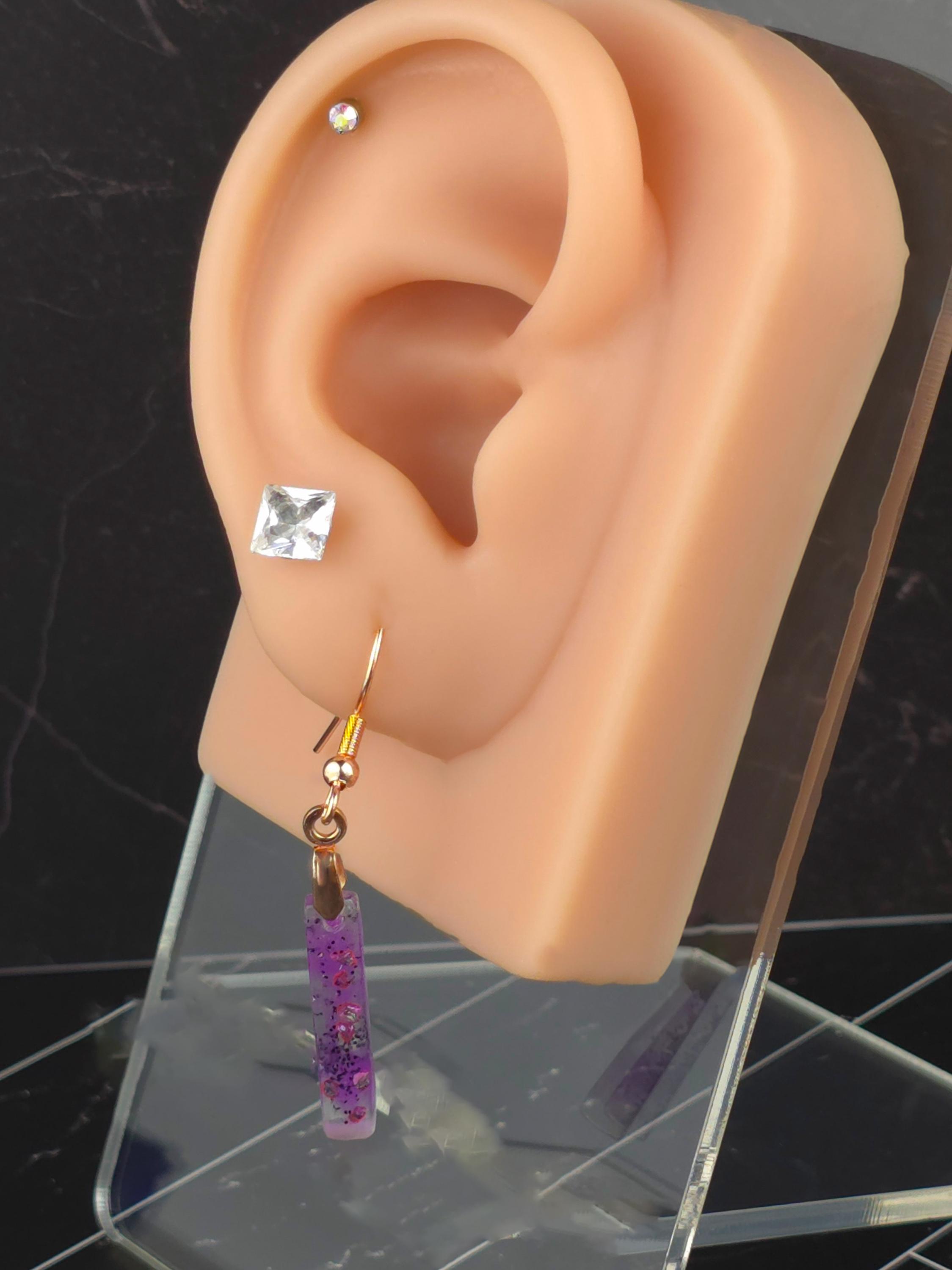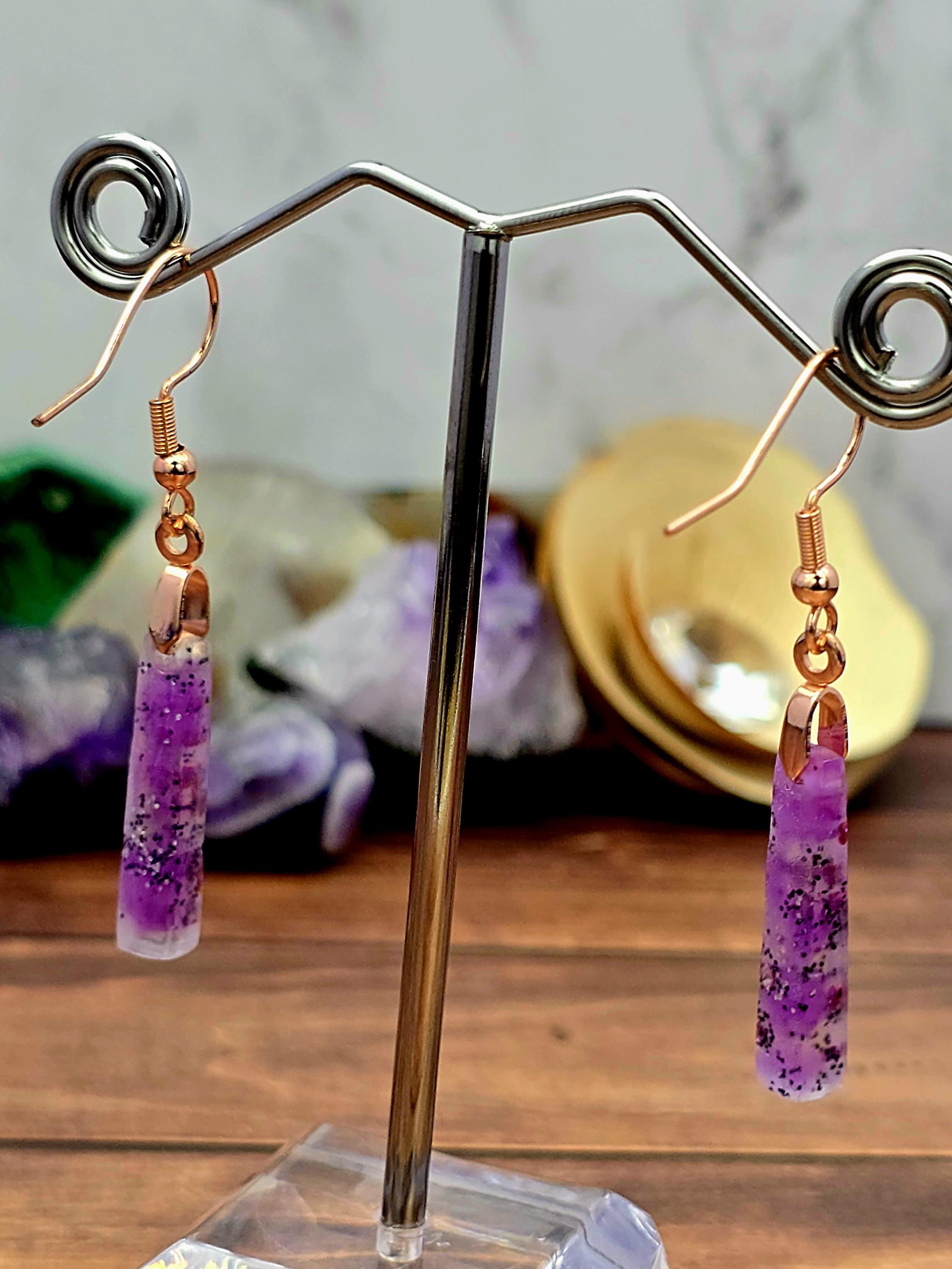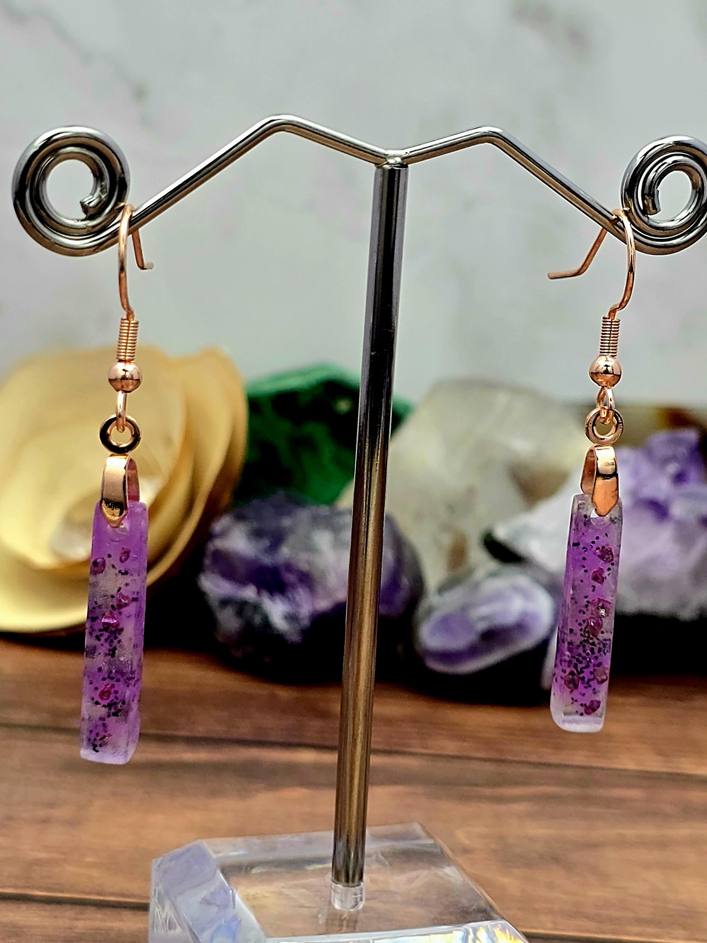 Add a touch of elegance and sophistication to your outfit with these stunning rose gold colored stainless steel earrings. The small elongated rectangle shape resin pendant features a beautiful combination of purple and white layered together with glitter, creating a unique and eye-catching design.