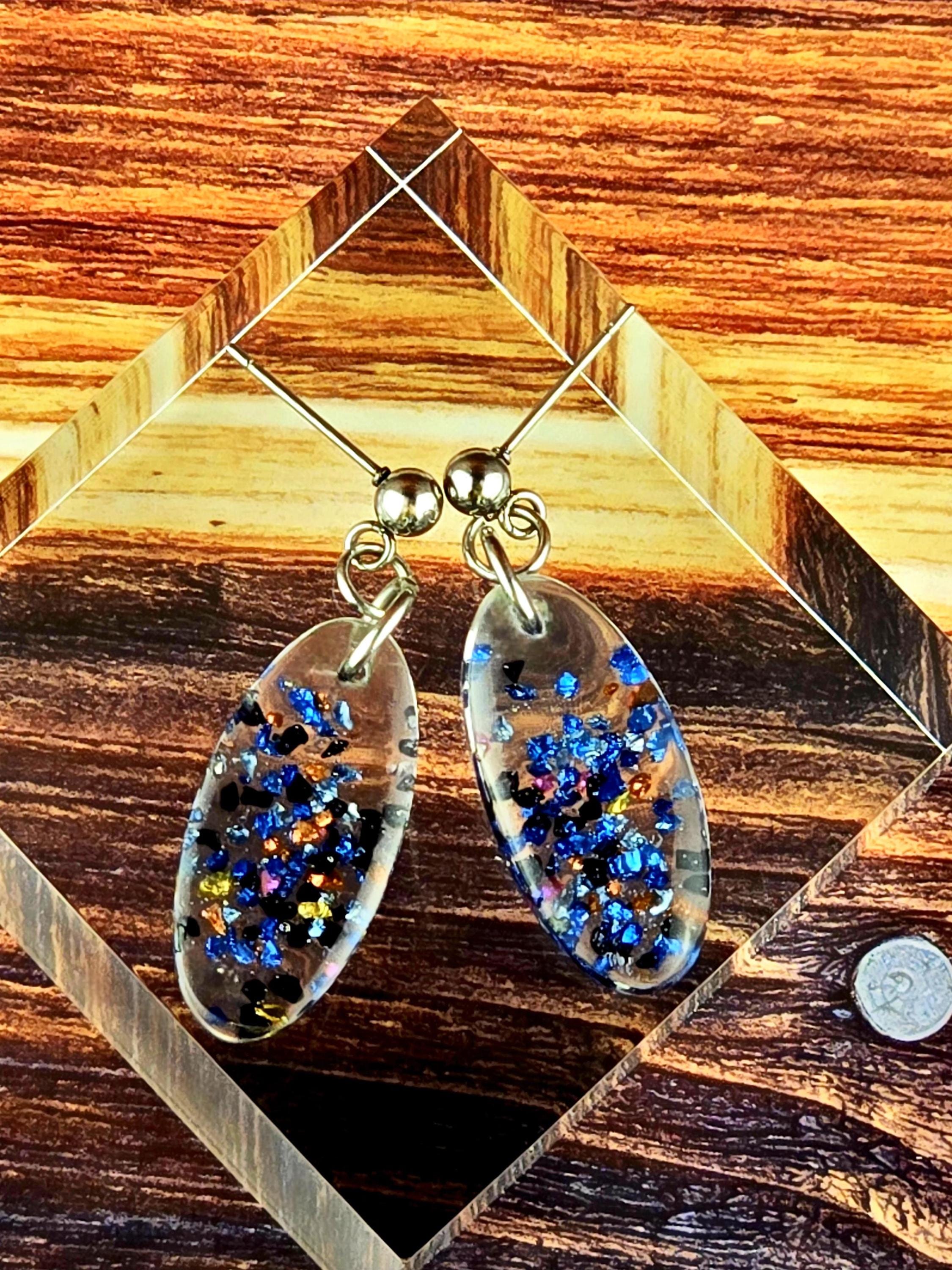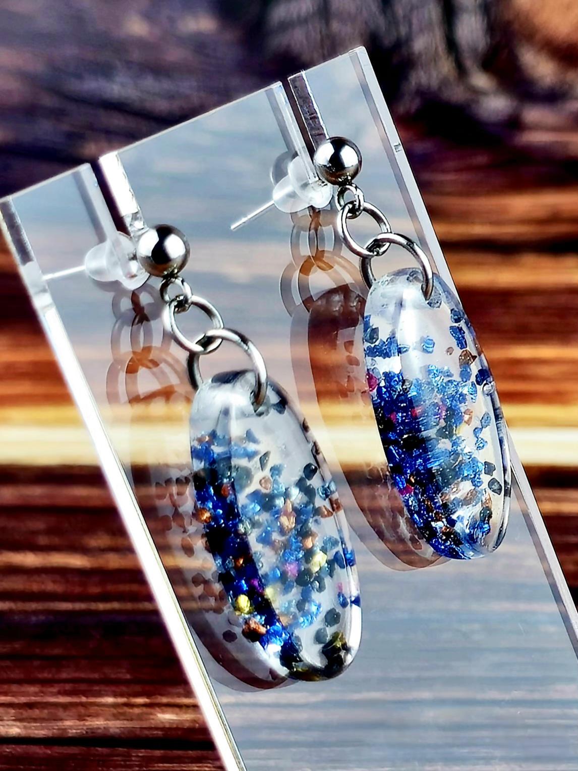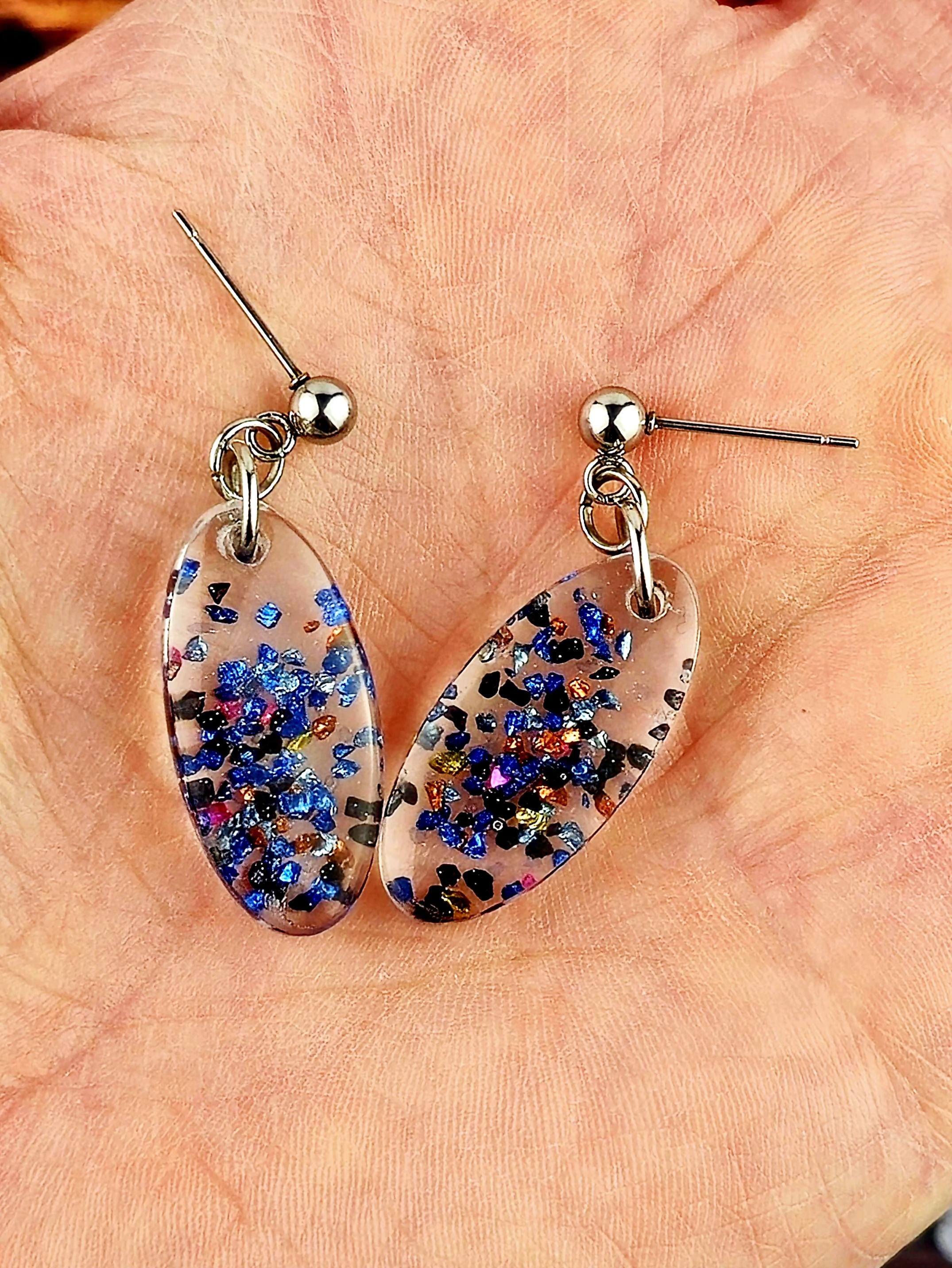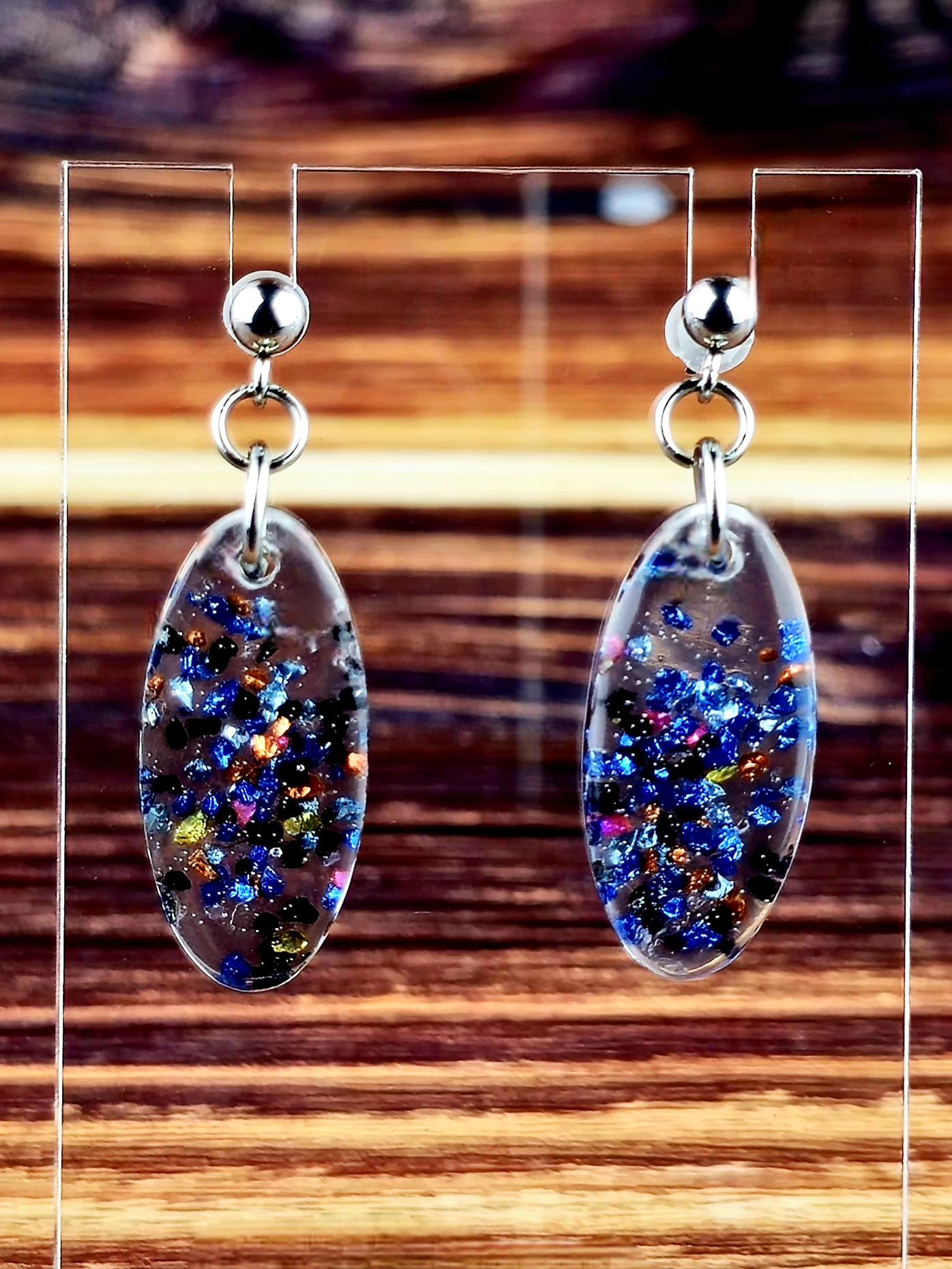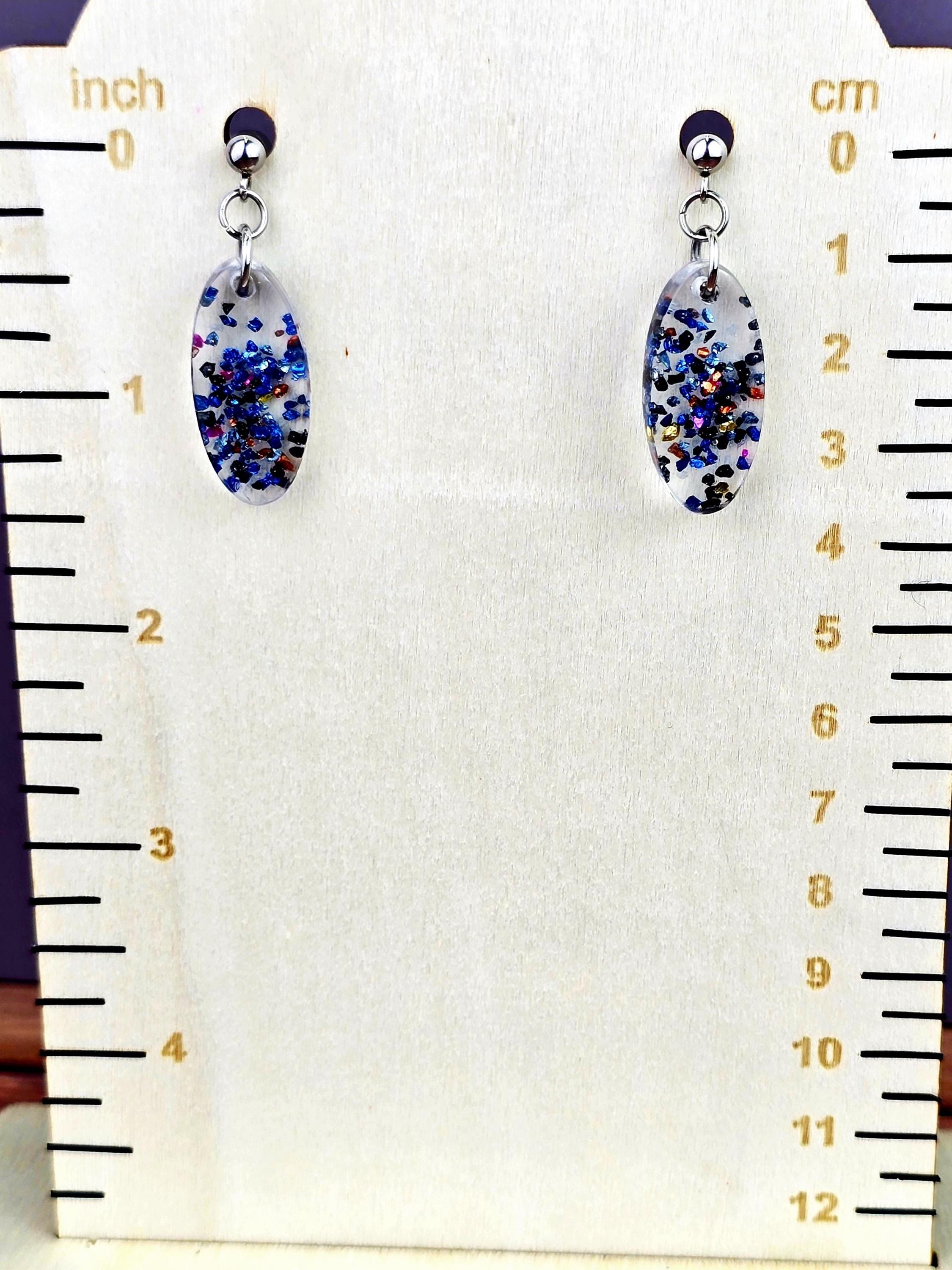 Add a touch of elegance and sparkle to your outfit with these stunning stainless steel ball post earrings. The earrings feature a unique oval epoxy resin pendant that is clear with a mesmerizing combination of blue and black glitter and rock flakes.