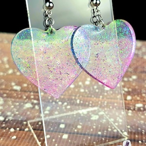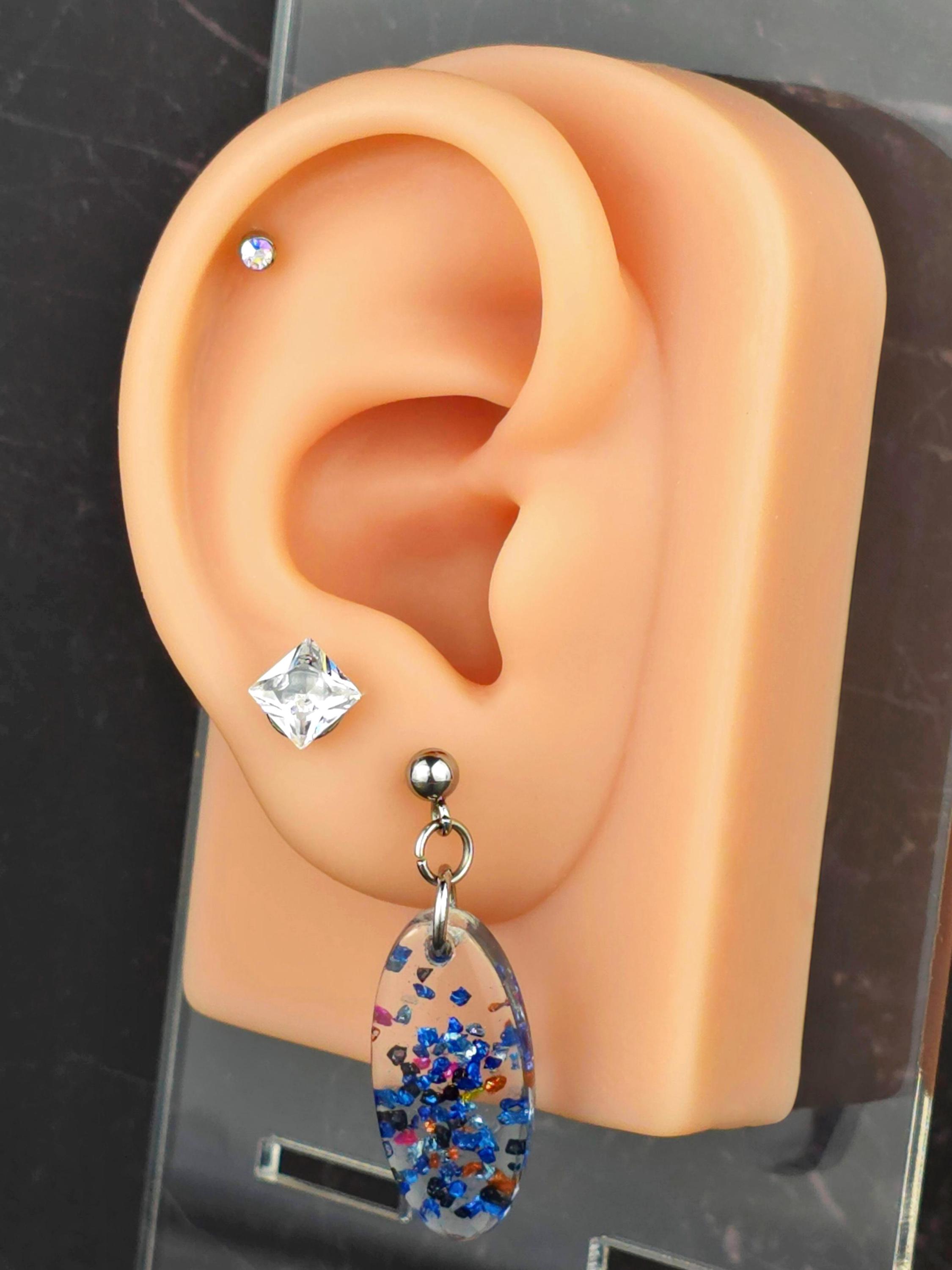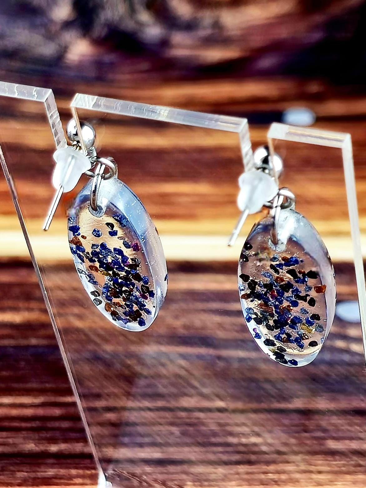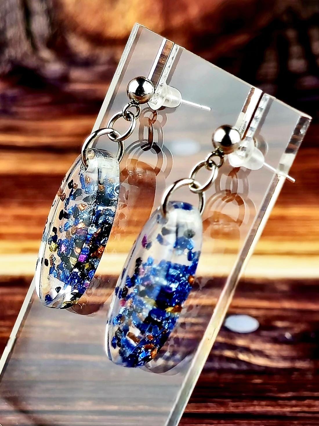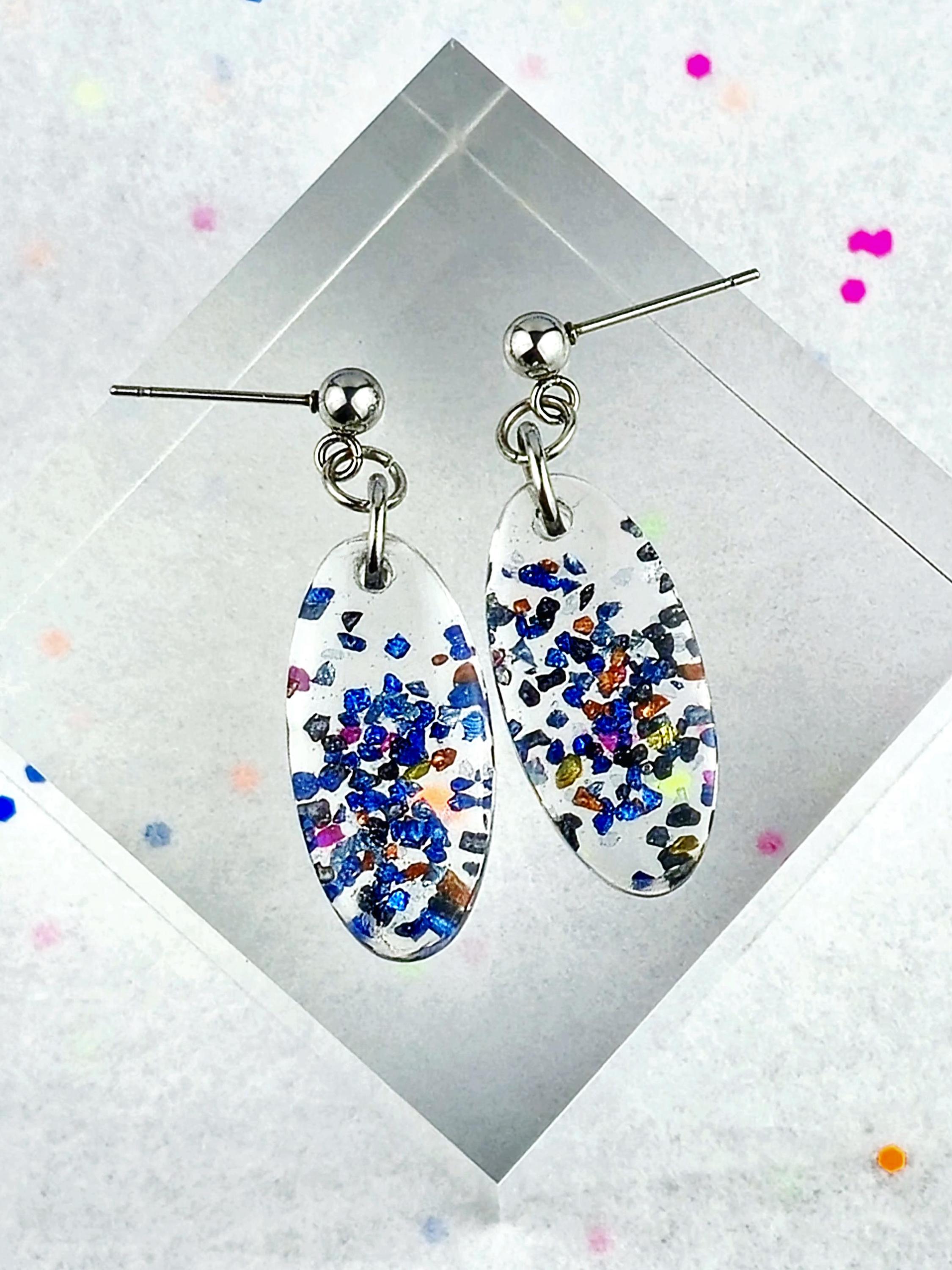 Add a touch of elegance and sparkle to your outfit with these stunning stainless steel ball post earrings. The earrings feature a unique oval epoxy resin pendant that is clear with a mesmerizing combination of blue and black glitter and rock flakes.