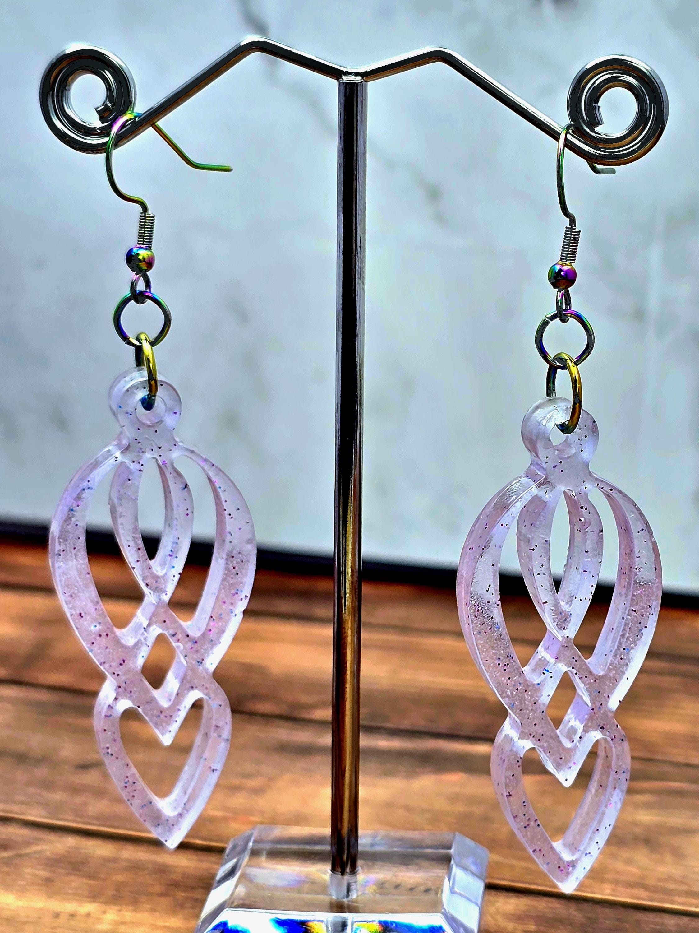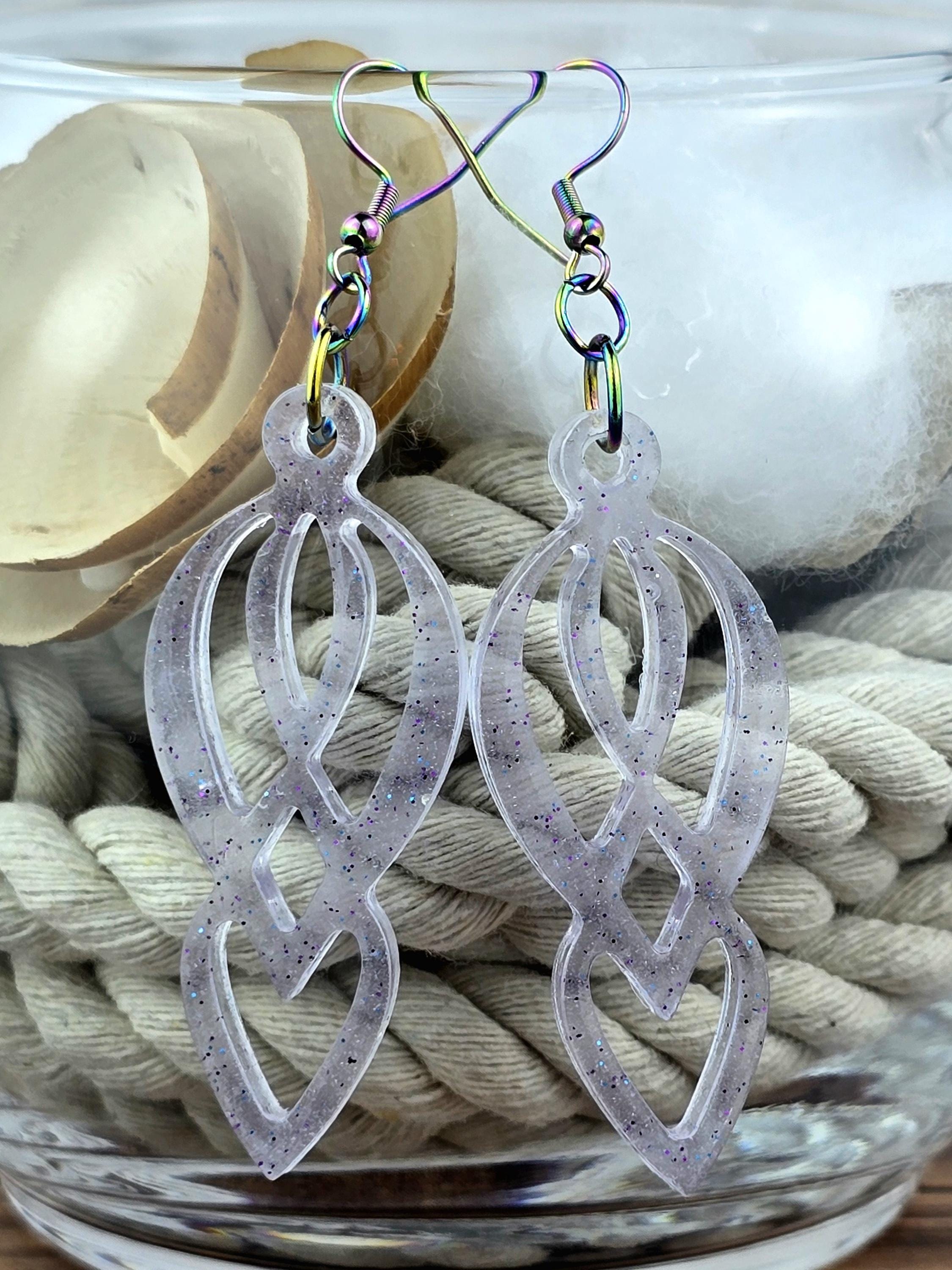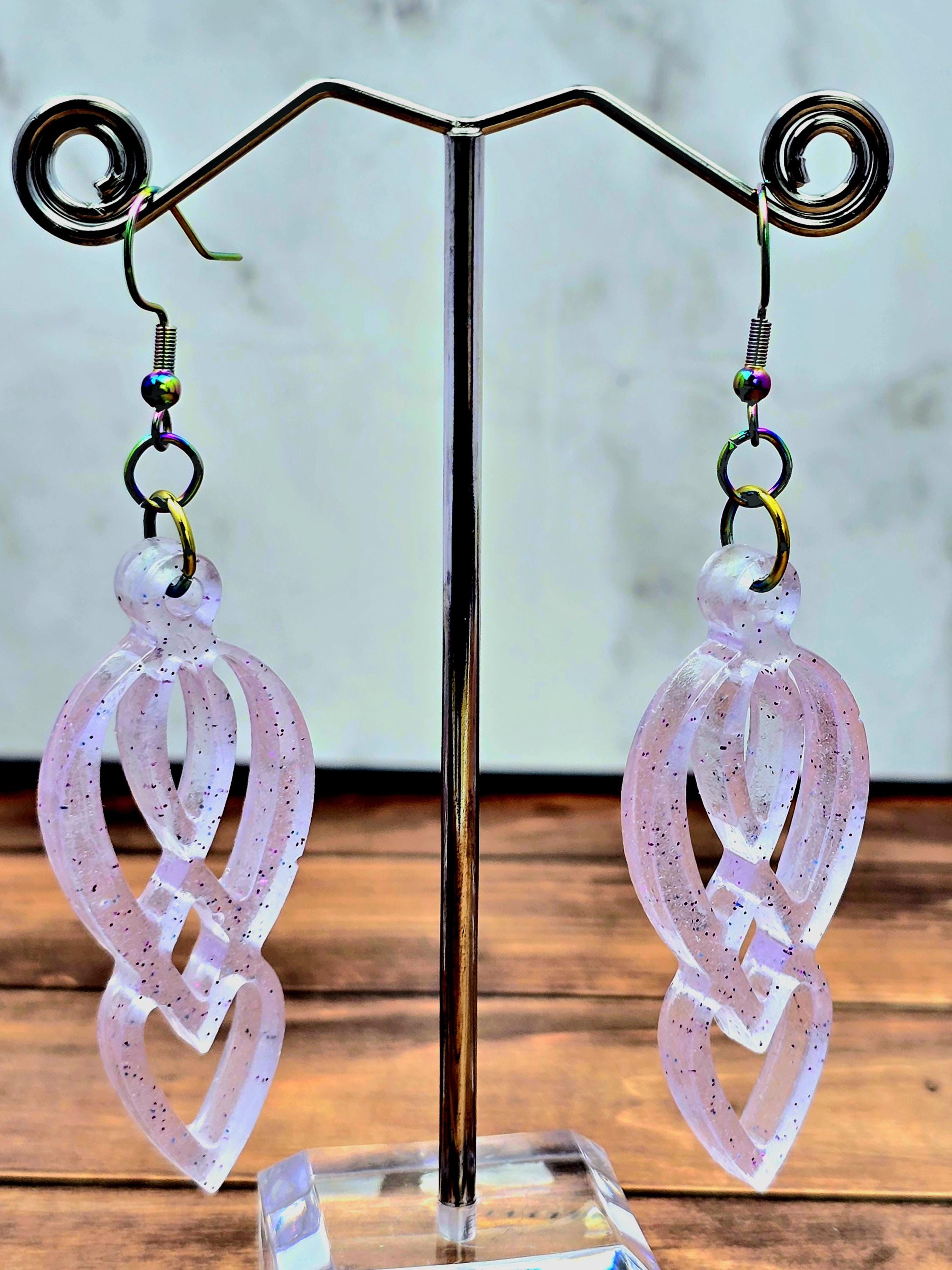 Add elegance and uniqueness to your outfit with these stunning Epoxy Resin purplish clear pendant earrings. The clear/light purplish color with purple glitter accents gives these earrings a mesmerizing look. The pendant has a one-of-a-kind eight-like shape that is truly beautiful.