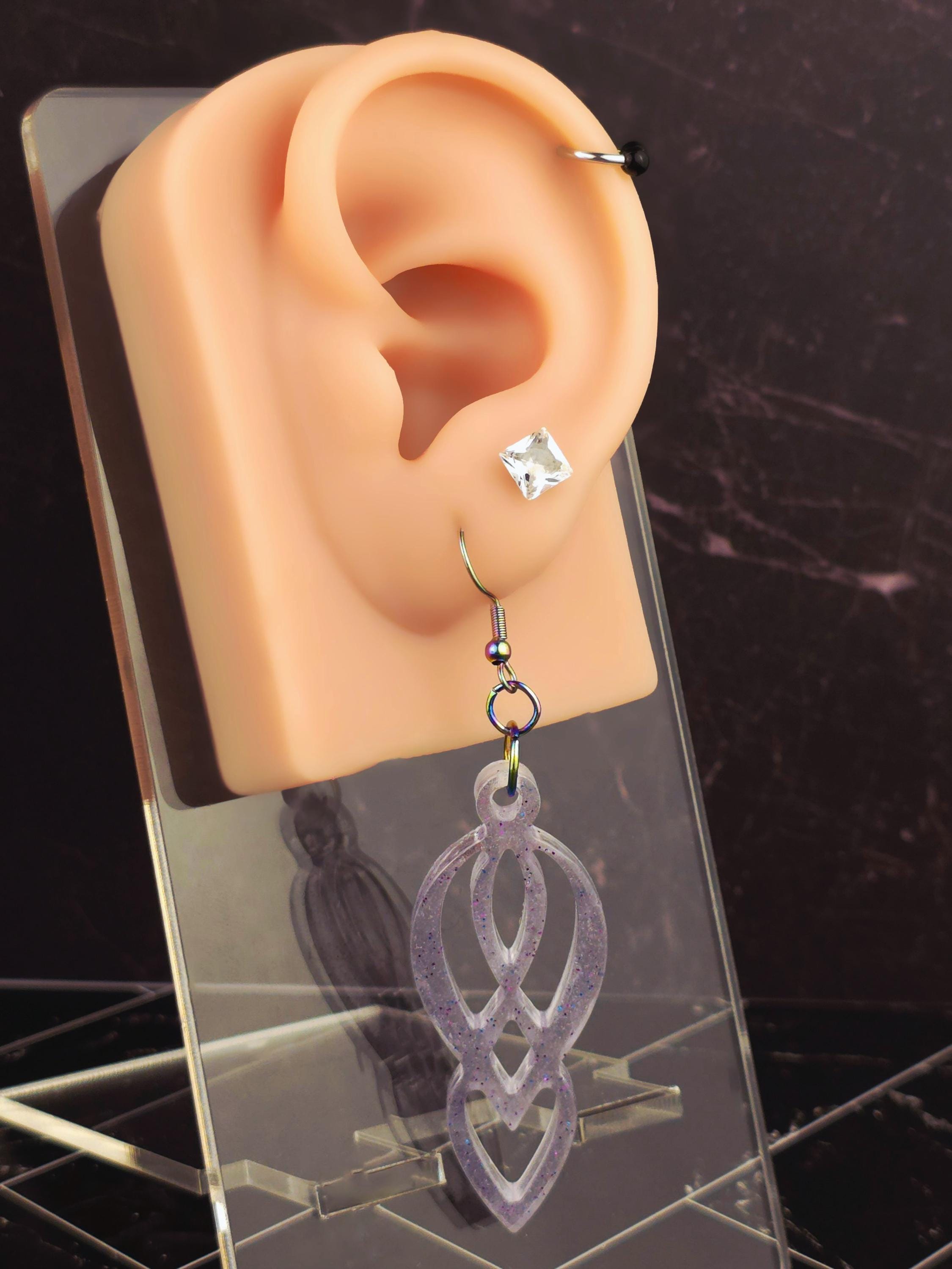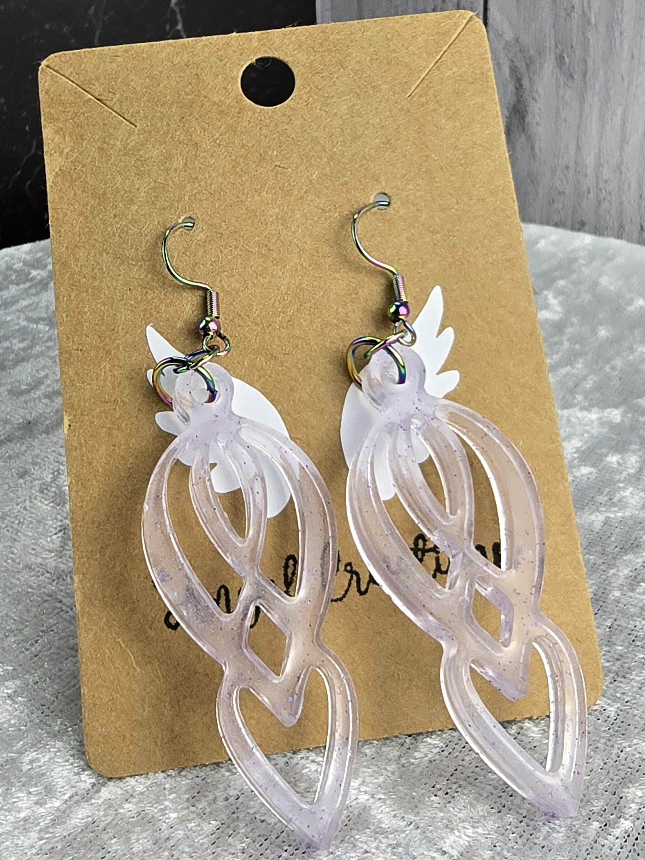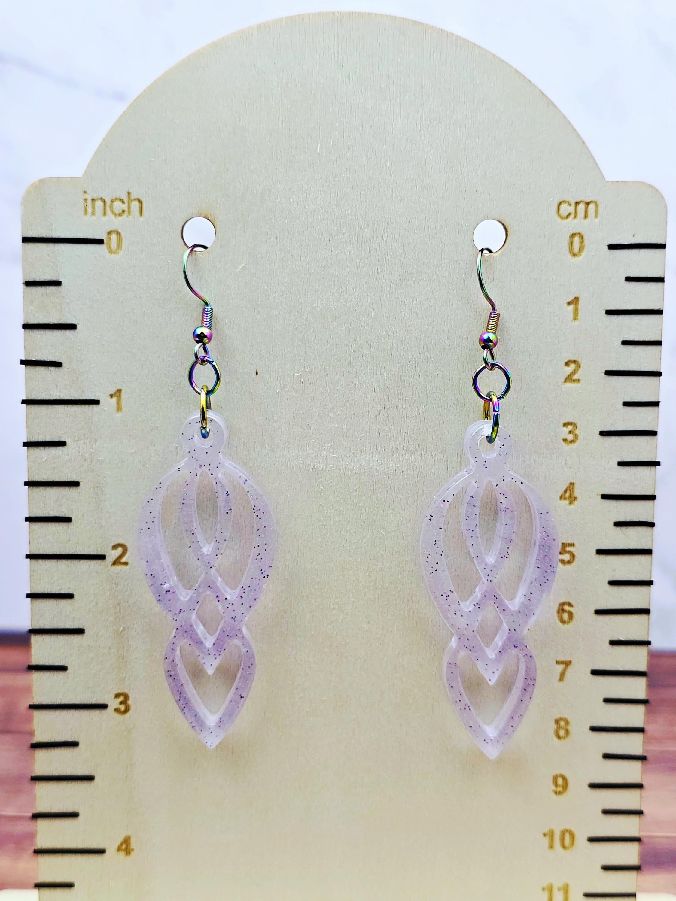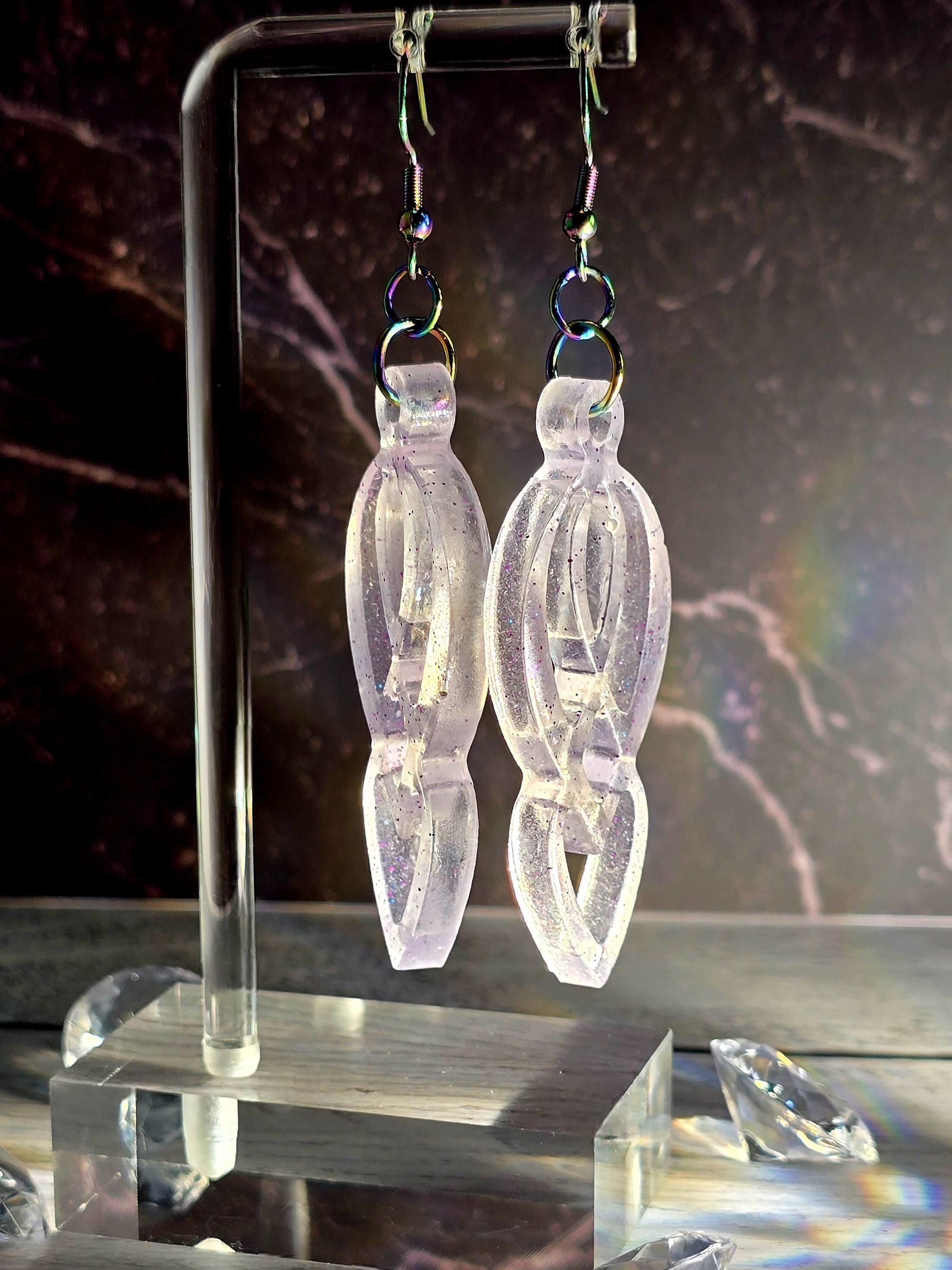 Add elegance and uniqueness to your outfit with these stunning Epoxy Resin purplish clear pendant earrings. The clear/light purplish color with purple glitter accents gives these earrings a mesmerizing look. The pendant has a one-of-a-kind eight-like shape that is truly beautiful.