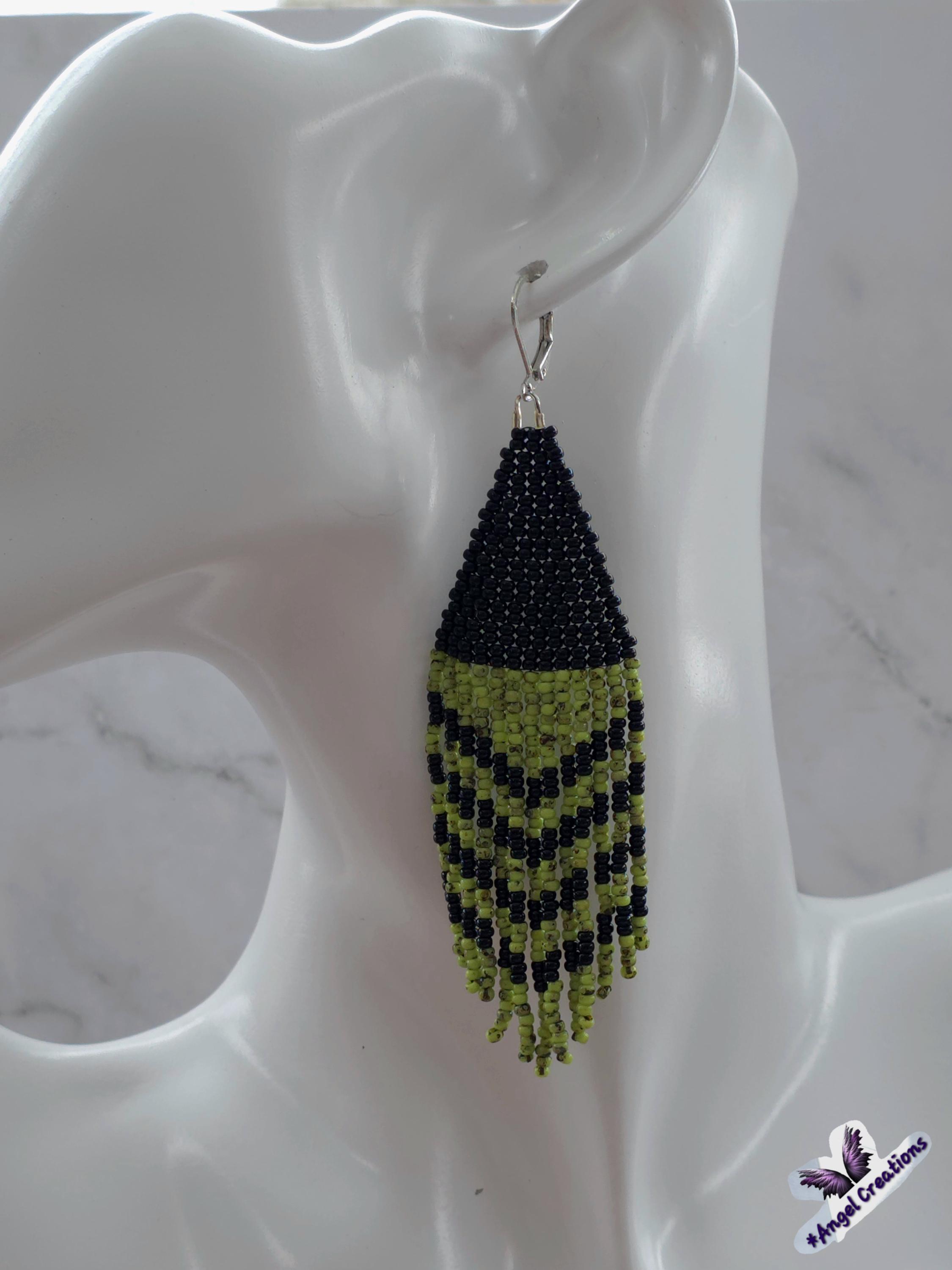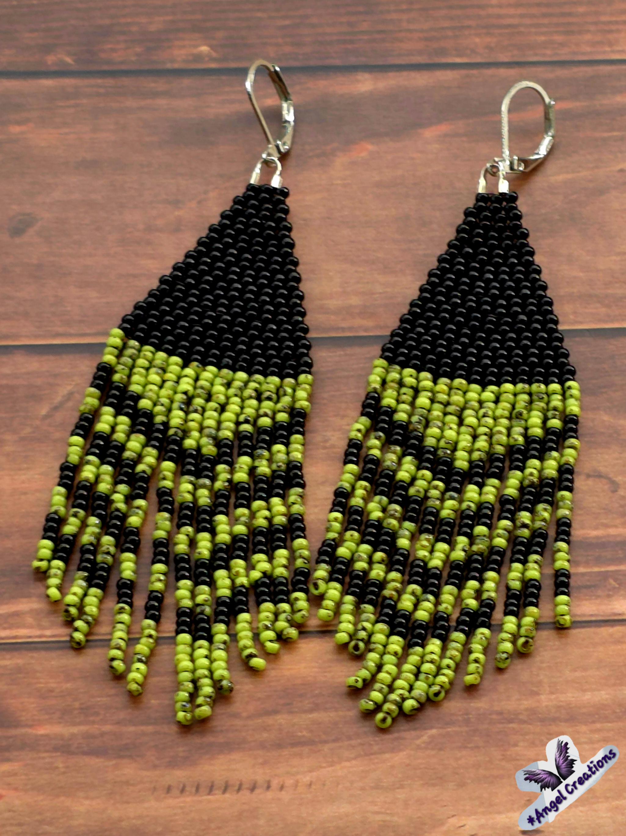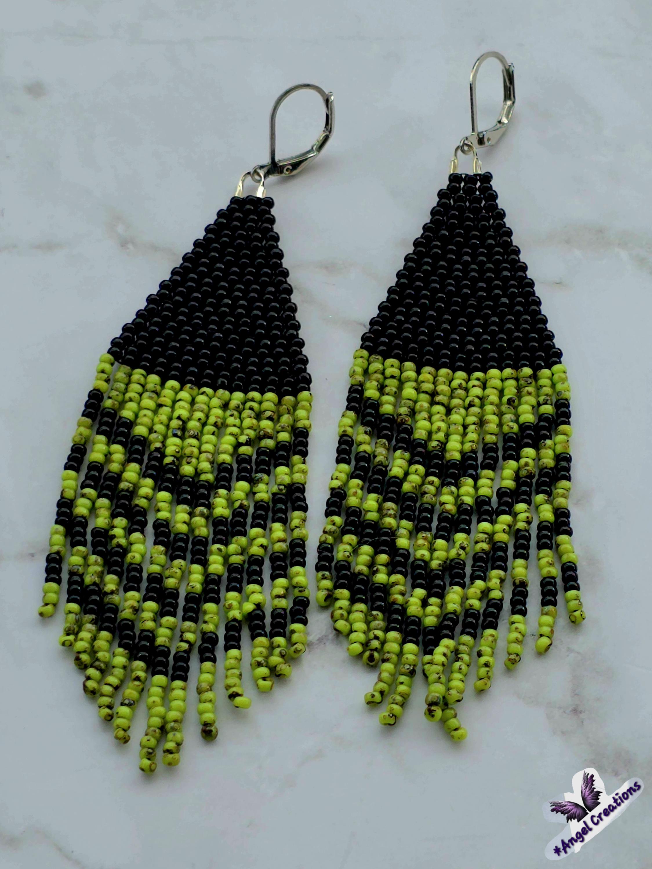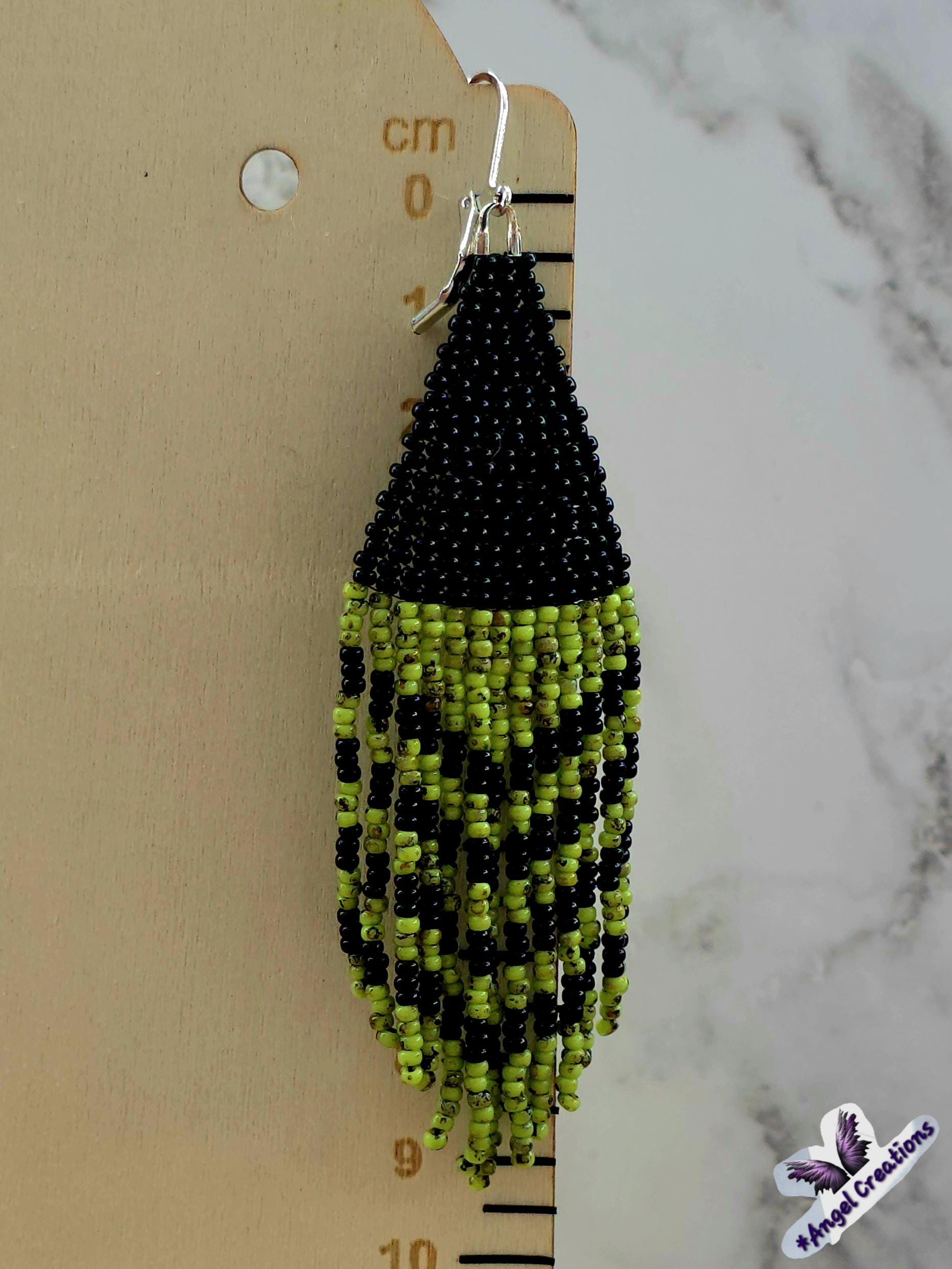 Black & Green Tye-Dye Muyuki Delica Glass Sead Bead Fringe Dangly Earrings