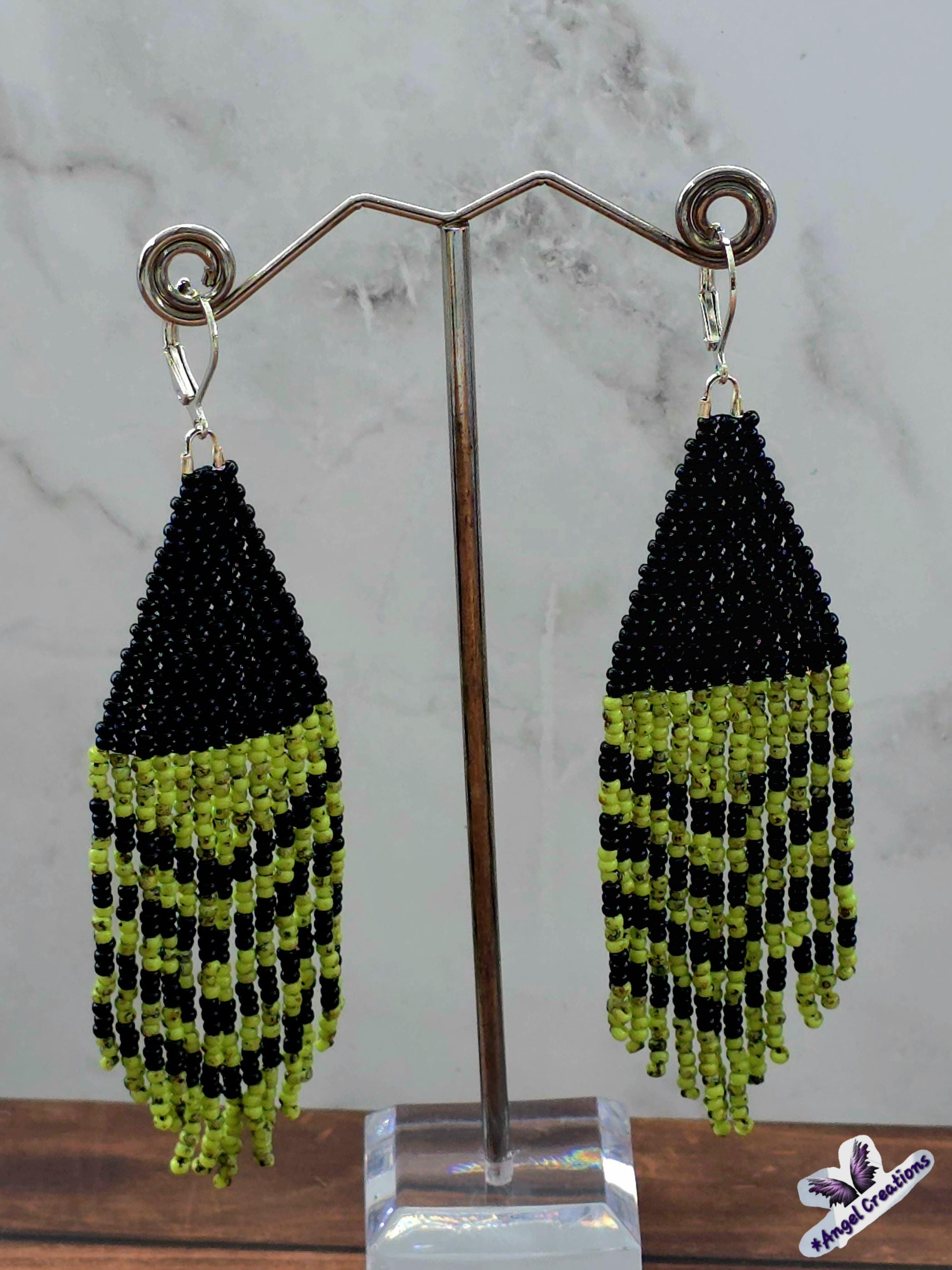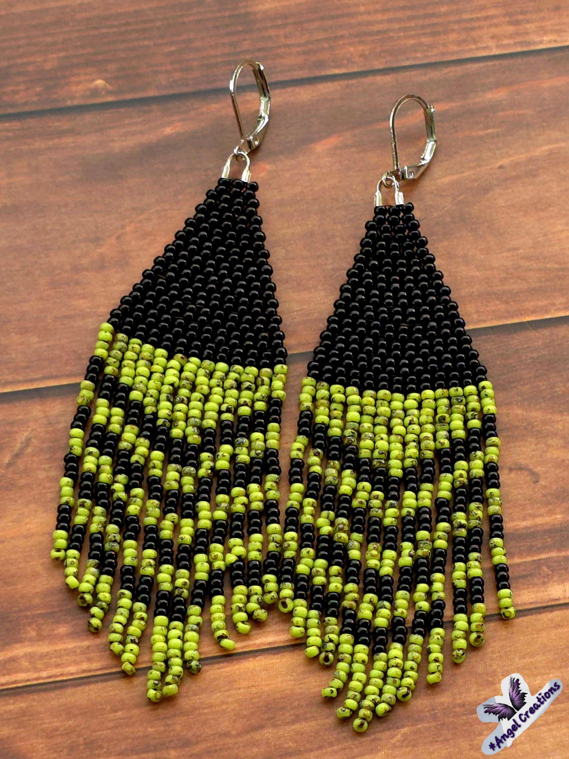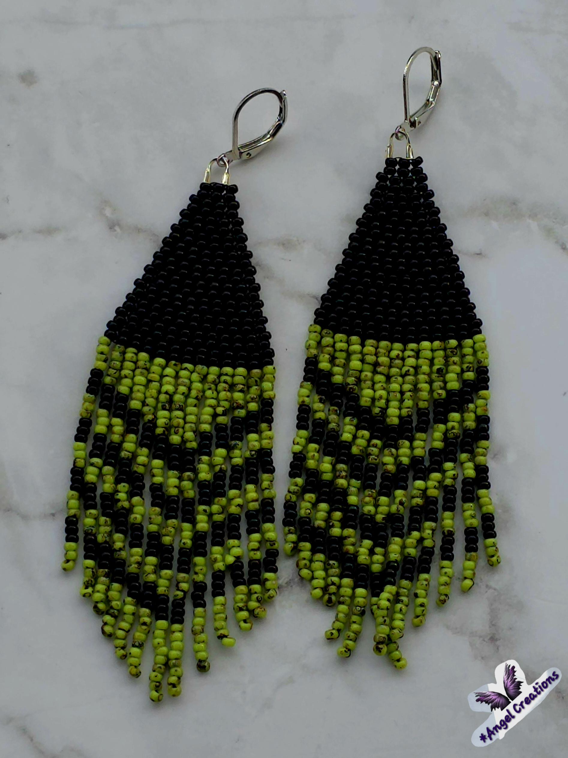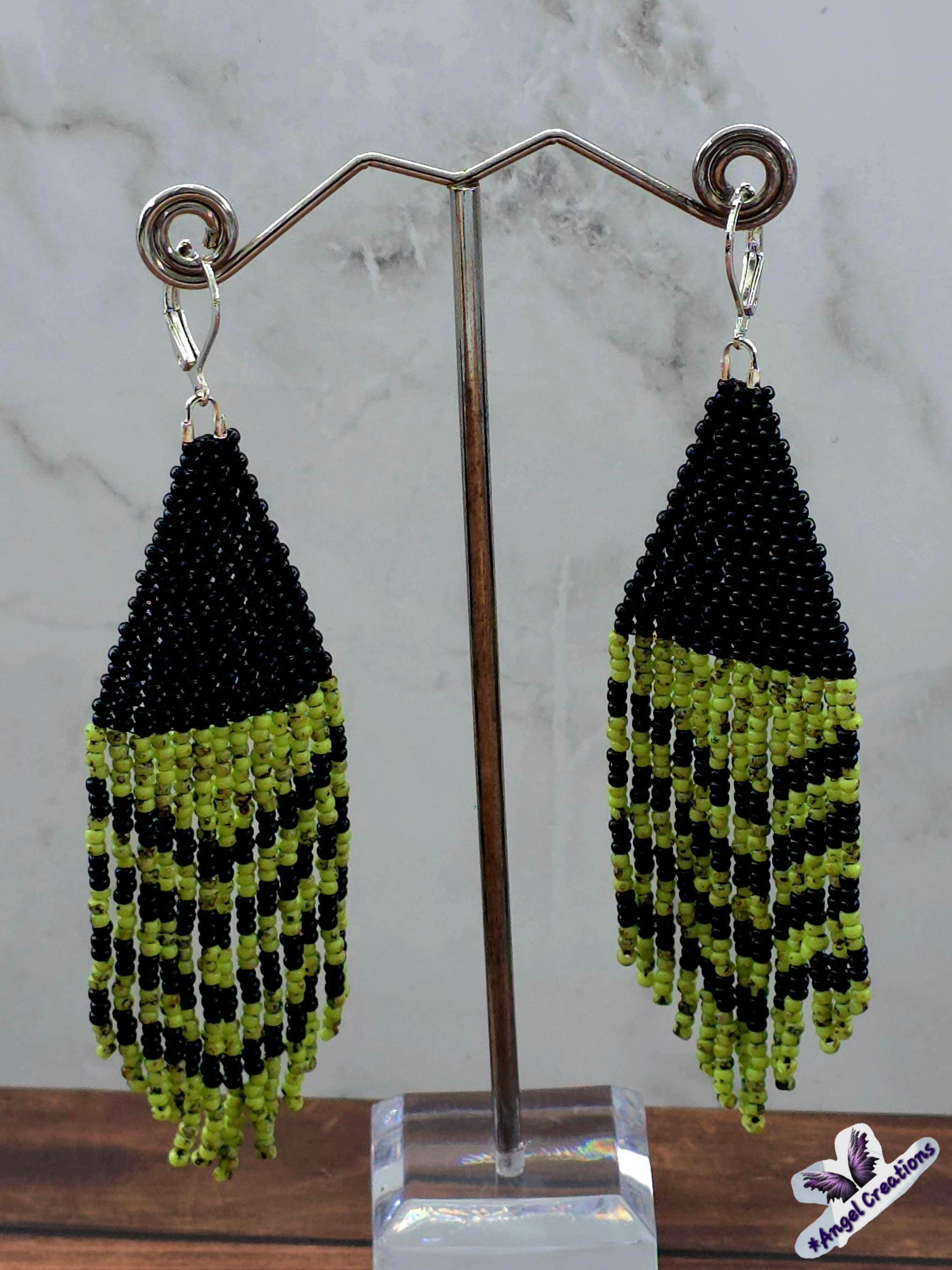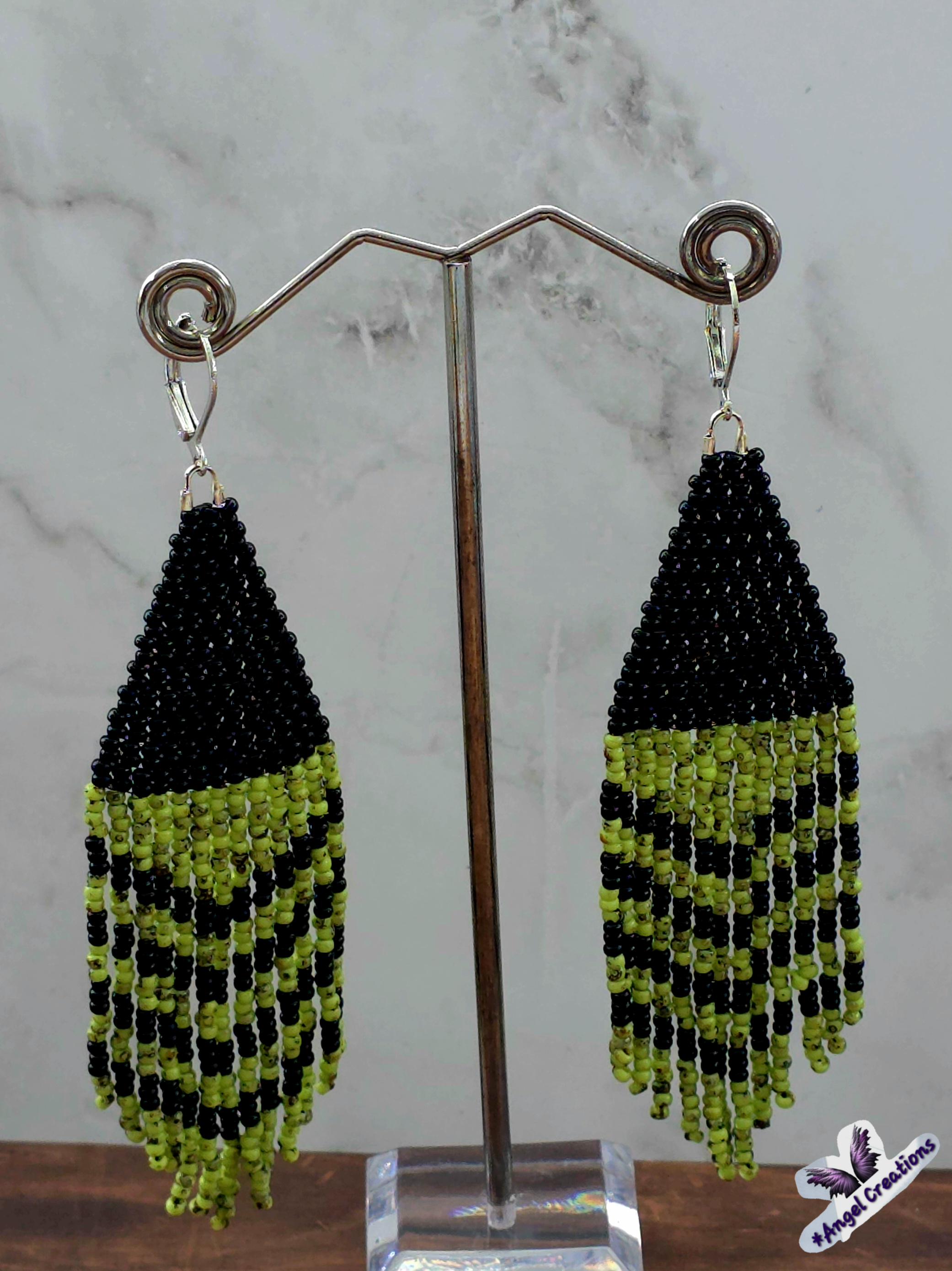 Black & Green Tye-Dye Muyuki Delica Glass Sead Bead Fringe Dangly Earrings